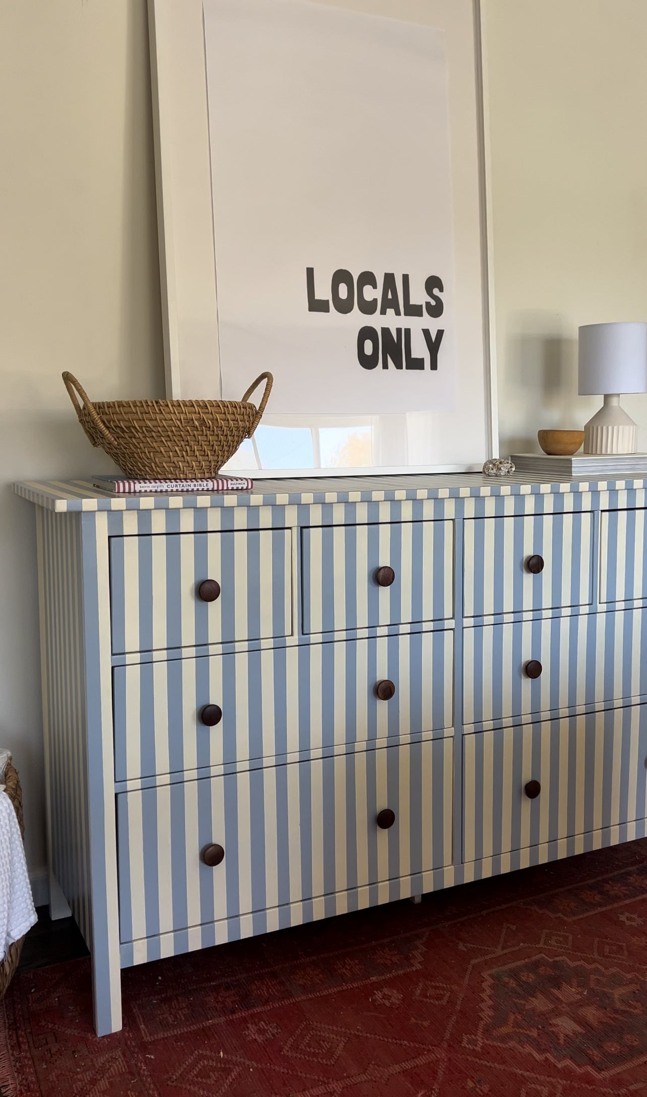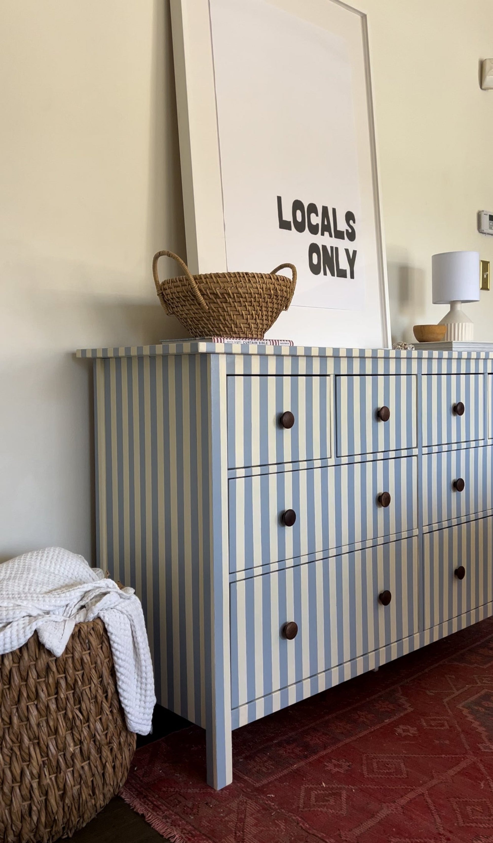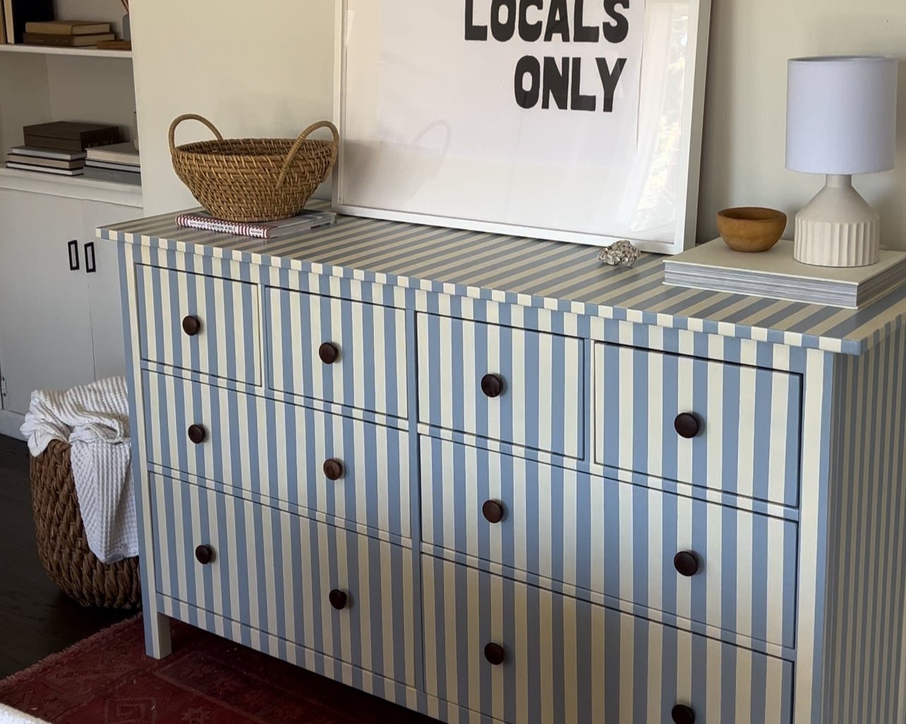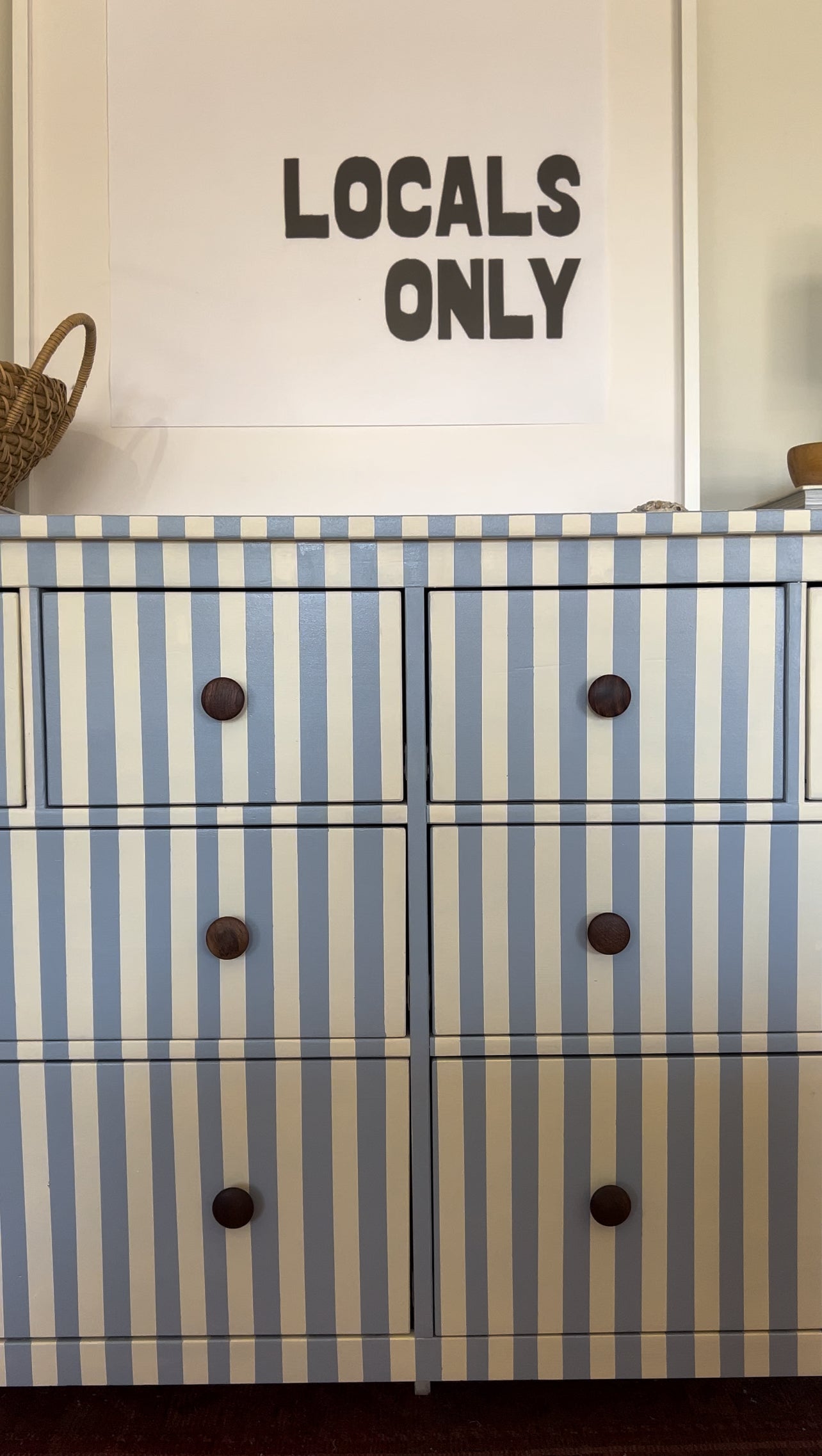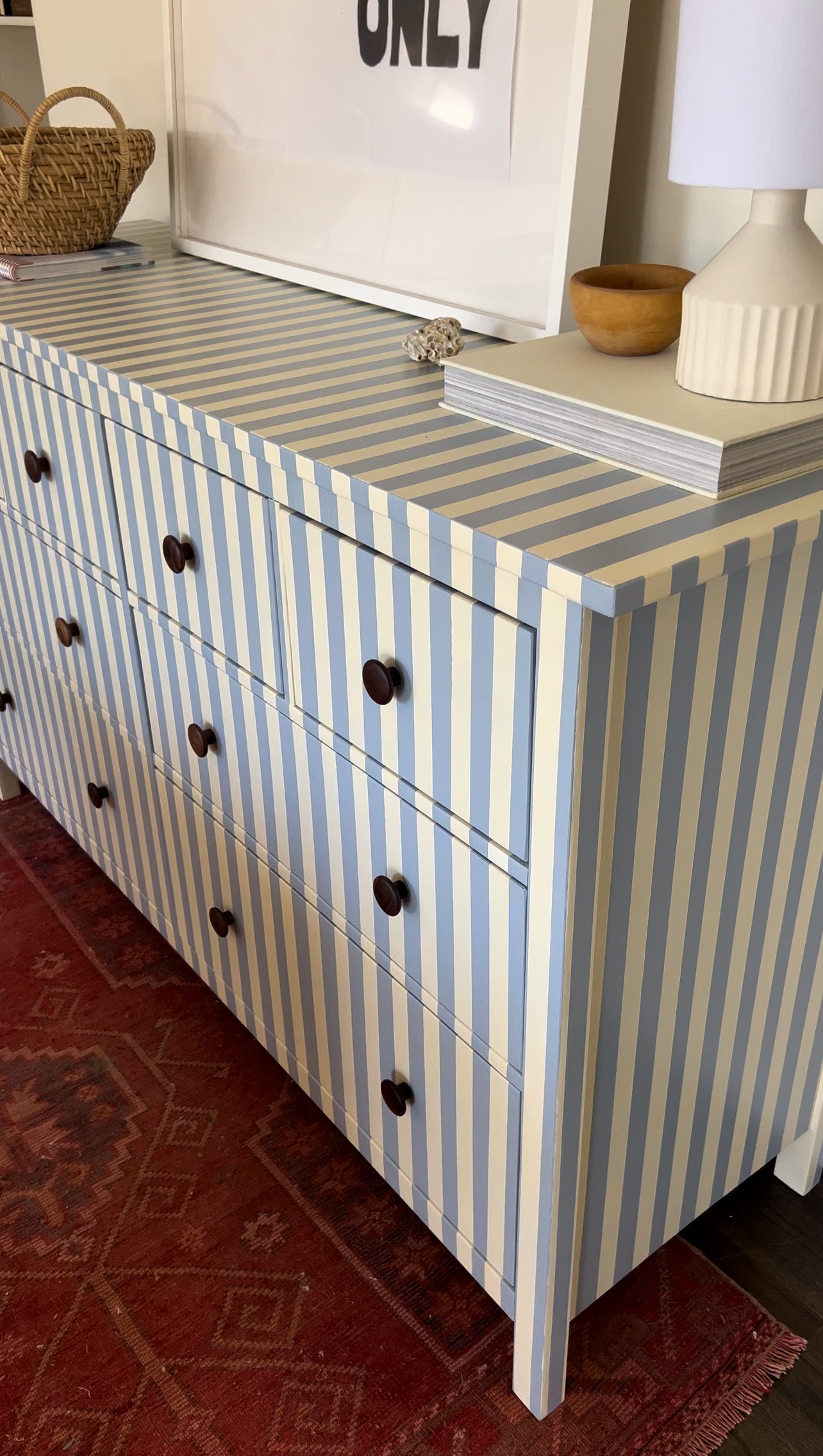 Hand painted blue and white striped dresser.