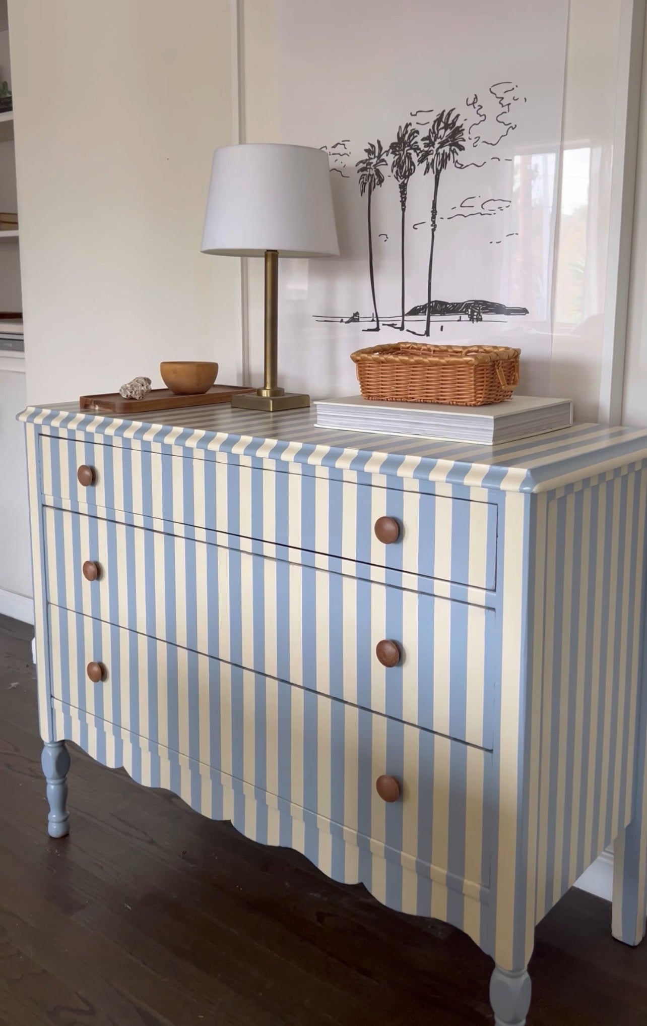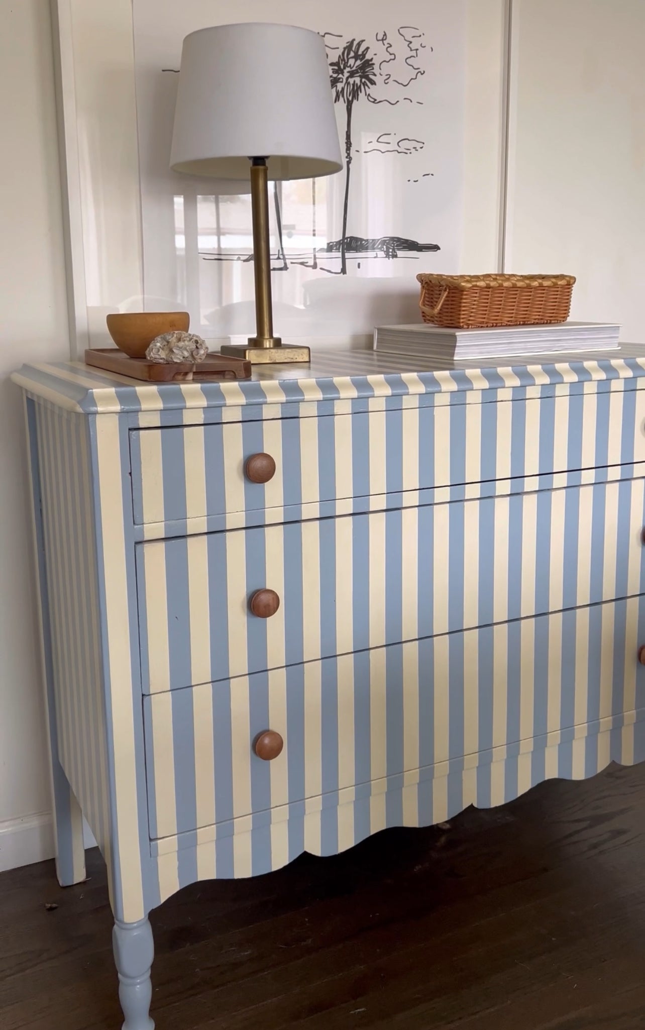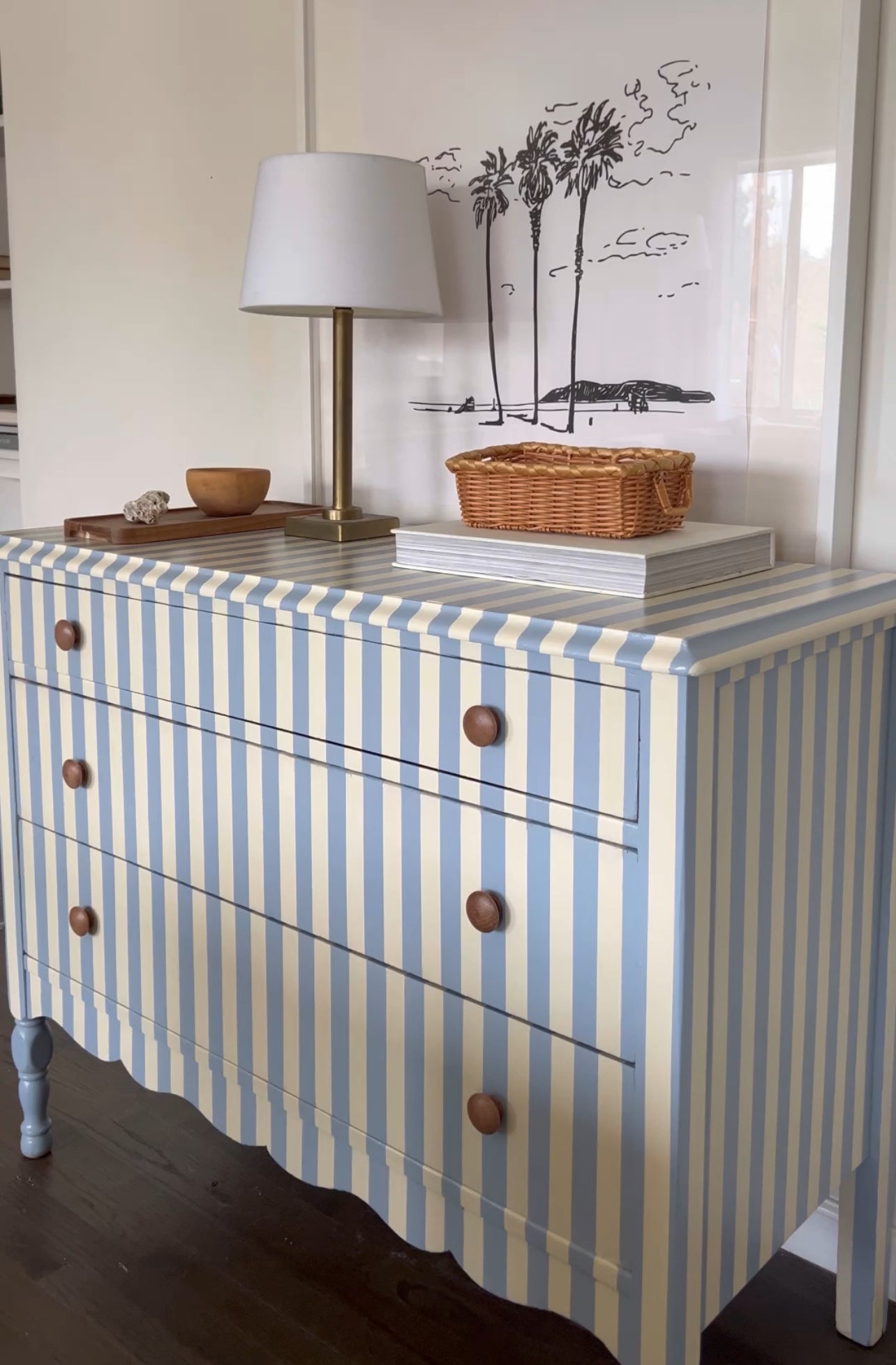 Refurbished to perfection, this vintage dresser is a beautiful blend of cute and quirky. Made with solid wood, its blue and white stripes add a playful touch, while its unique legs make it a true statement piece. Bring some fun into your space with this one-of-a-kind dresser!