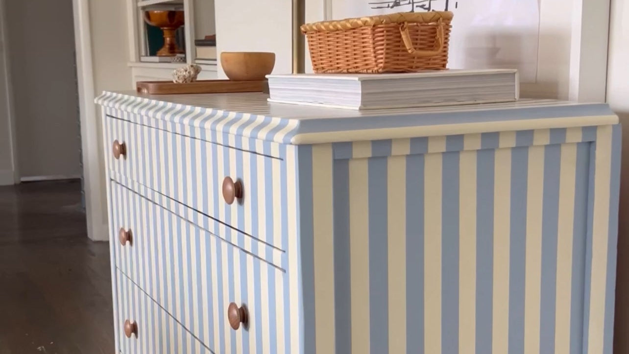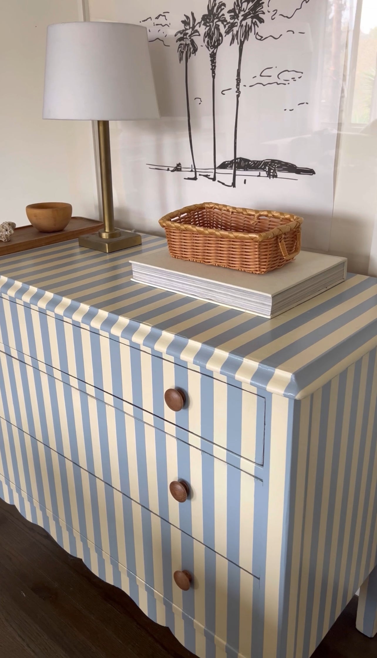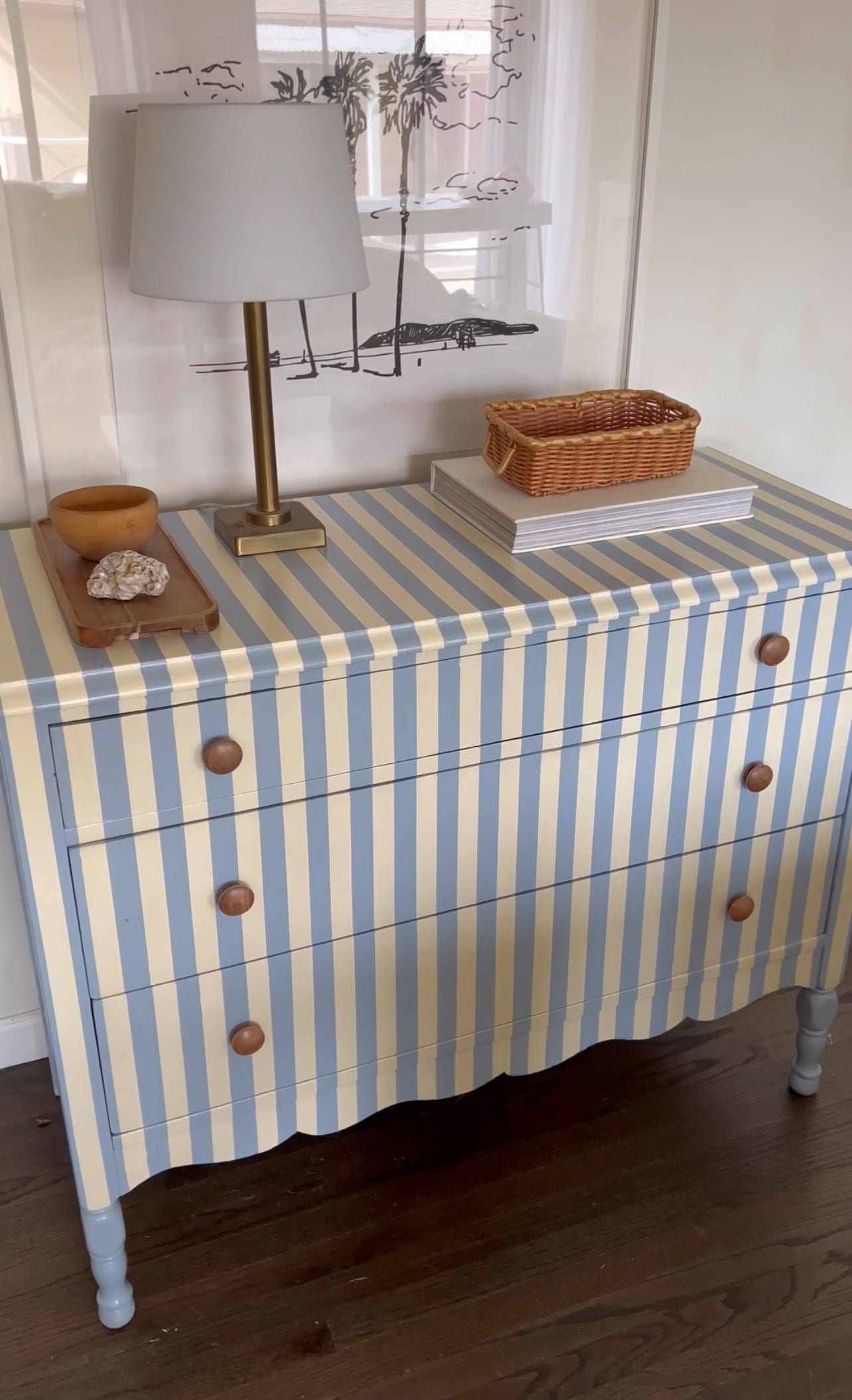 Refurbished to perfection, this vintage dresser is a beautiful blend of cute and quirky. Made with solid wood, its blue and white stripes add a playful touch, while its unique legs make it a true statement piece. Bring some fun into your space with this one-of-a-kind dresser!