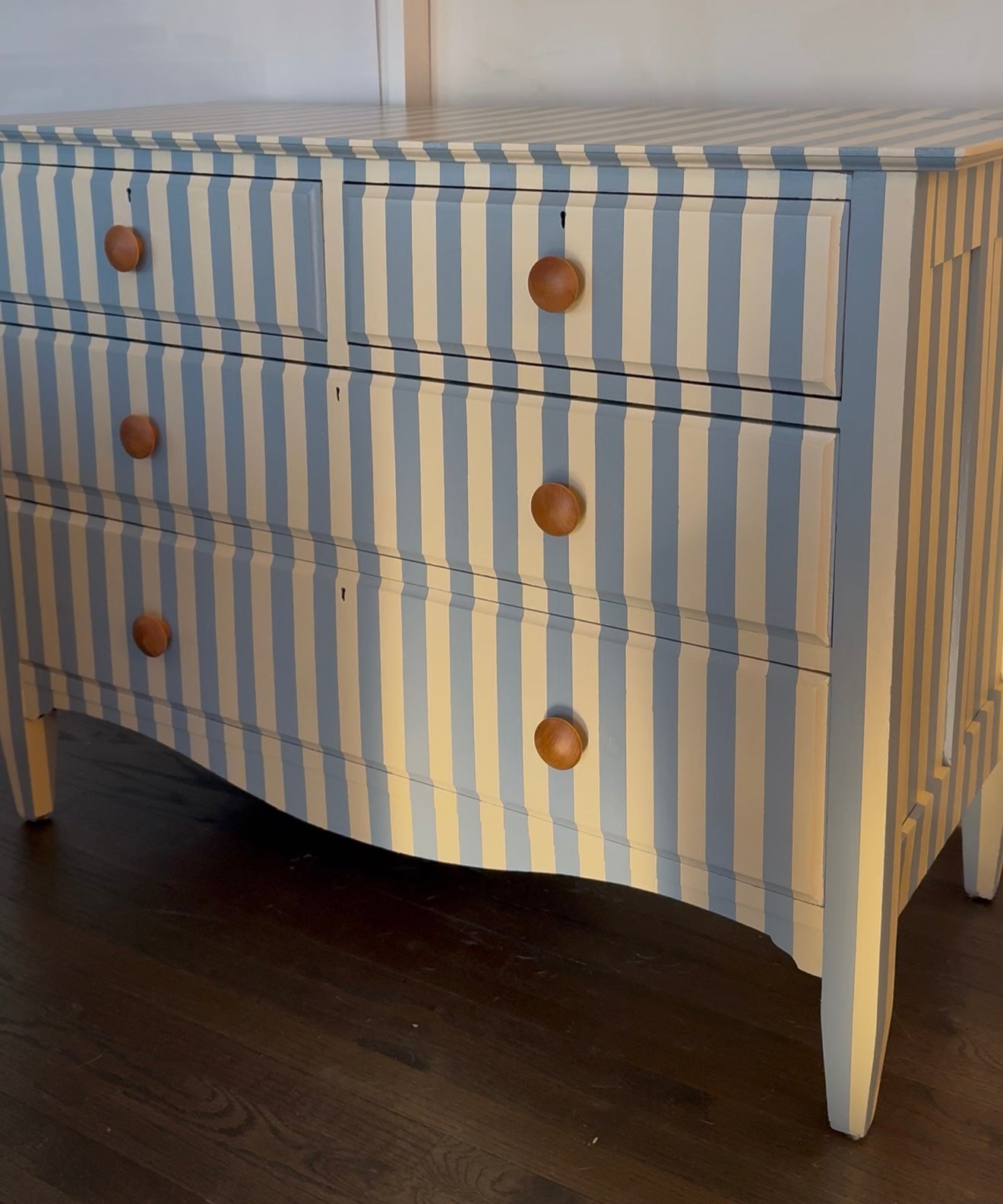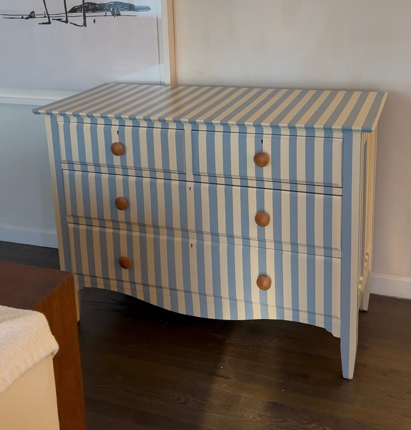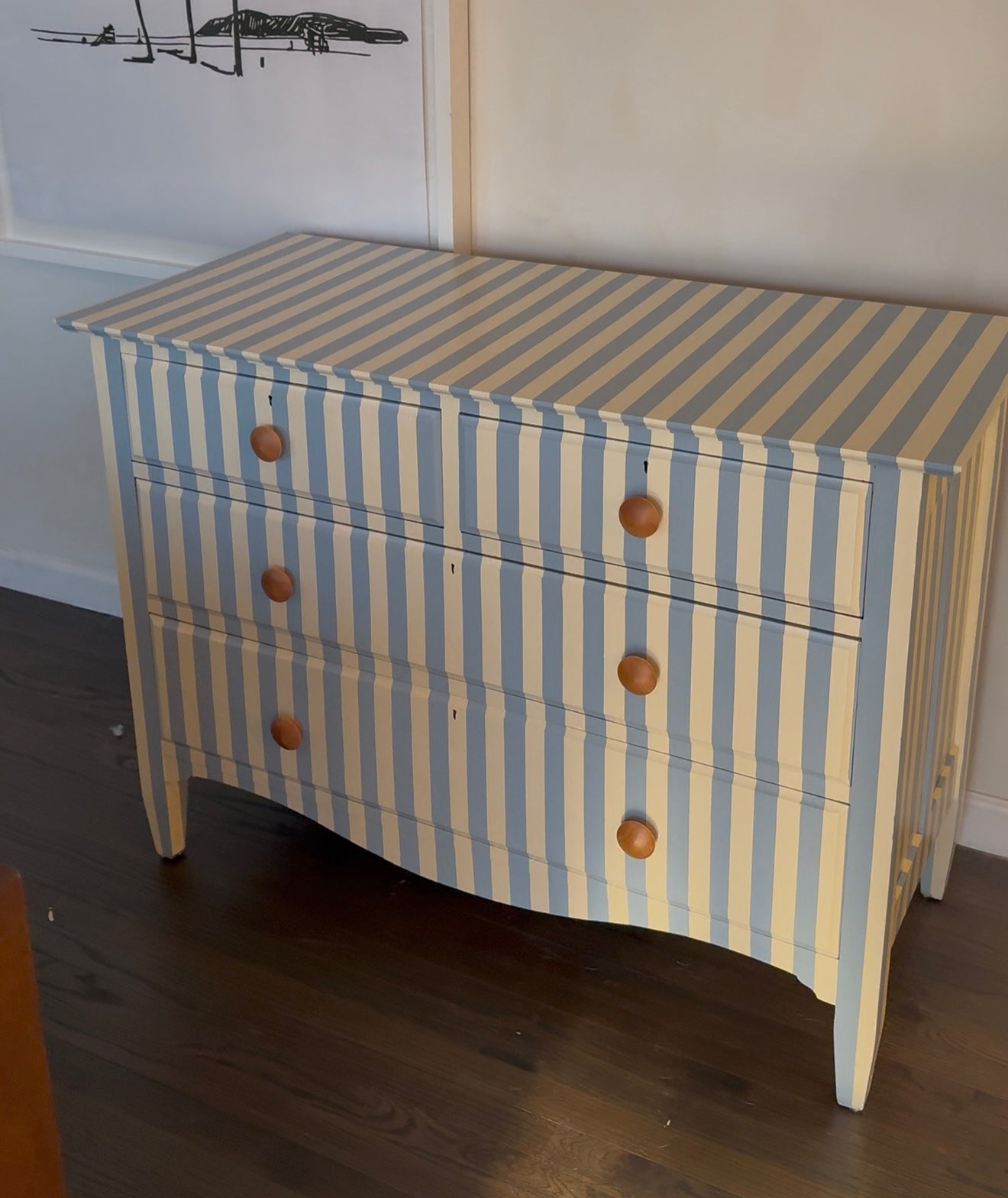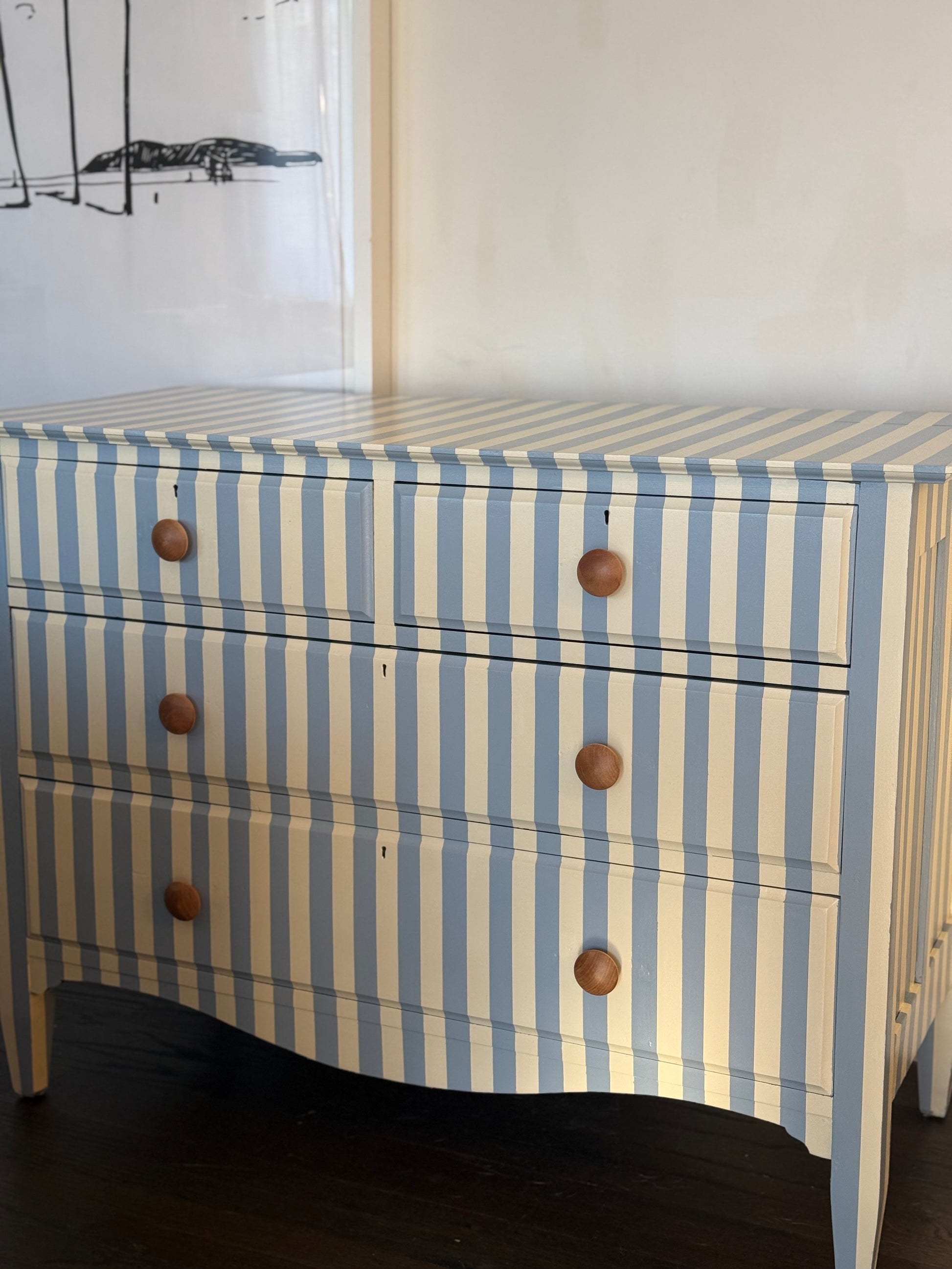 Refurbished to perfection, this vintage dresser is a beautiful blend of cute and quirky. Made with solid wood, its blue and white stripes add a playful touch, while its unique legs make it a true statement piece. Bring some fun into your space with this one-of-a-kind dresser! There's a little split in the wood on the top - pictured but does not effect the piece or function at all - I kept it (didn't fill it in but did secure it with wood glue because I thought it added cute character!) The knobs are solid wood, one of a kind, hand stained!