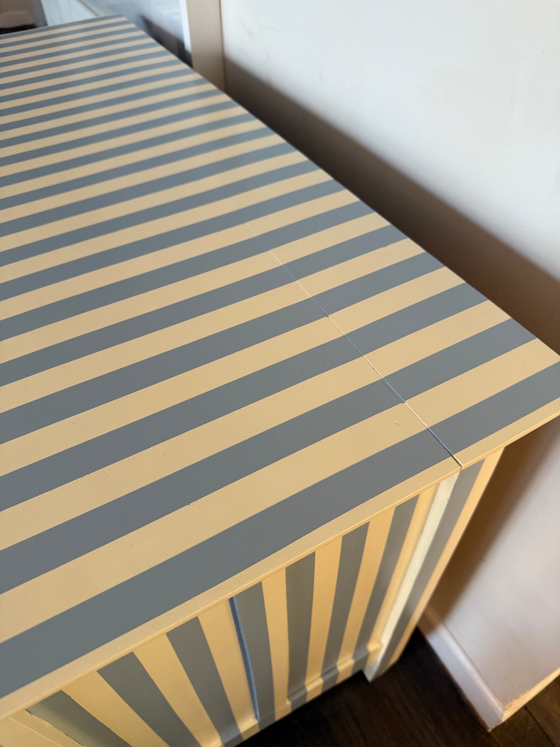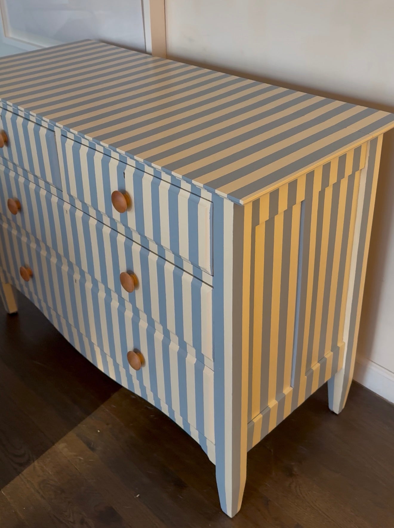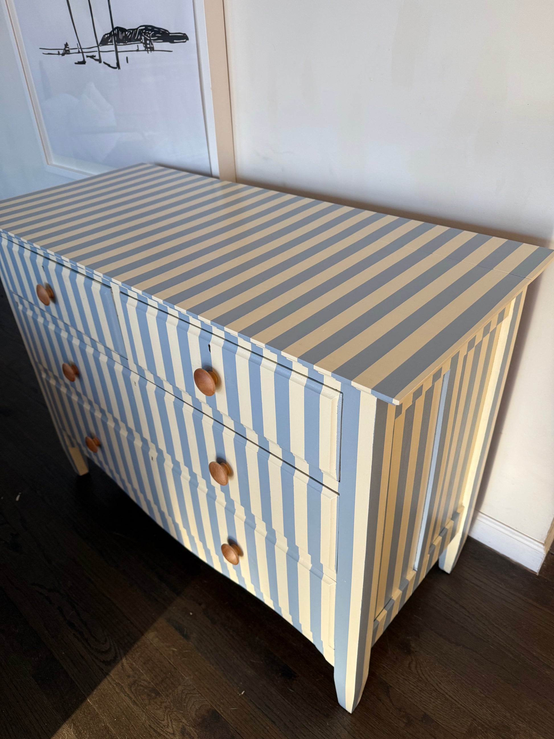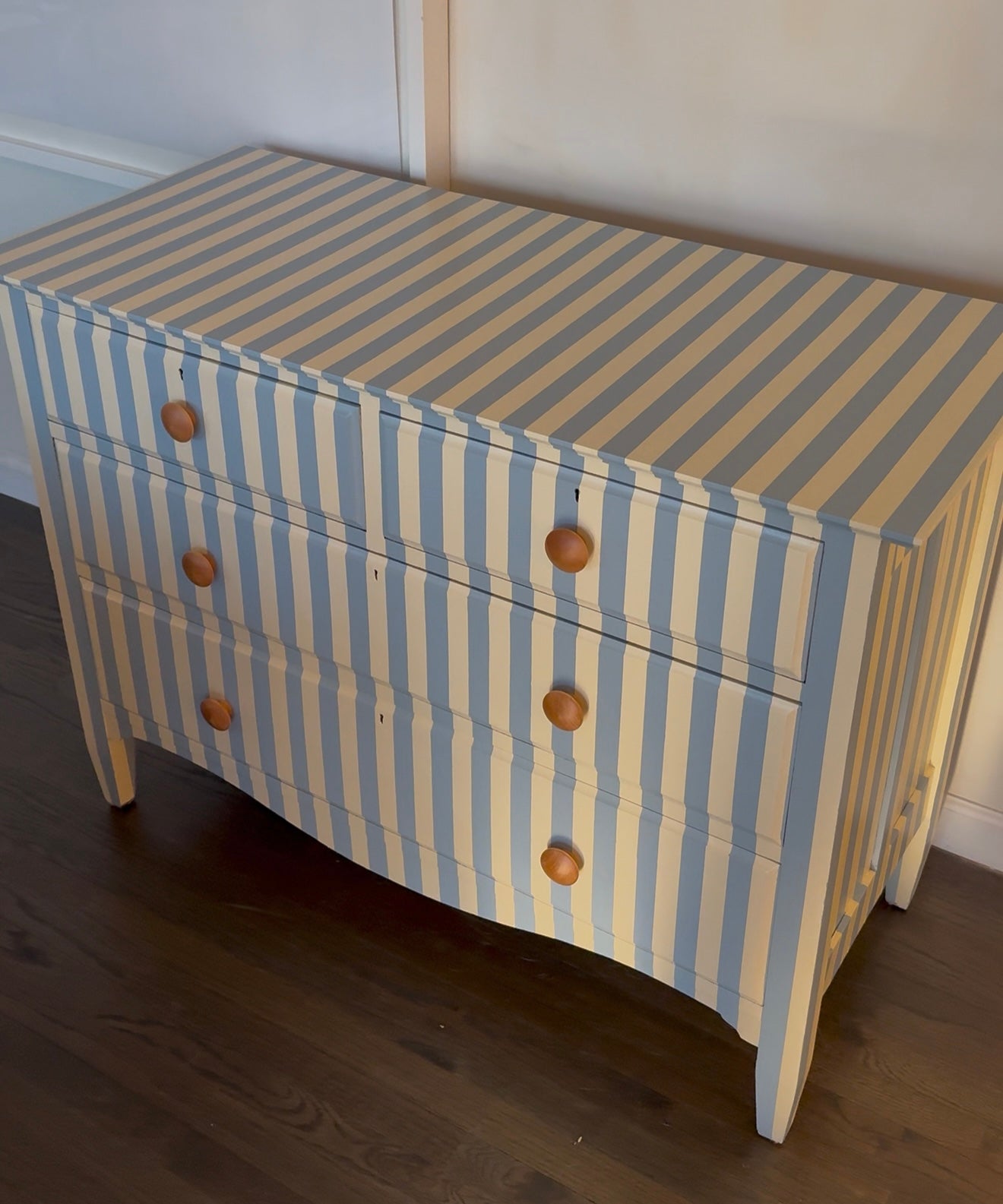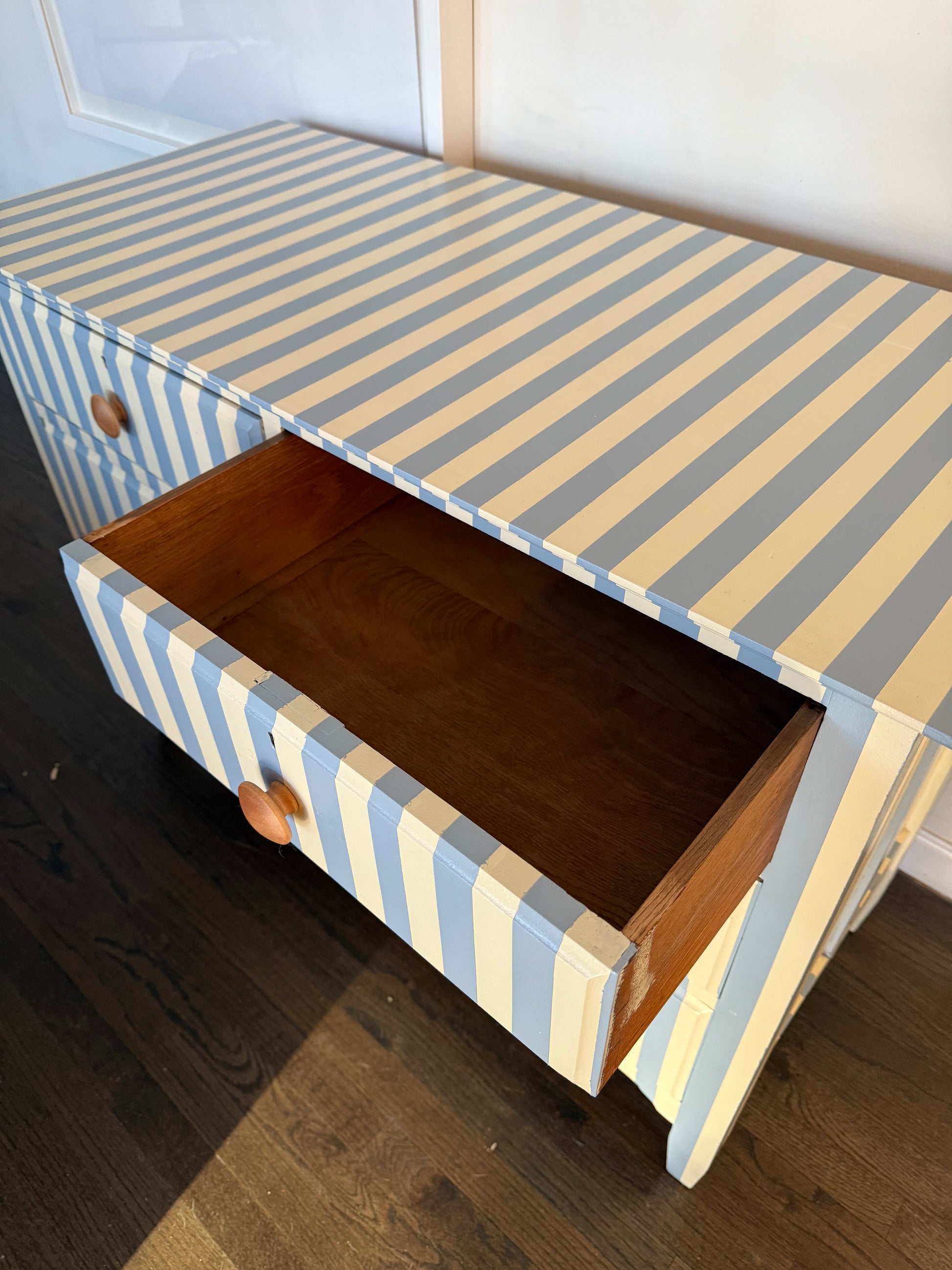 Refurbished to perfection, this vintage dresser is a beautiful blend of cute and quirky. Made with solid wood, its blue and white stripes add a playful touch, while its unique legs make it a true statement piece. Bring some fun into your space with this one-of-a-kind dresser! There's a little split in the wood on the top - pictured but does not effect the piece or function at all - I kept it (didn't fill it in but did secure it with wood glue because I thought it added cute character!) The knobs are solid wood, one of a kind, hand stained!
