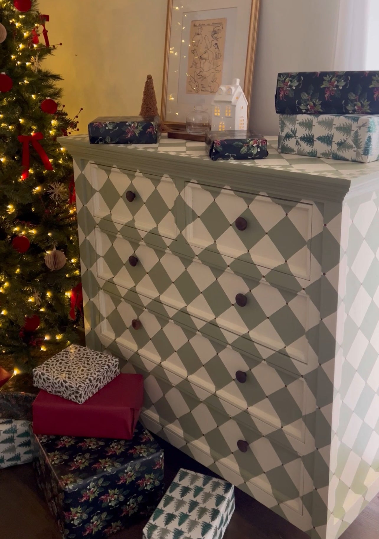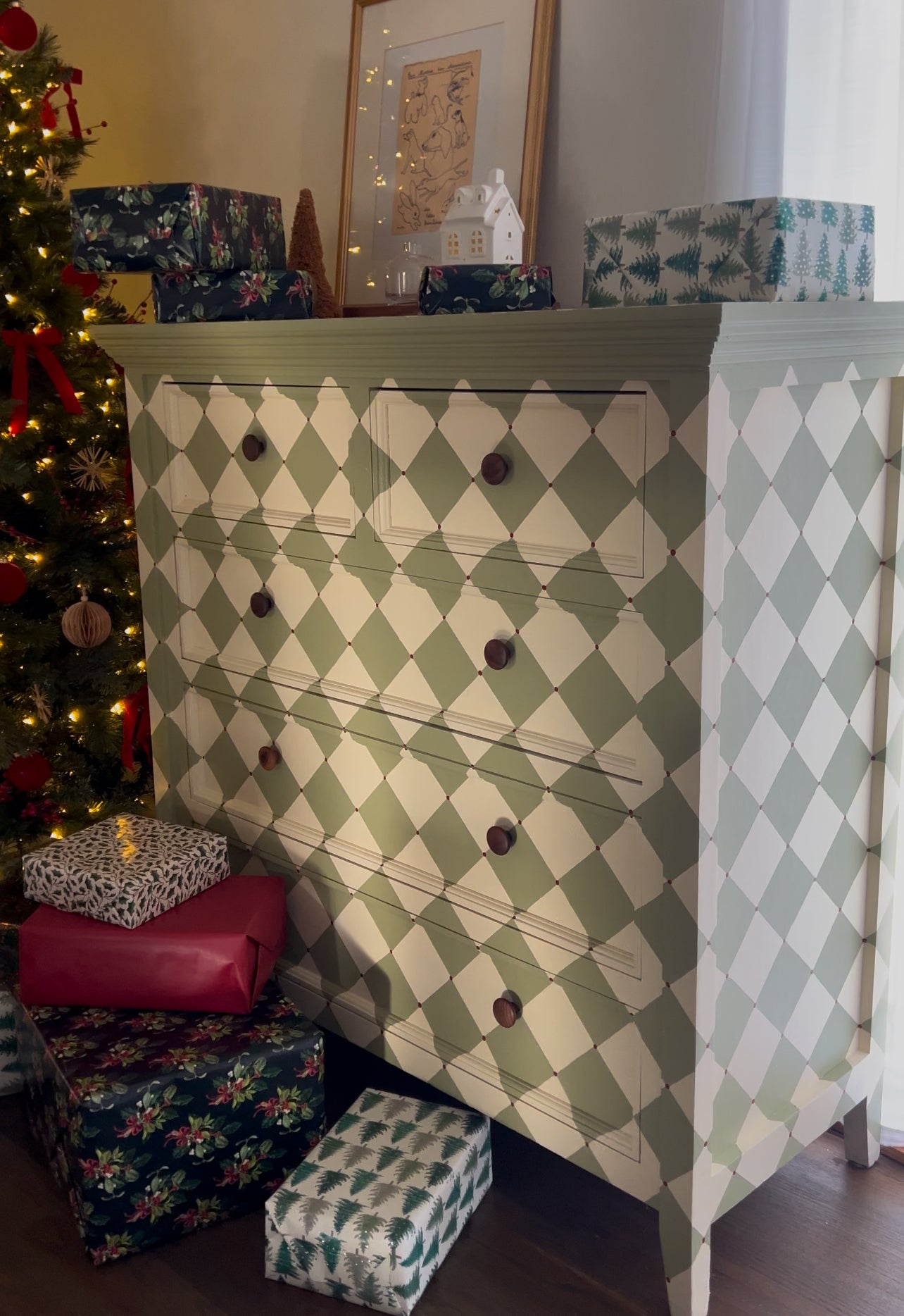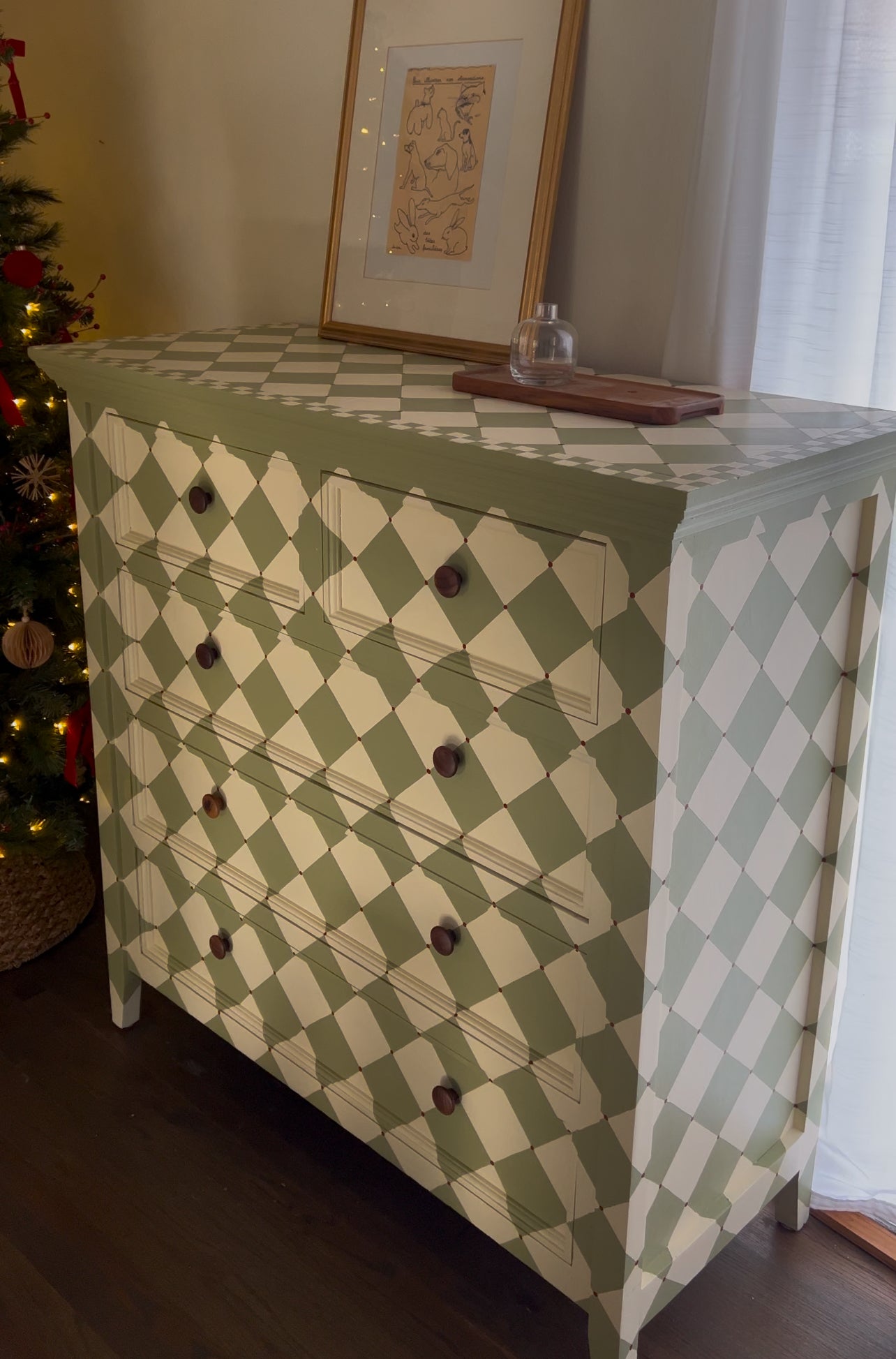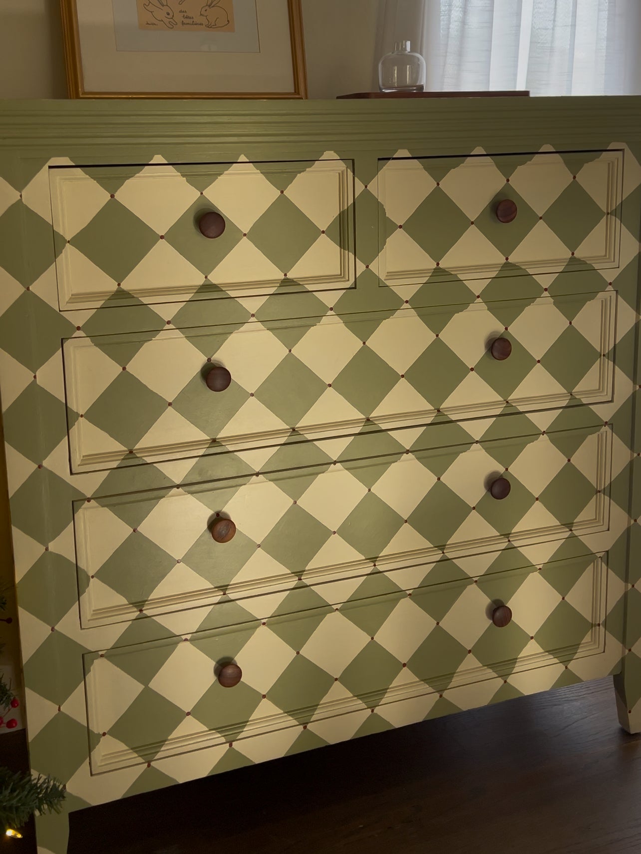 This Green & Cream Diamond Tallboy combines intricate diamond-shaped design with hand-painted green diamonds and small burgundy dot details. The cream paint adds a touch of elegance while the walnut knobs provide a classic touch. A perfect addition to any bedroom, adding both style and functionality.