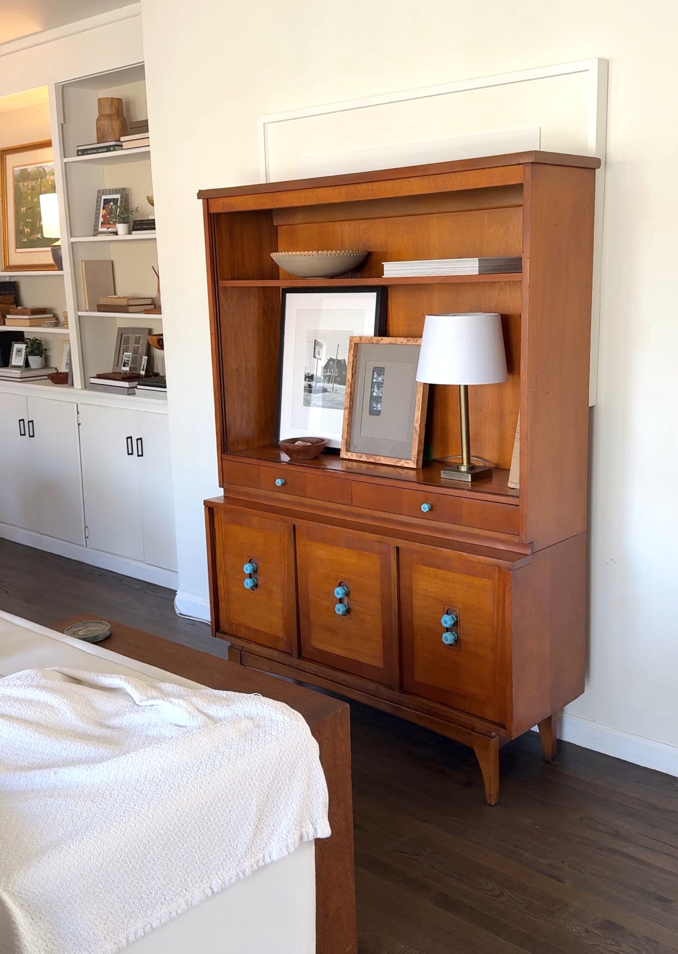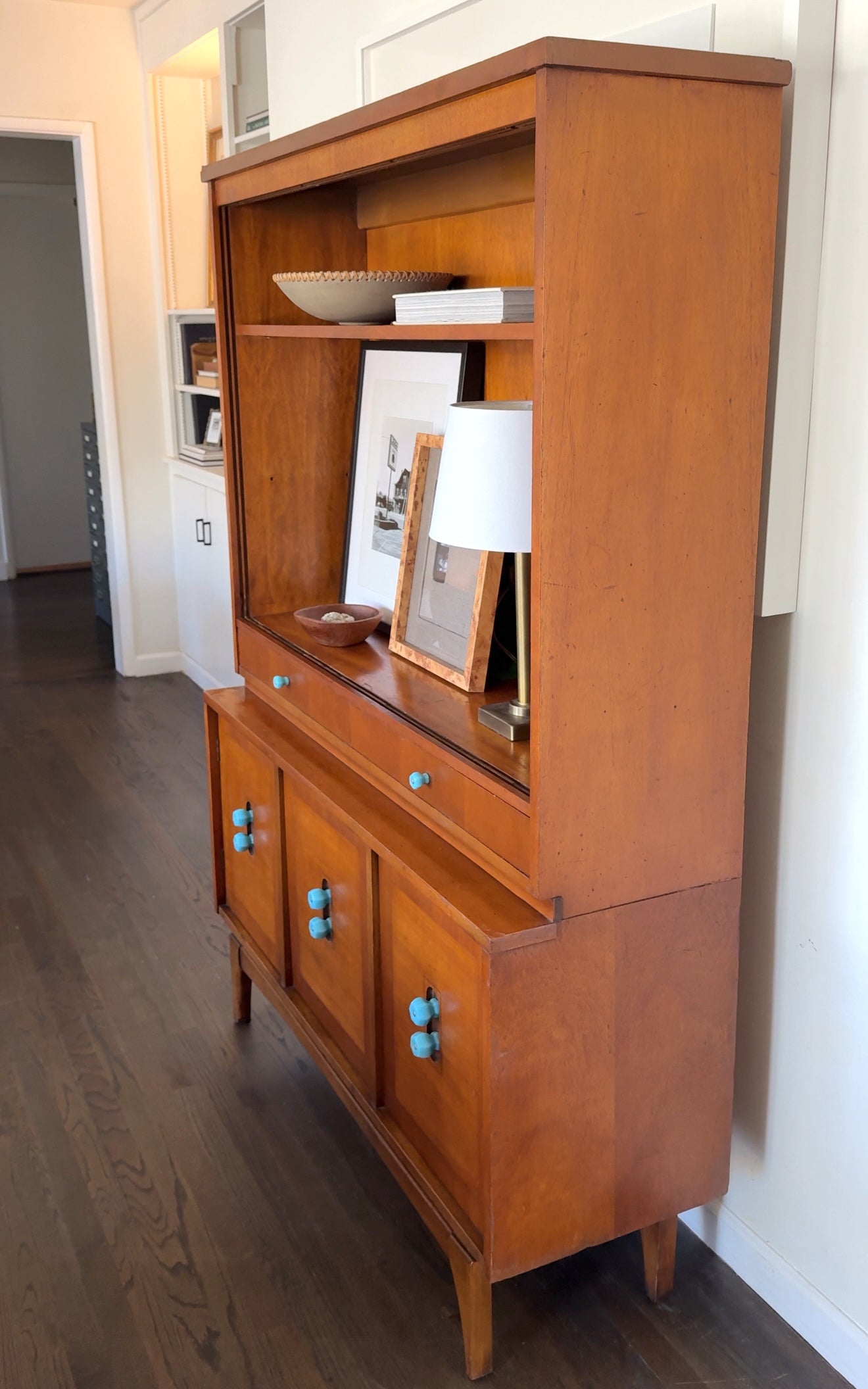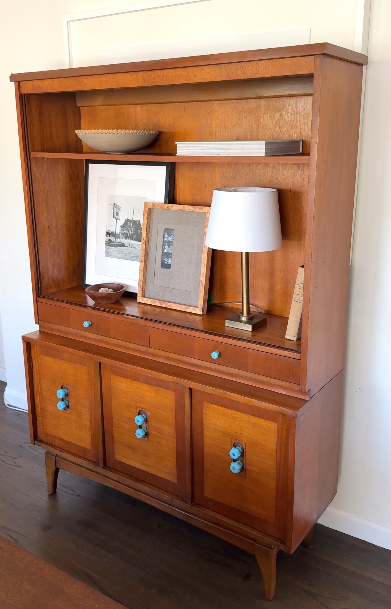 Charming MCM hutch with some light wear consistent with age (see last photos for details), but overall in great working condition. Originally designed to hold sliding doors, though they are not currently included.