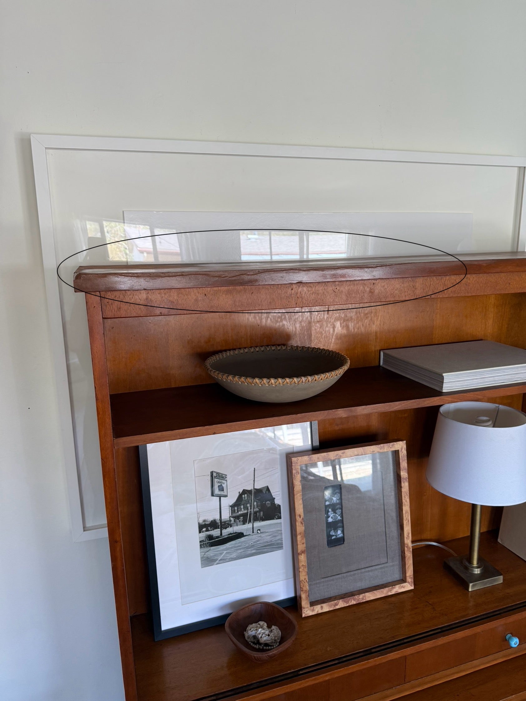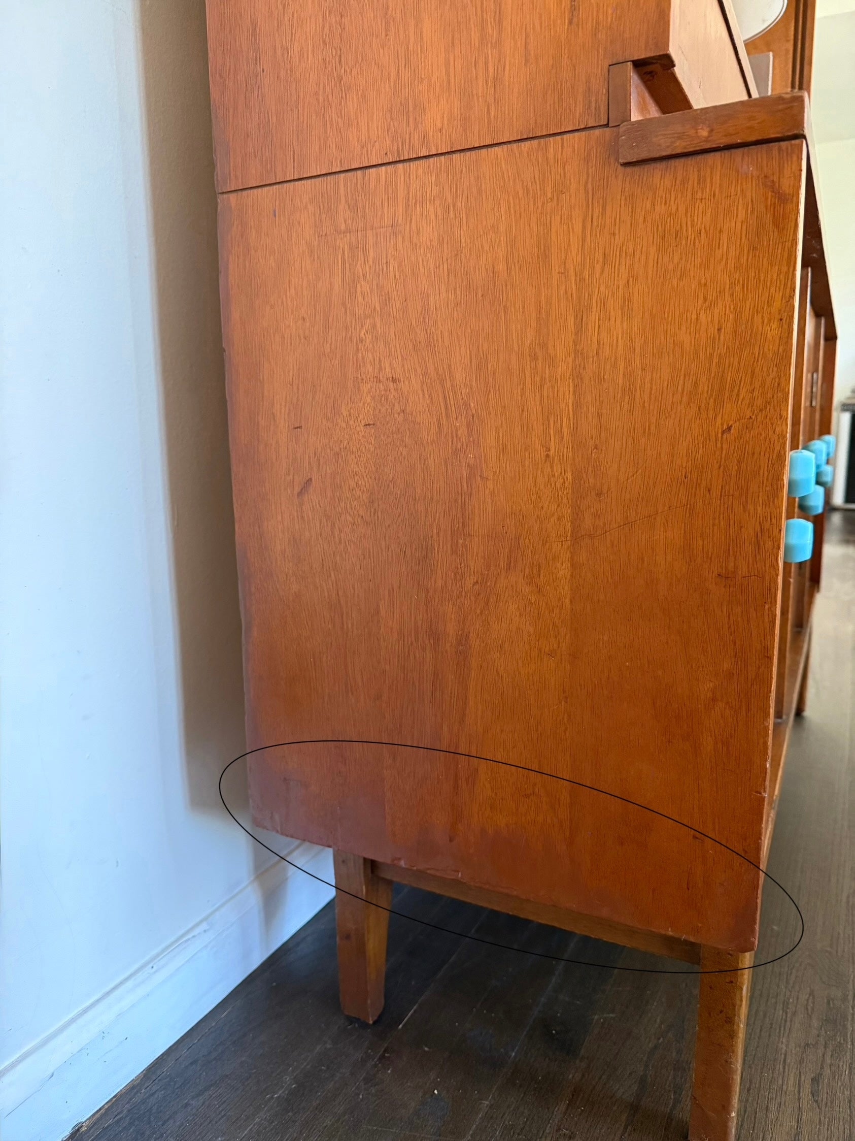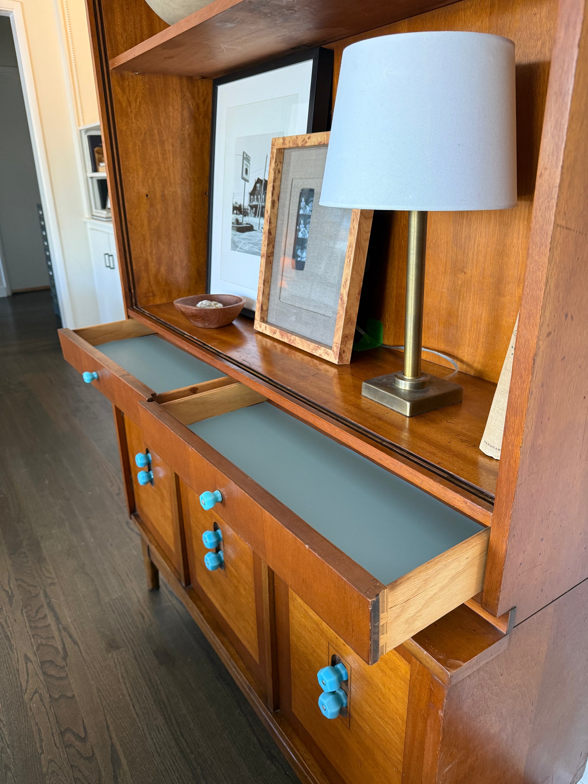 Charming MCM hutch with some light wear consistent with age (see last photos for details), but overall in great working condition. Originally designed to hold sliding doors, though they are not currently included.