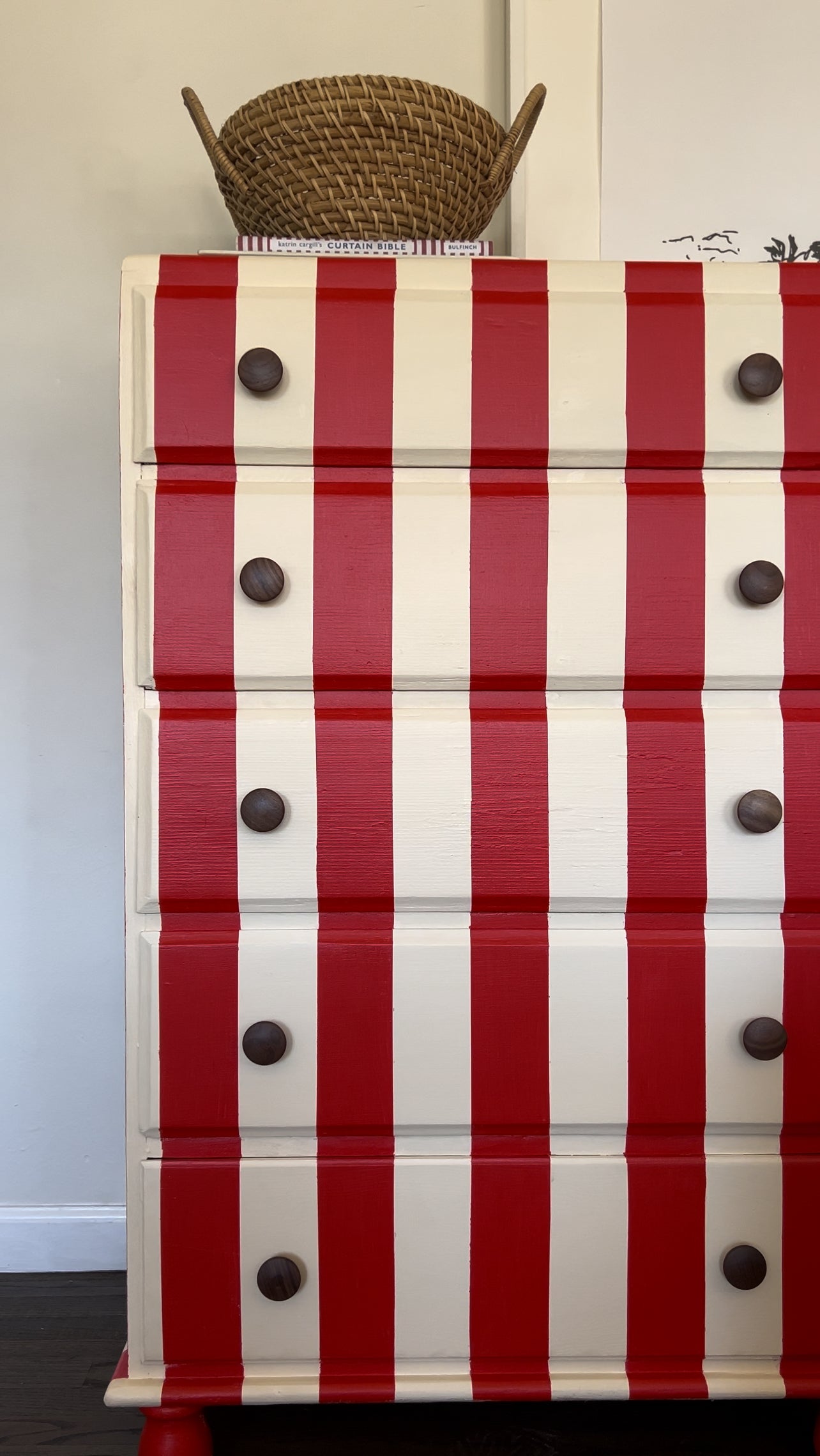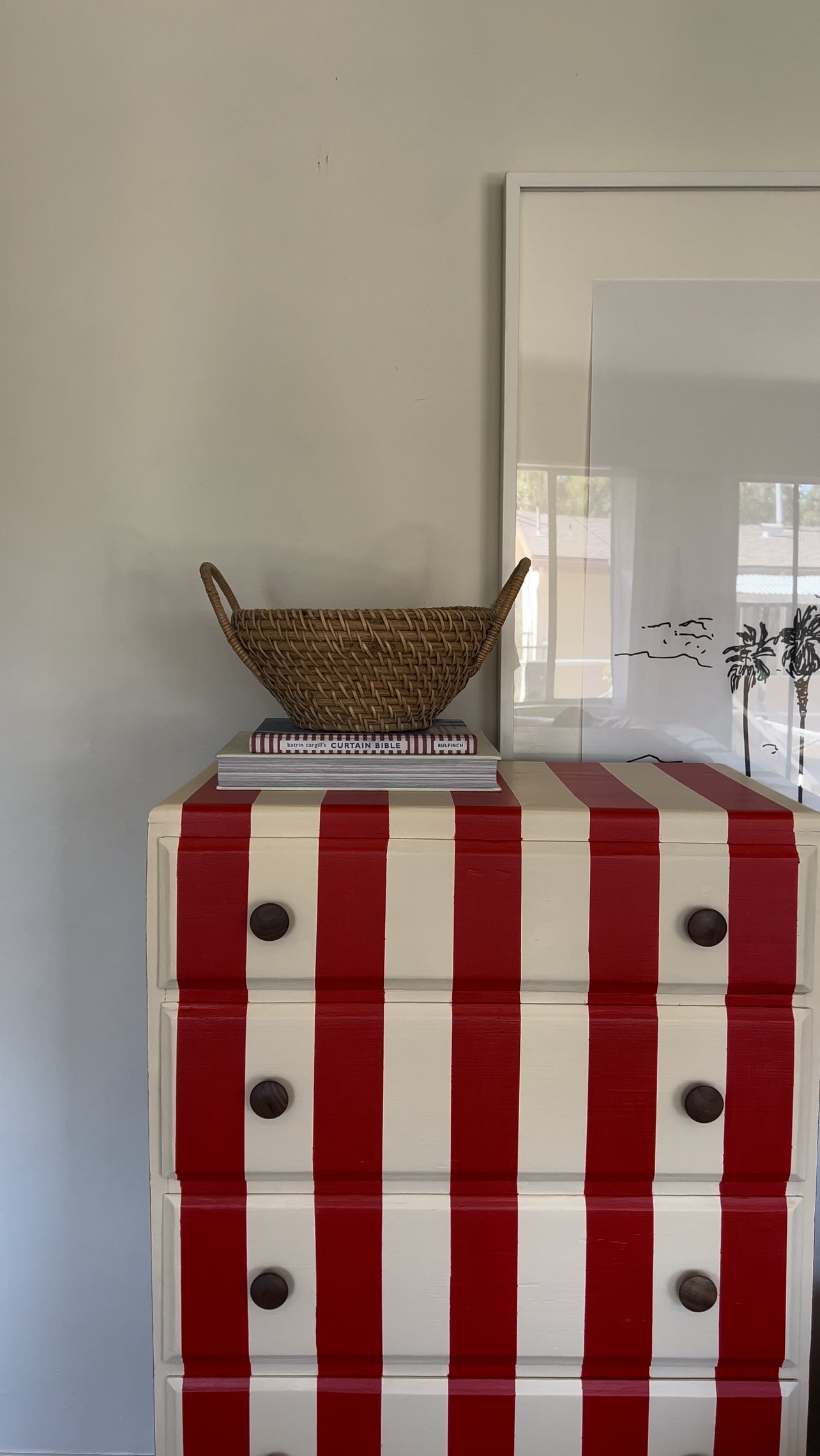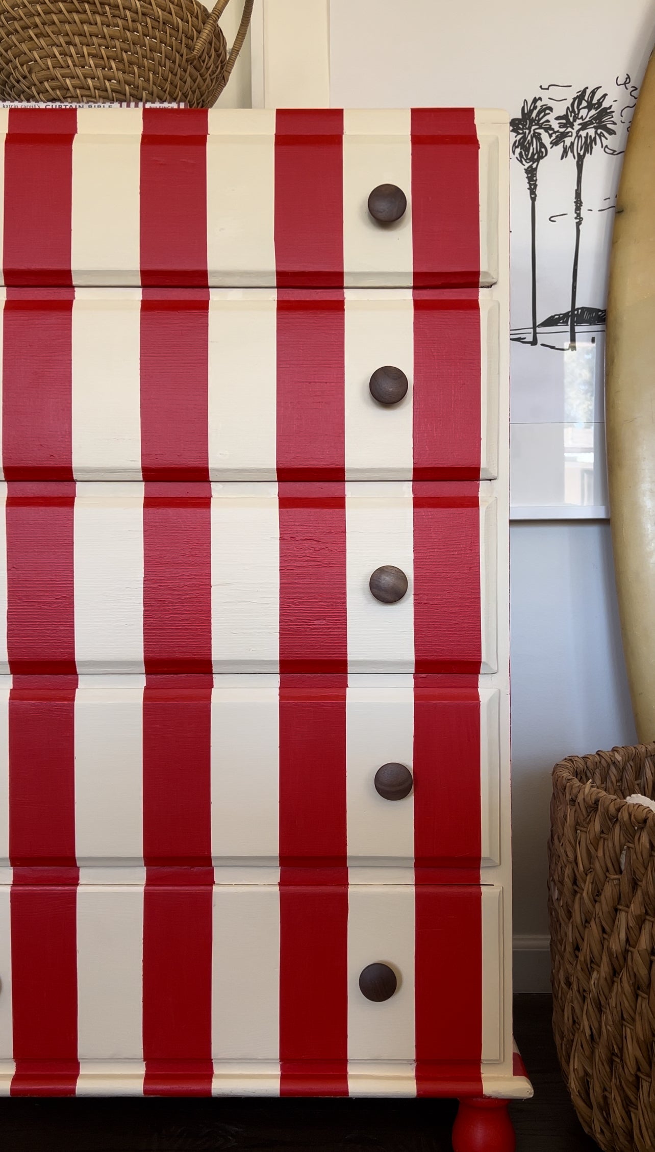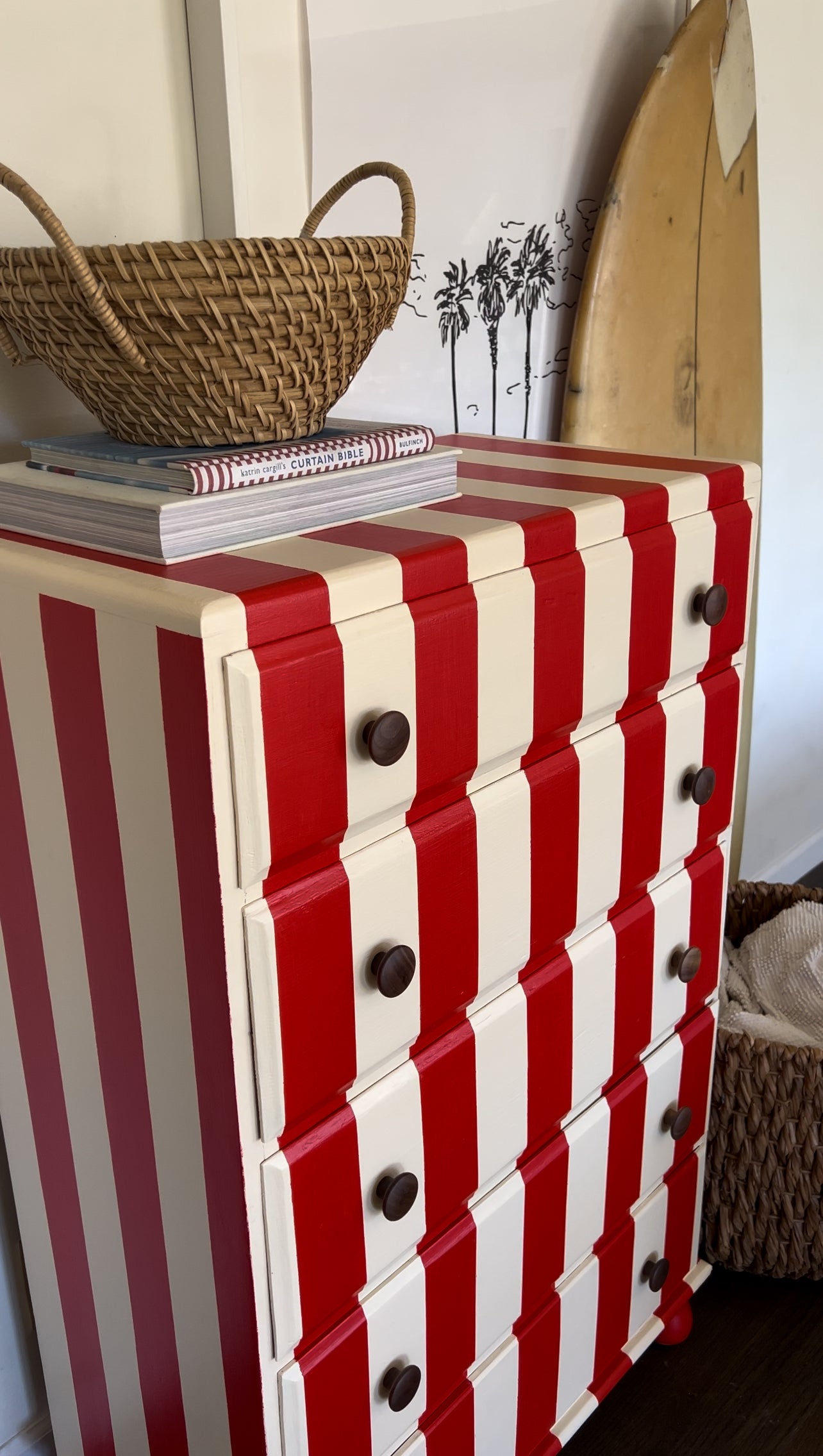 Get ready to add some fun to your bedroom with this beachy tallboy dresser! With its vibrant red and white stripes, this dresser will bring a playful pop of color to your space. Plus, its spacious drawers provide plenty of storage for all your summer clothes. Beach, please (don't) miss out on this one!