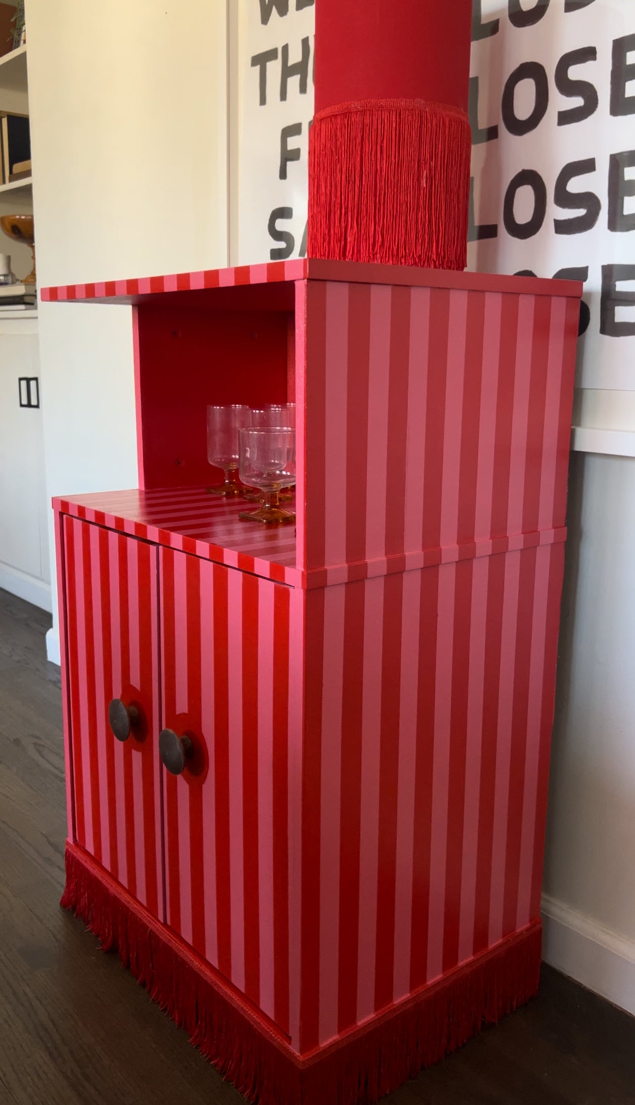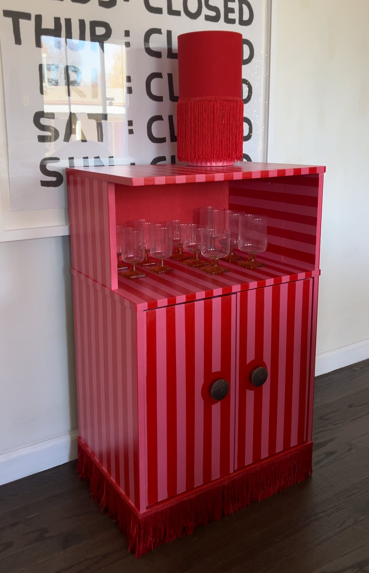 Add a touch of whimsy to your home with our Striped Bar Cart with Fringe. The playful striped design is complemented by a funky fringe, creating a unique and quirky piece. The matching lamp adds an extra touch of charm. Elevate your entertaining game with this fun and functional bar cart.
