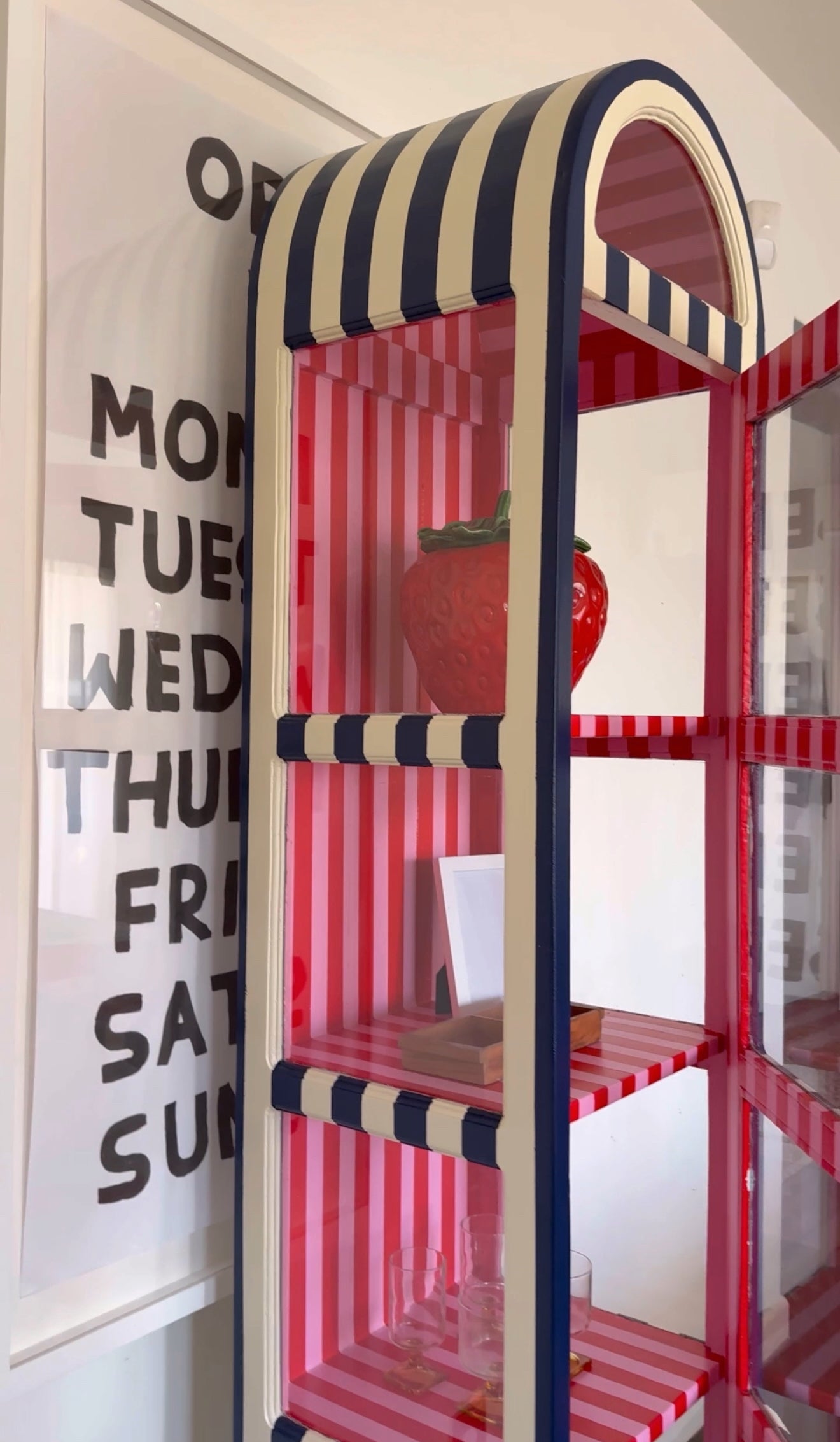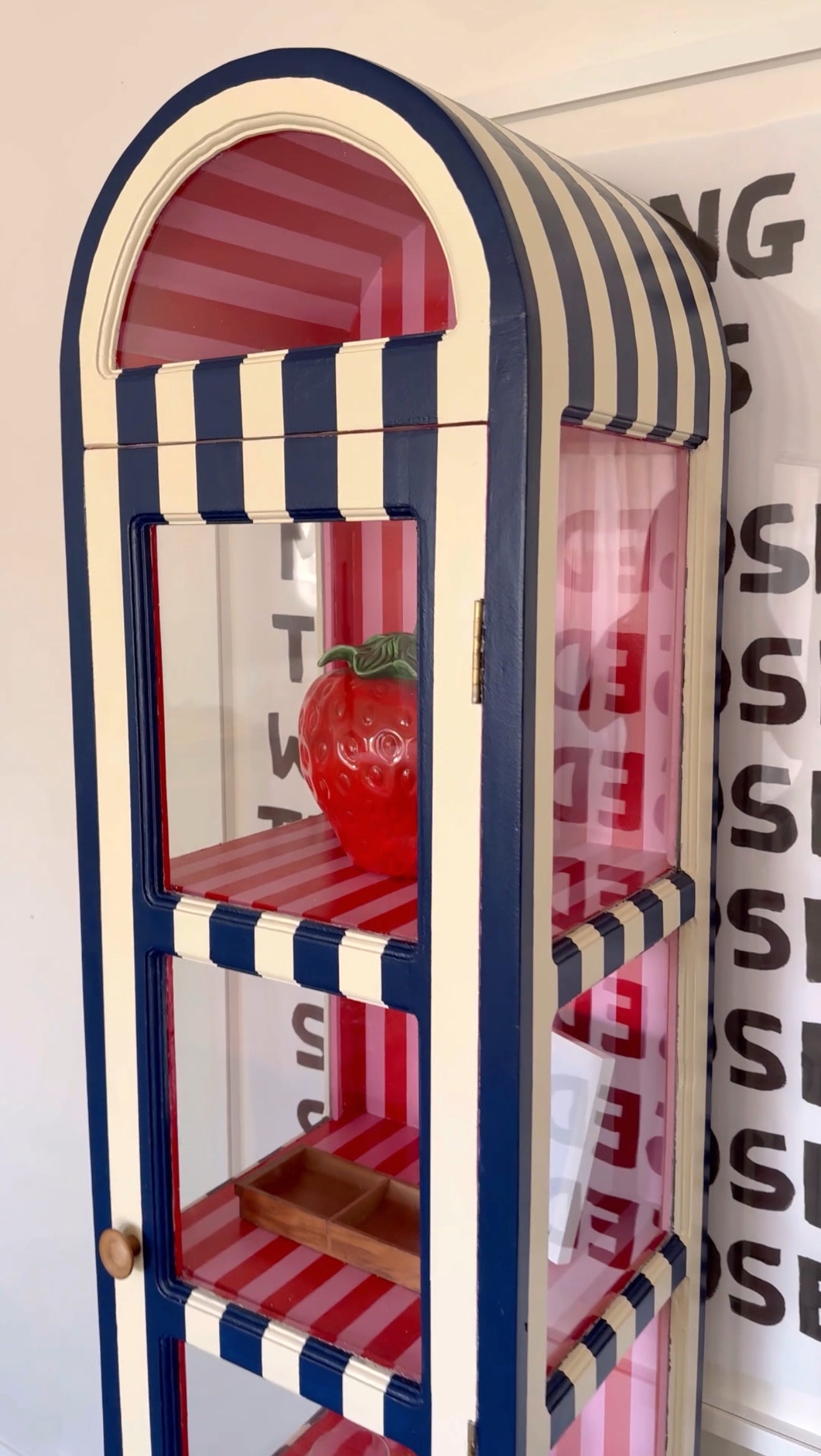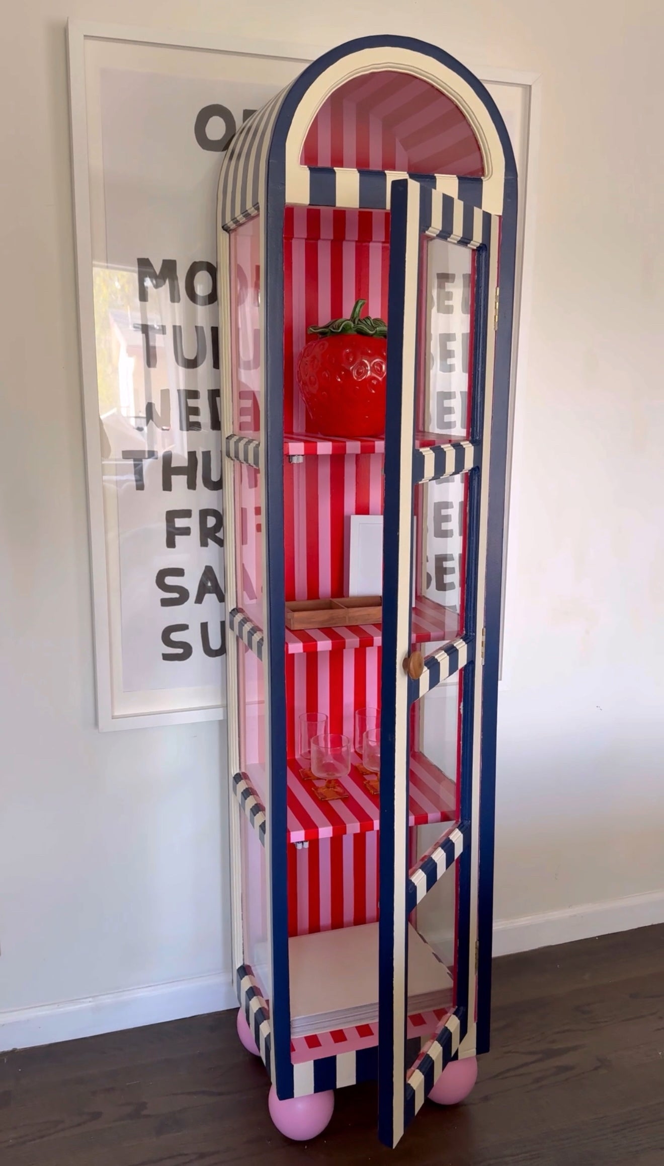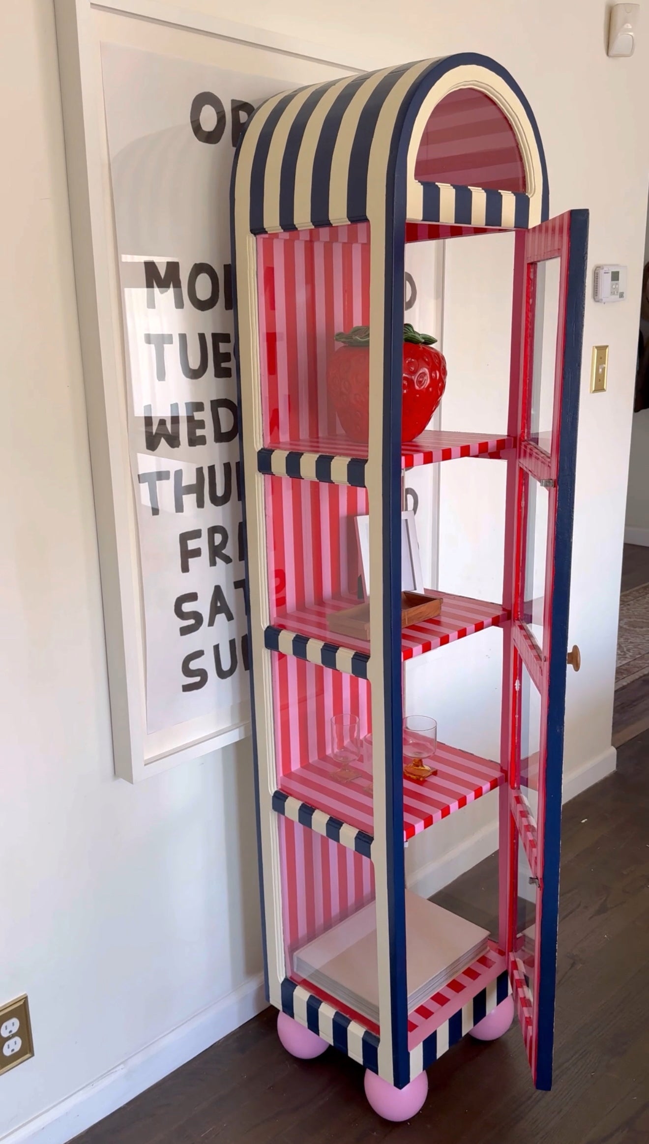 "Add a pop of color and personality to your space with this Striped Glass Cabinet. The hand painted stripes and bright interior create a fun contrast, while the arched top and solid wood ball feet add a touch of cool. Perfect for adding storage and style to any room!"