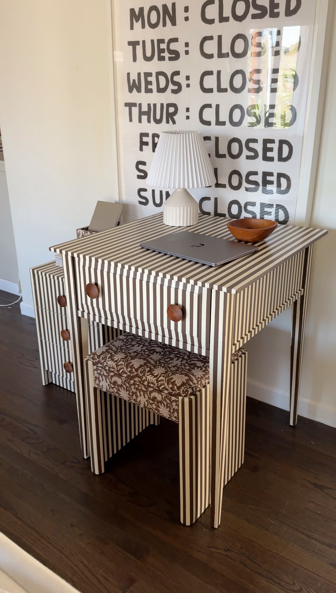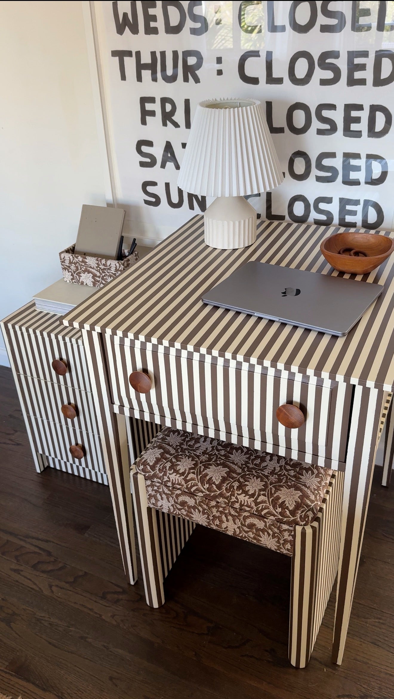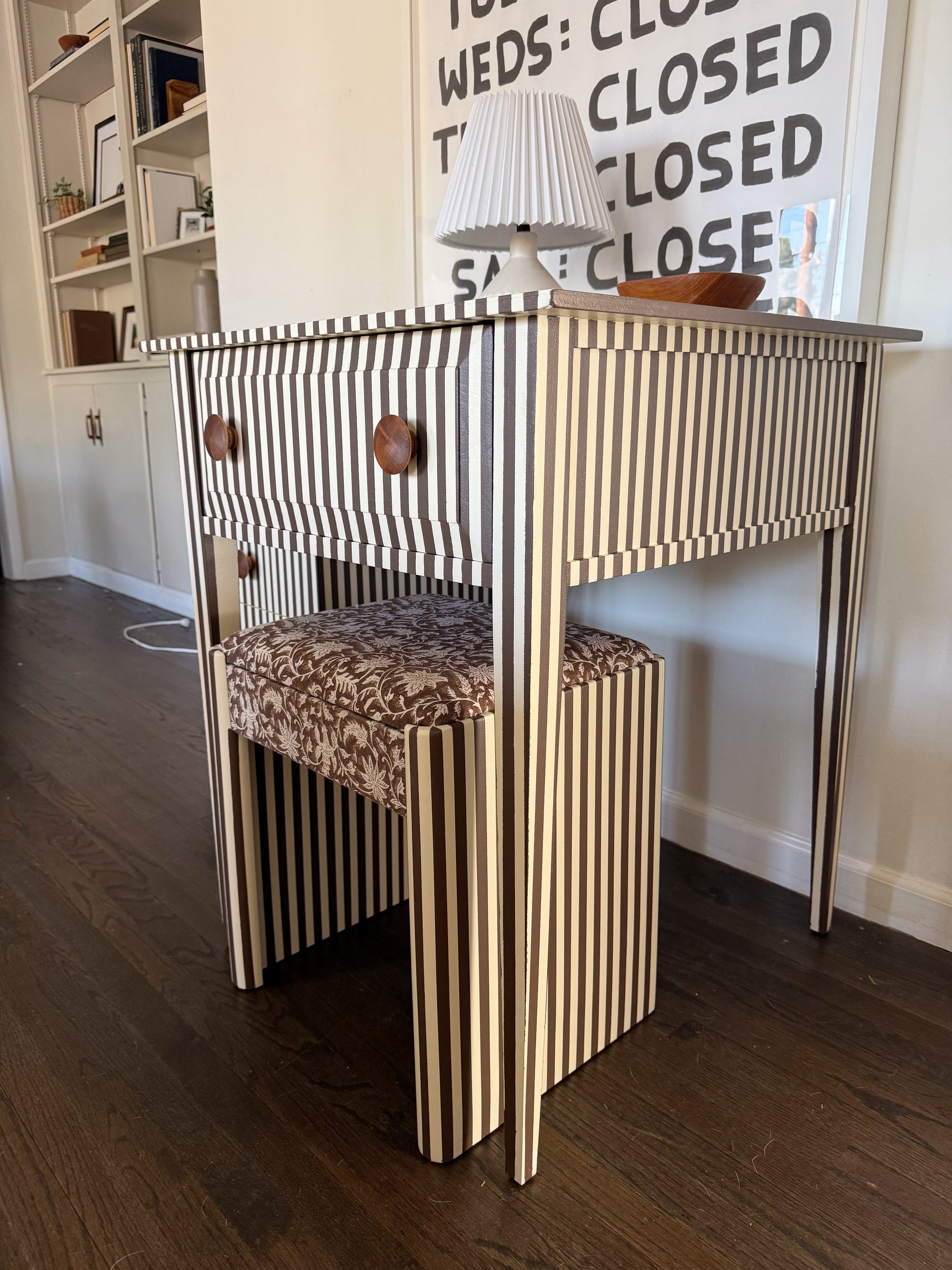 Matching desk, bench, and 3-drawer cabinet in chocolate + cream stripes with oversized wood knobs. The bench is upholstered in a vintage floral for extra texture. One-of-a-kind. Looks just as good closed laptop as it does in action.