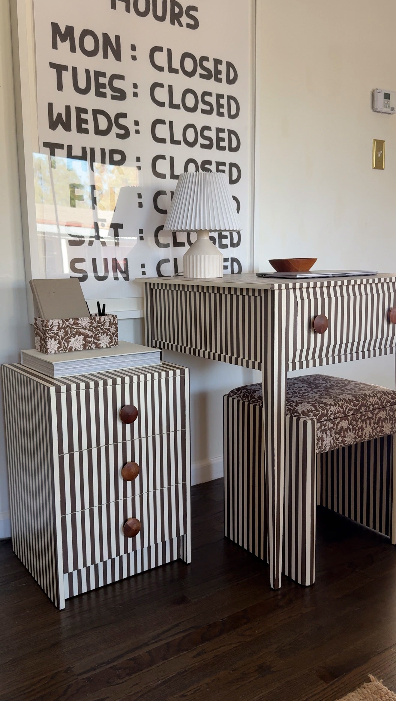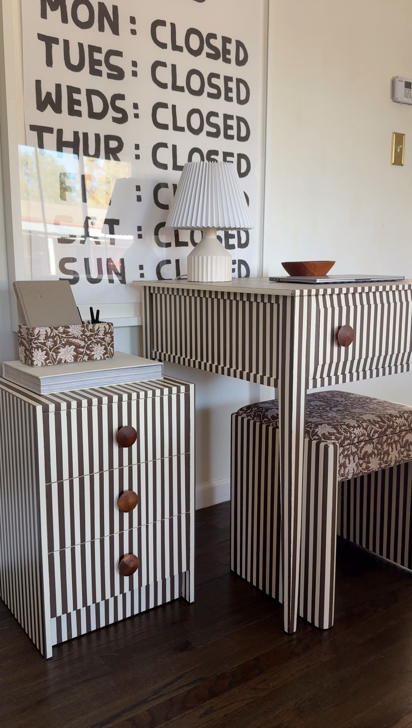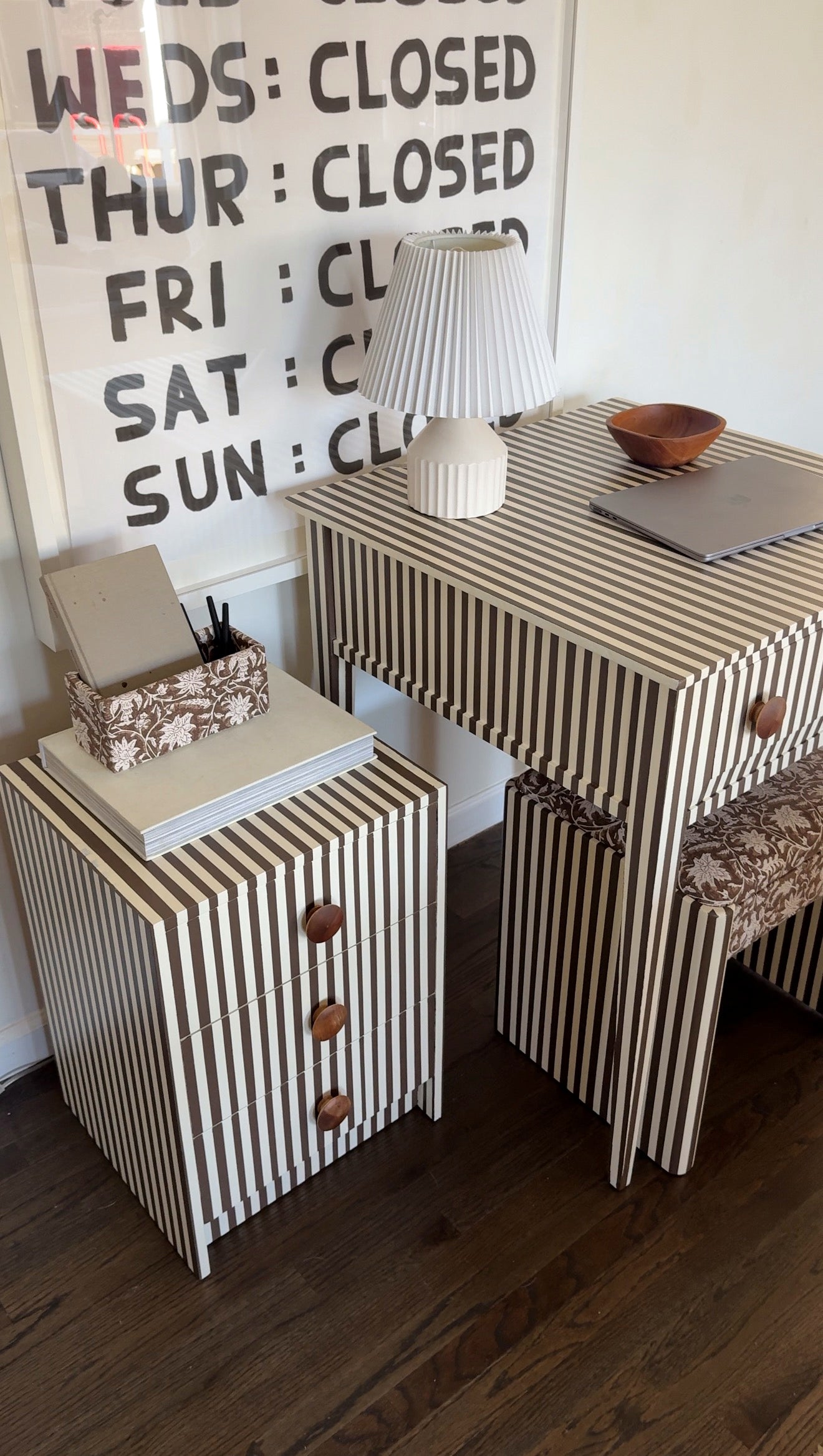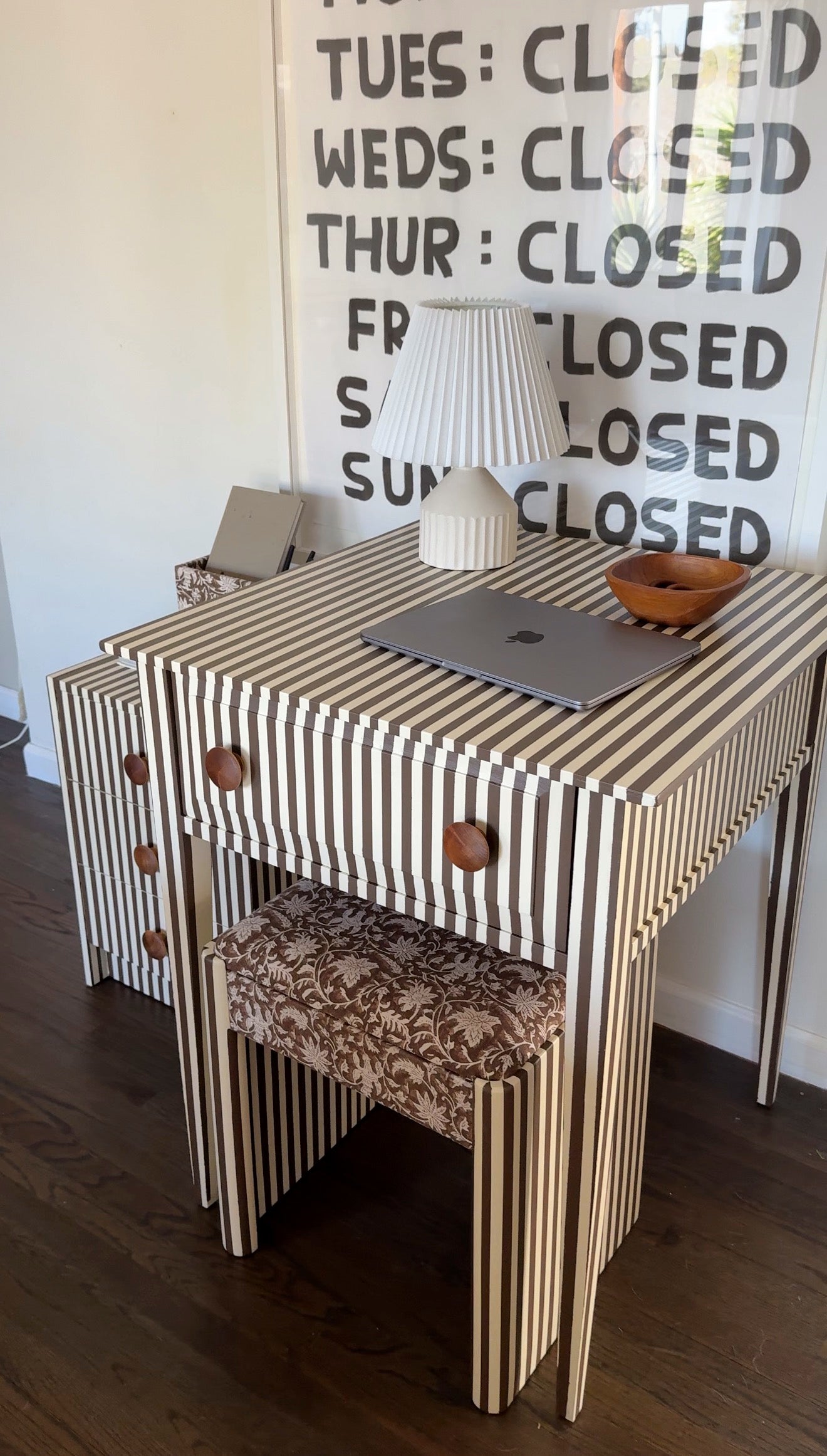 Matching desk, bench, and 3-drawer cabinet in chocolate + cream stripes with oversized wood knobs. The bench is upholstered in a vintage floral for extra texture. One-of-a-kind. Looks just as good closed laptop as it does in action.