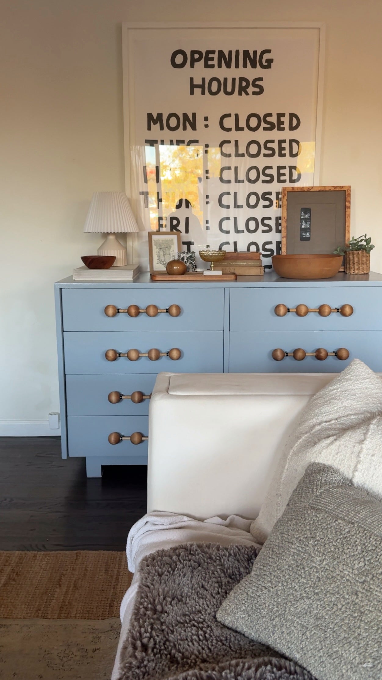 This eight-drawer dresser combines practical storage with distinctive style. Crafted from solid wood in a lovely blue hue, it features bold, chunky handles that give it genuine character and charm.