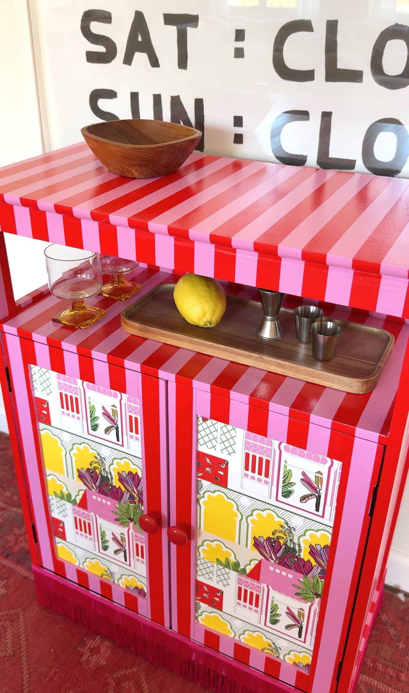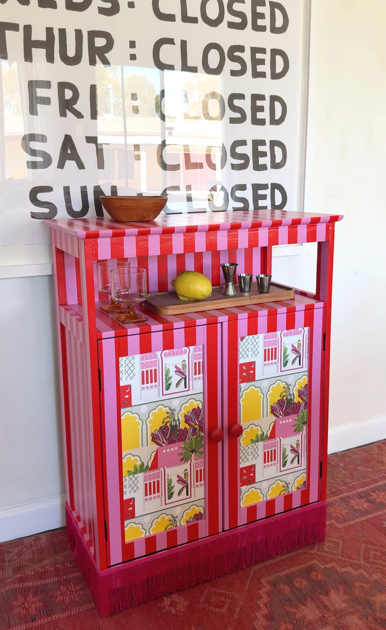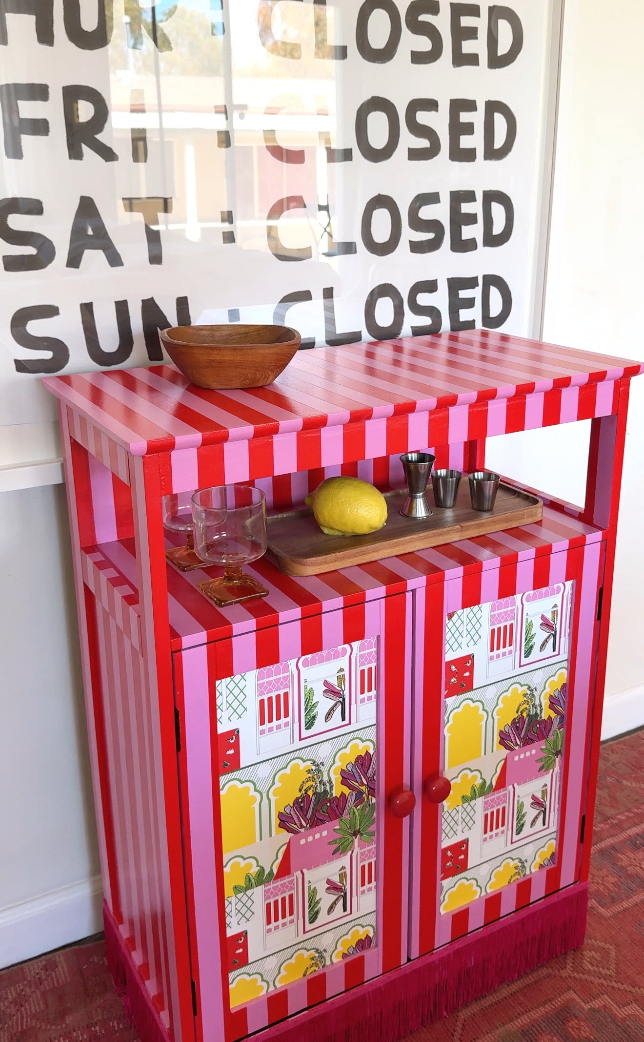 Hand-painted eclectic piece with pink fringe bottom. Brighten up your space and get creative with its dual function as a bar cabinet. Perfect for those who like to add some fun (and cocktails) into their home decor!