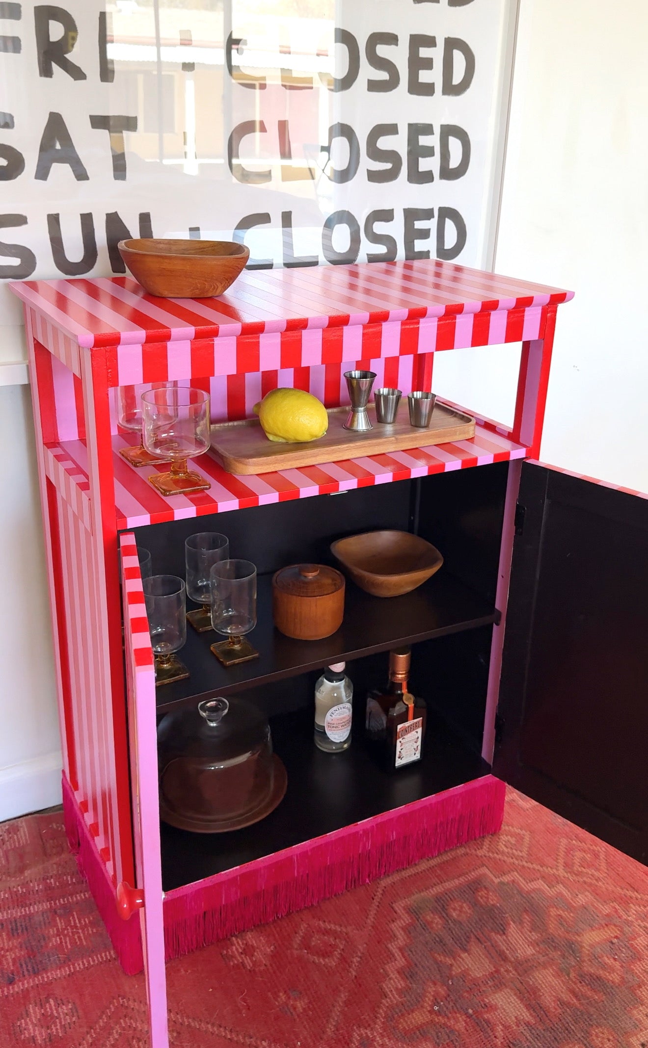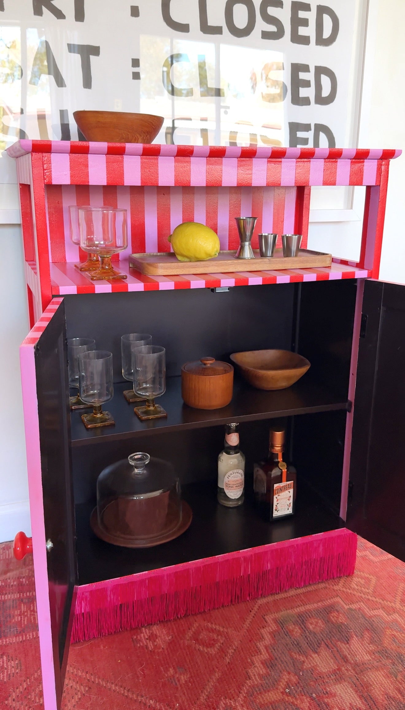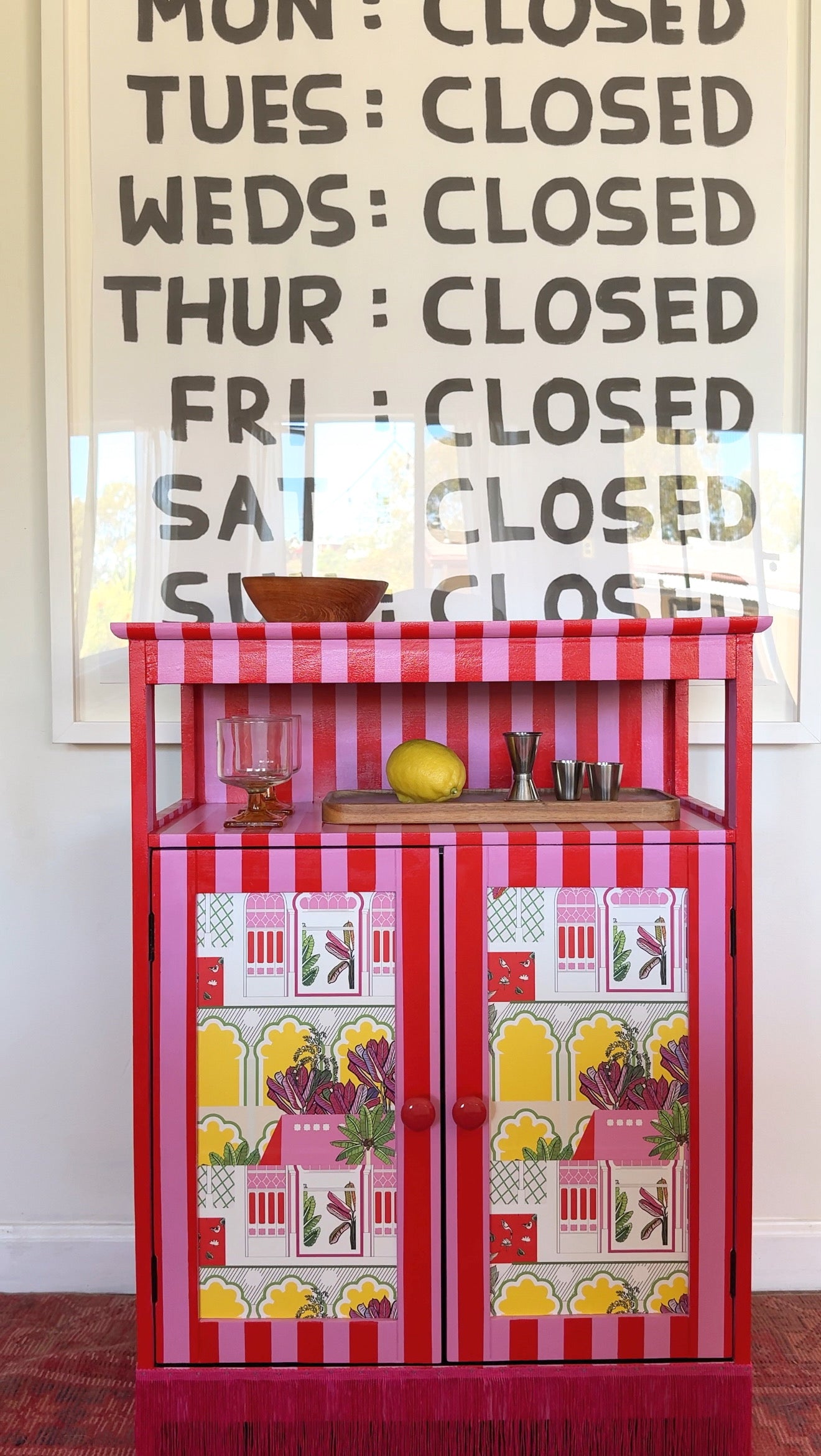 Hand-painted eclectic piece with pink fringe bottom. Brighten up your space and get creative with its dual function as a bar cabinet. Perfect for those who like to add some fun (and cocktails) into their home decor!