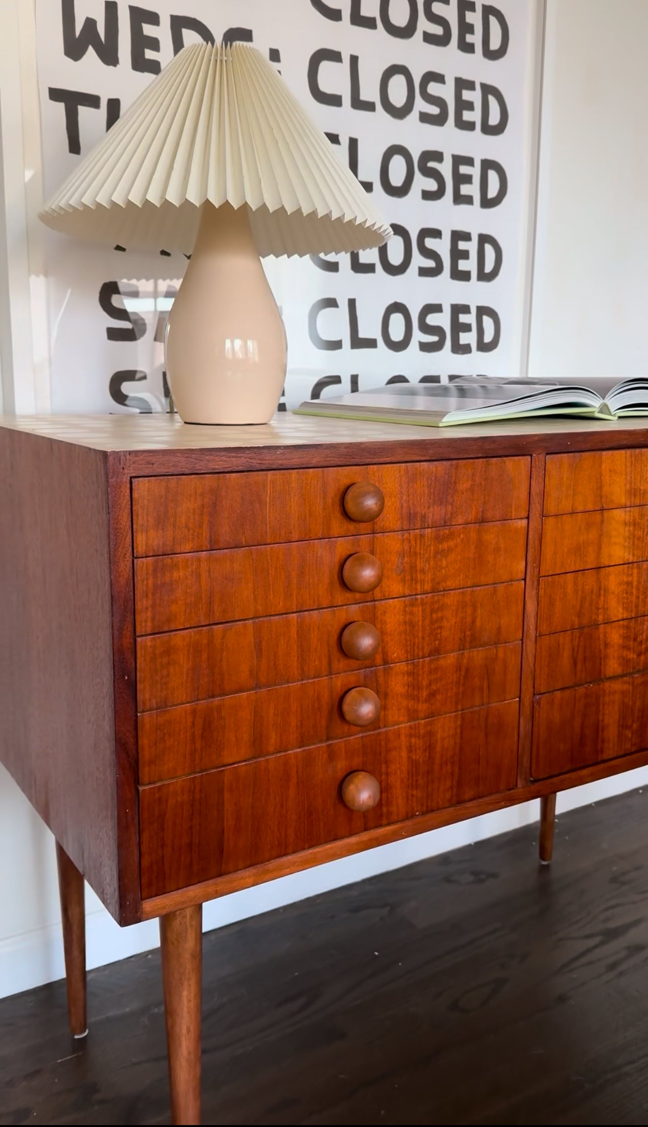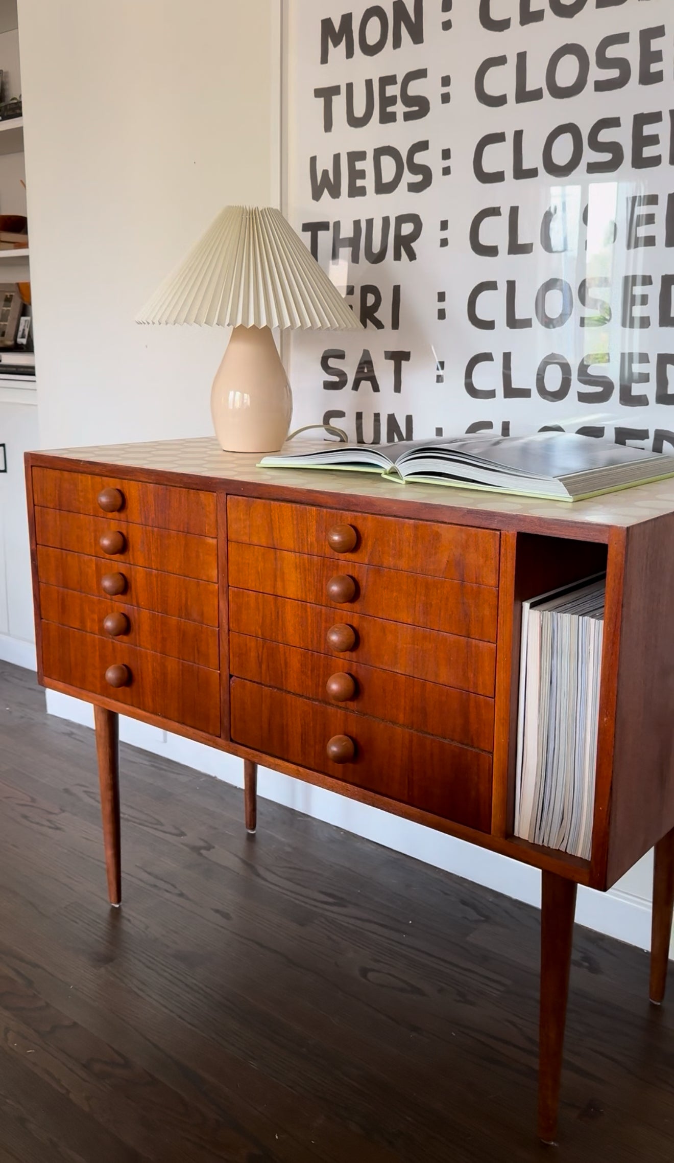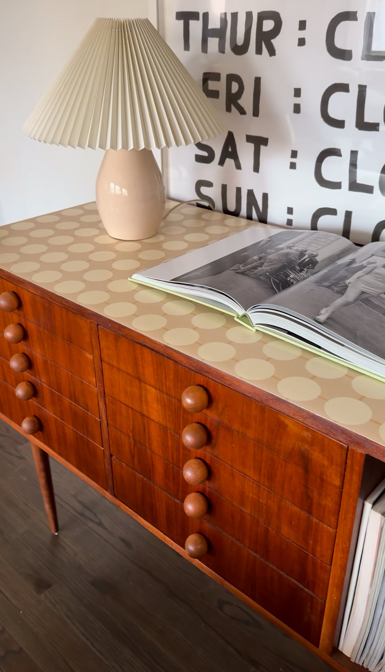 The 'Dot Cabinet' is the perfect blend of style and functionality. With its mid century modern design, this wood cabinet offers 10 deep/spacious drawers with hand-stained knobs, along with a side cubby for storing records or magazines. The depth of the piece is also ideal for a record player. Plus, the hand painted dot details on top add a quirky, yet stylish touch.