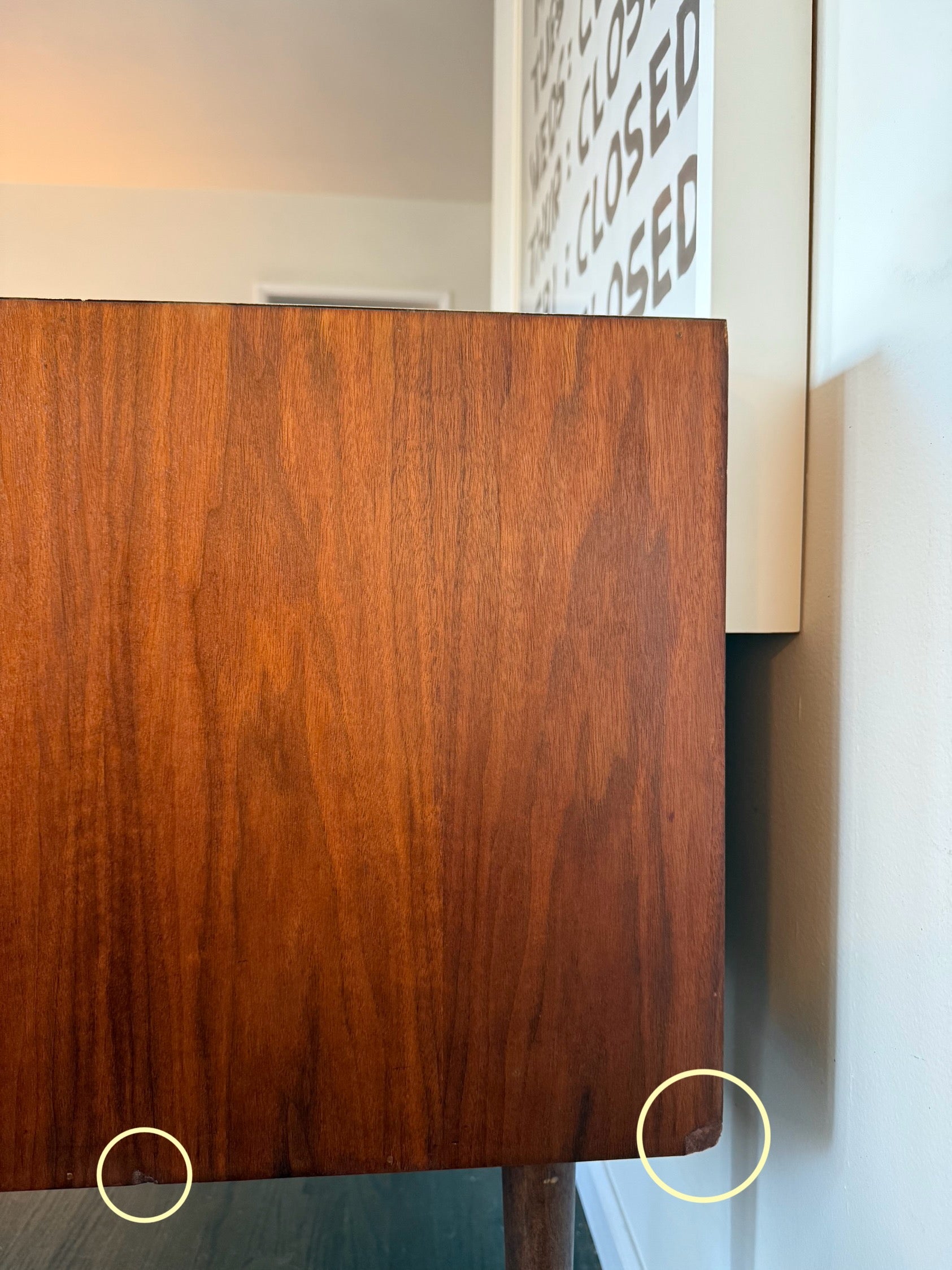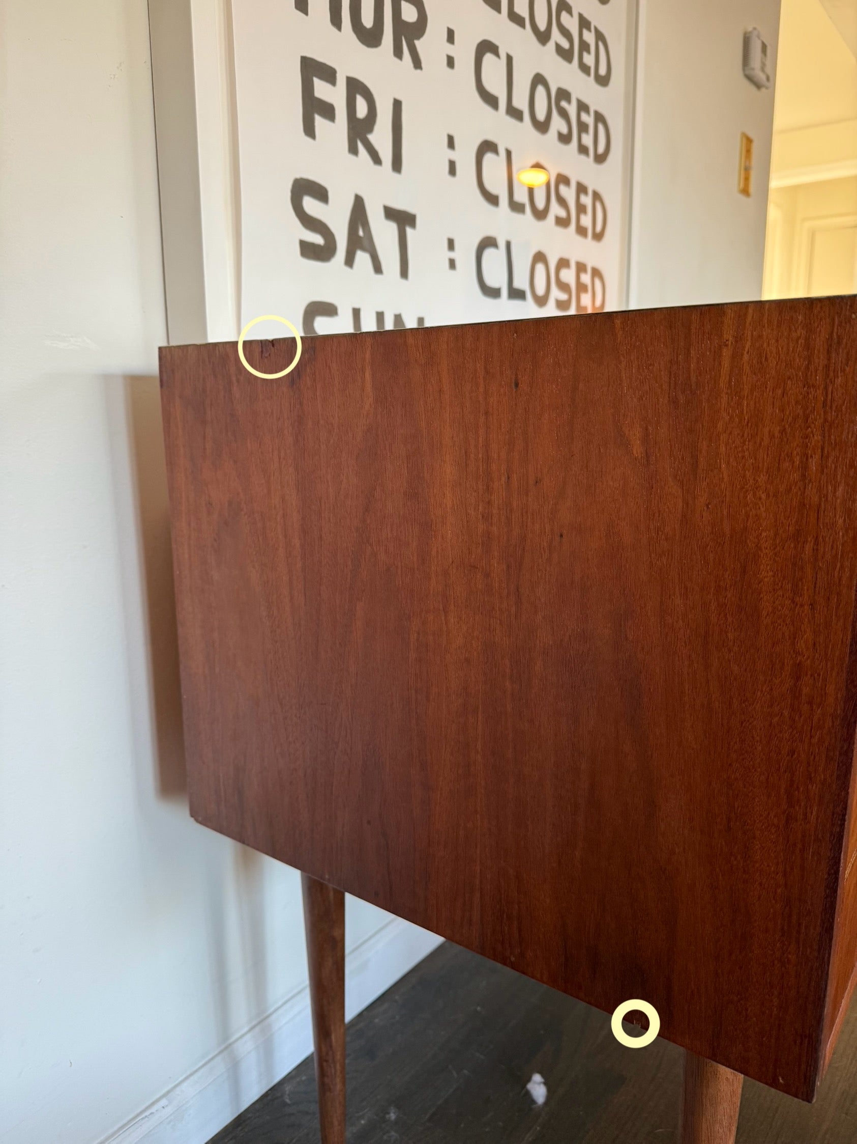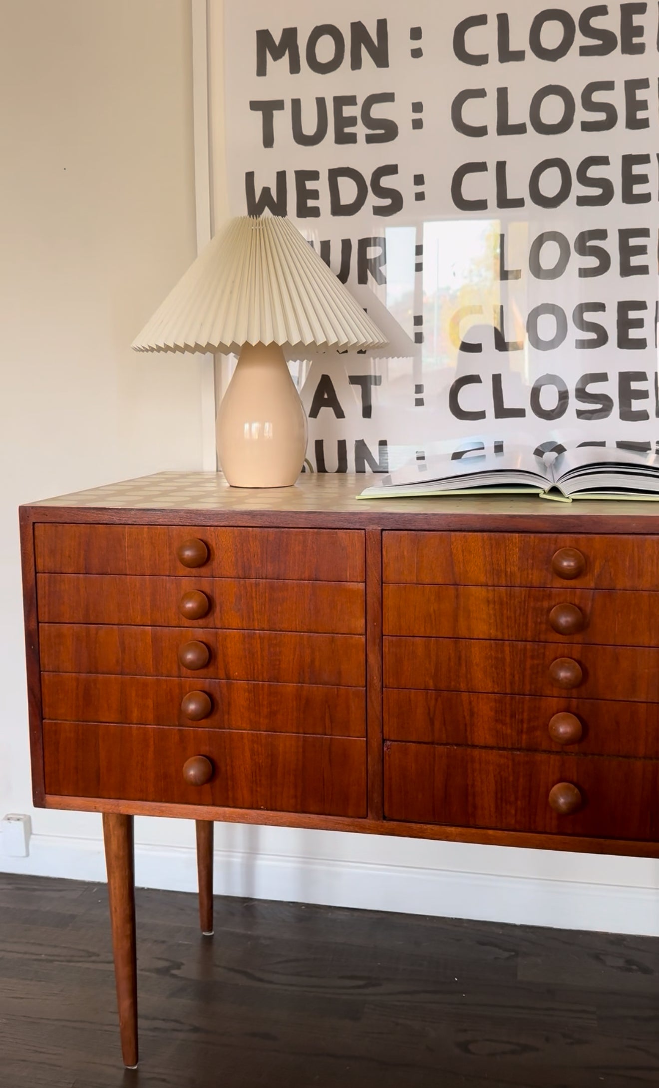 The 'Dot Cabinet' is the perfect blend of style and functionality. With its mid century modern design, this wood cabinet offers 10 deep/spacious drawers with hand-stained knobs, along with a side cubby for storing records or magazines. The depth of the piece is also ideal for a record player. Plus, the hand painted dot details on top add a quirky, yet stylish touch.