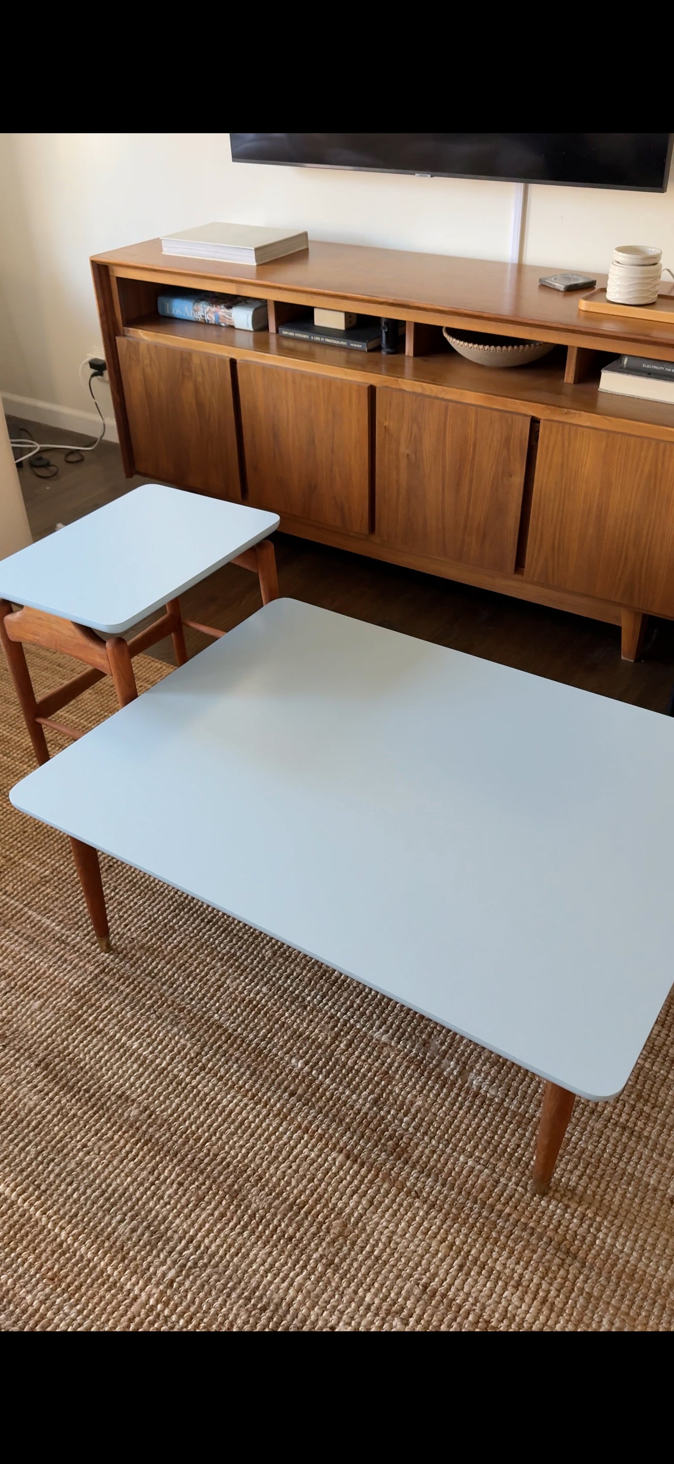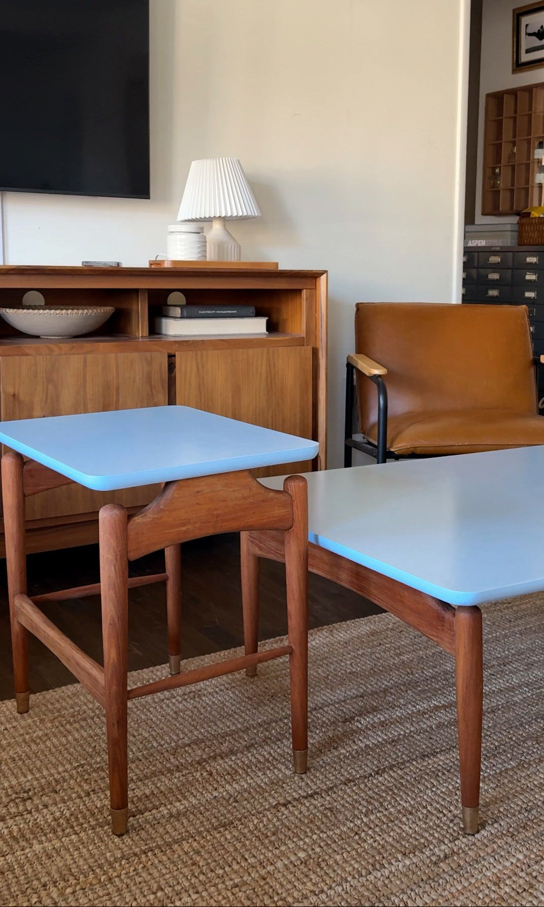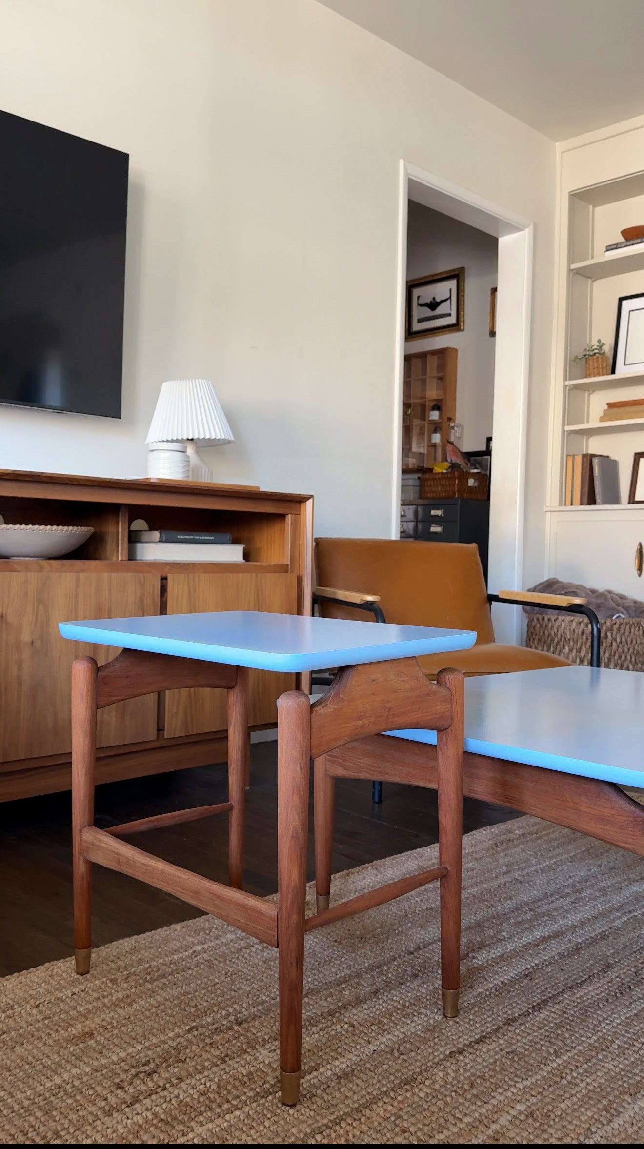 MCM coffee & side table set. Solid wood legs, light blue top, the cutest brass feet. A little Scandinavian poolside moment. (Sold as a set)