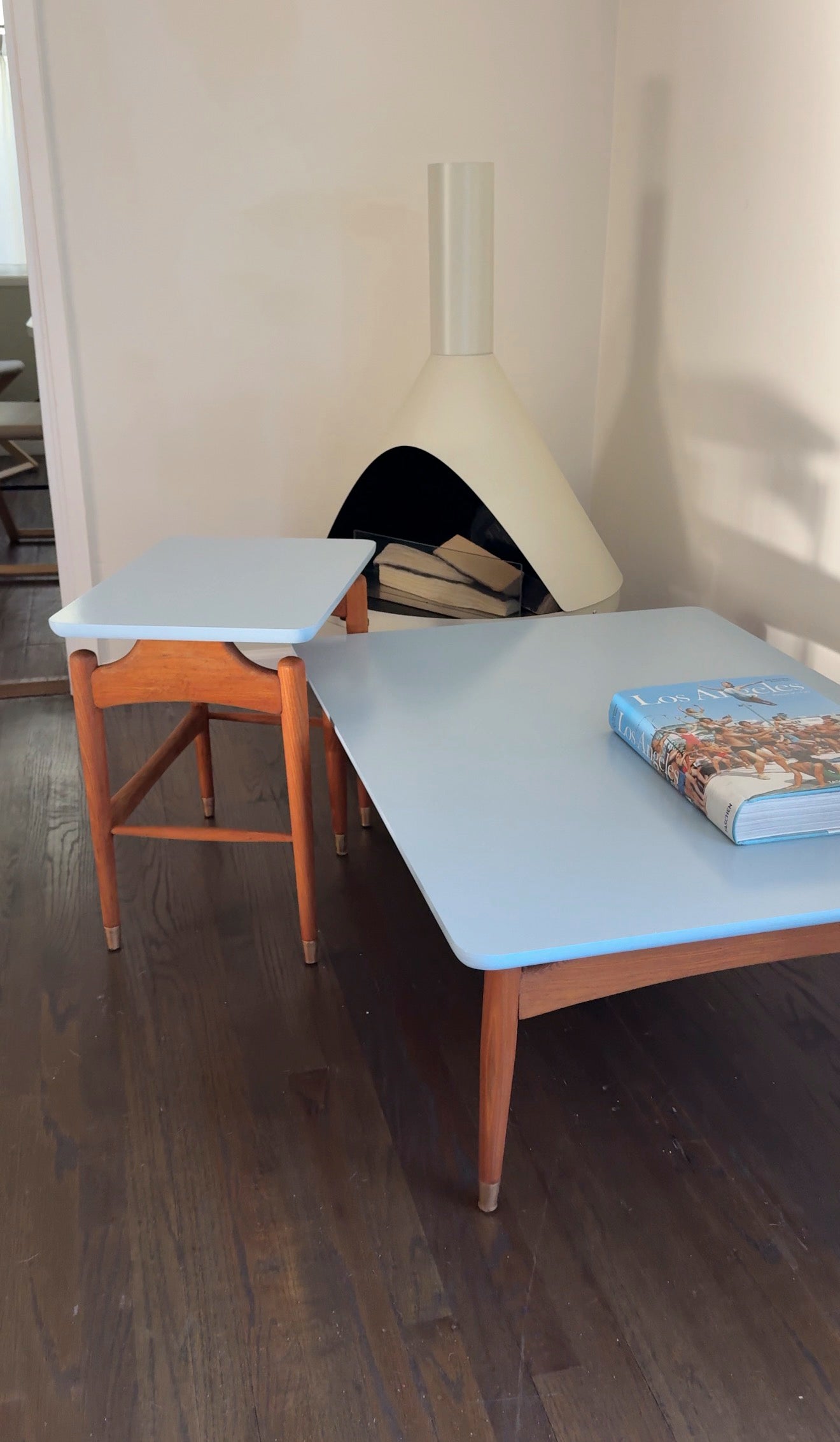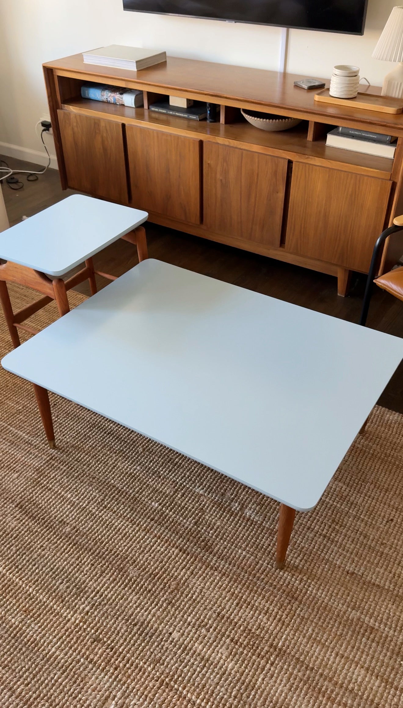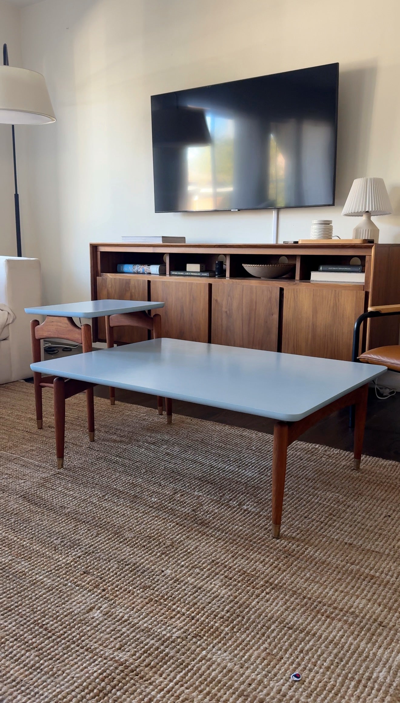 MCM coffee & side table set. Solid wood legs, light blue top, the cutest brass feet. A little Scandinavian poolside moment. (Sold as a set)