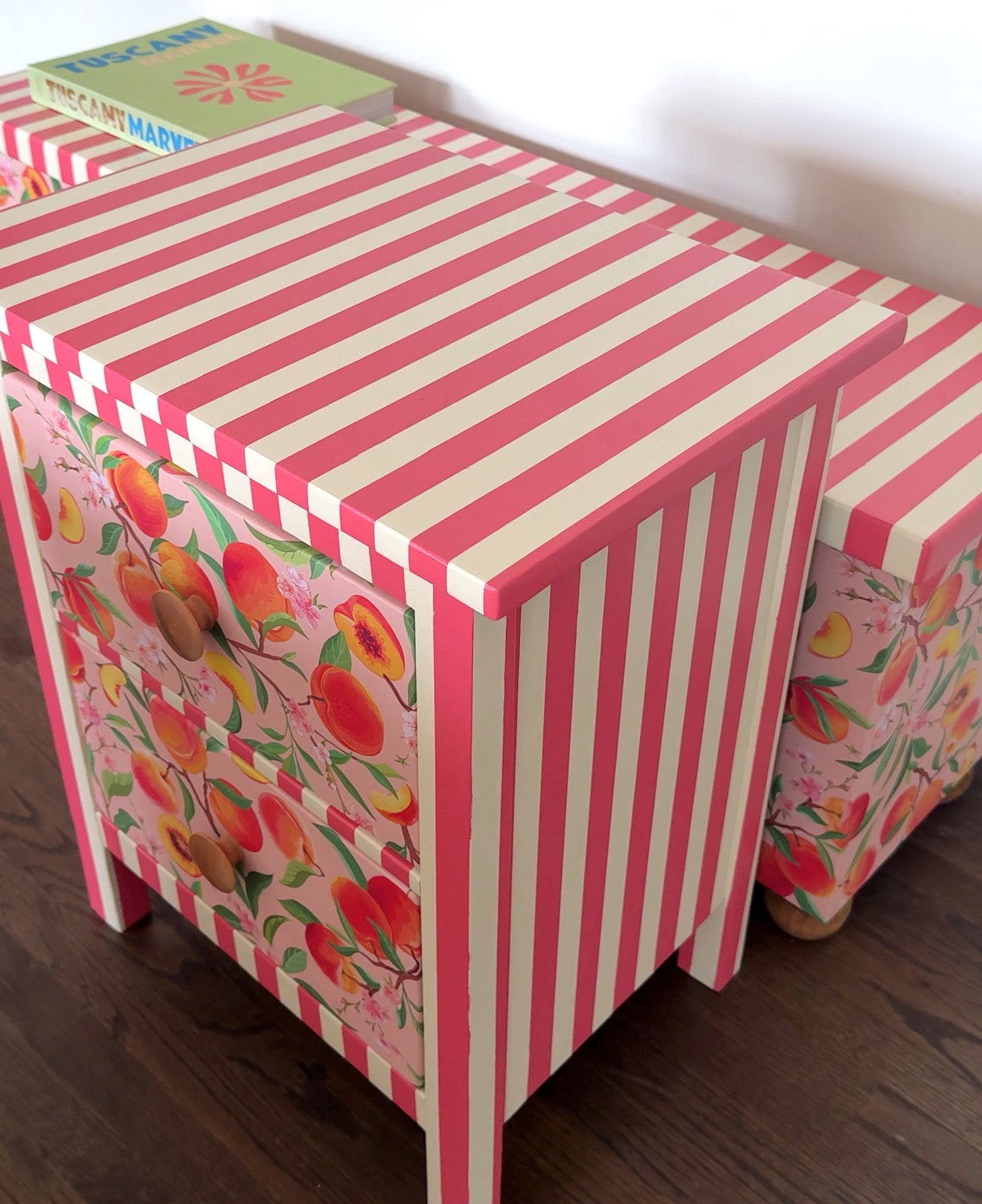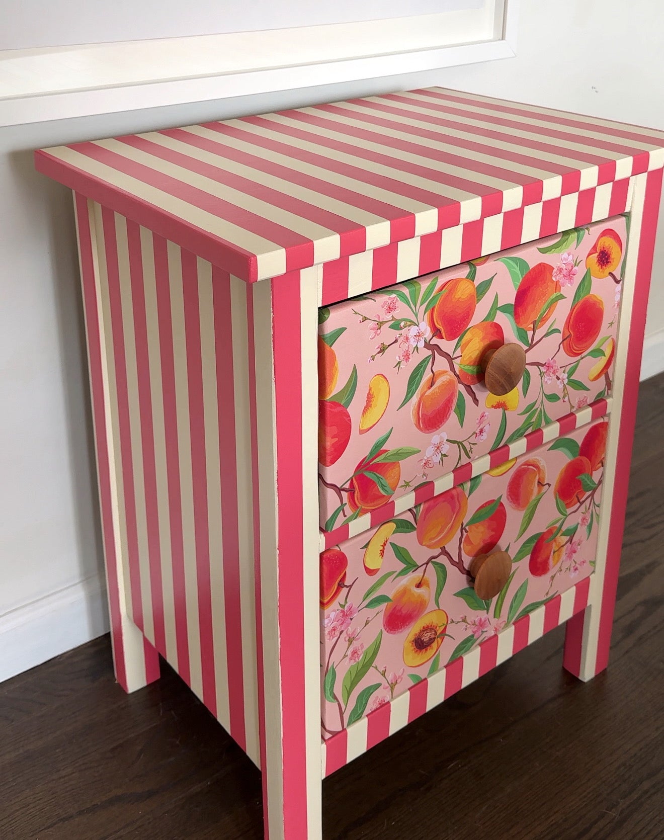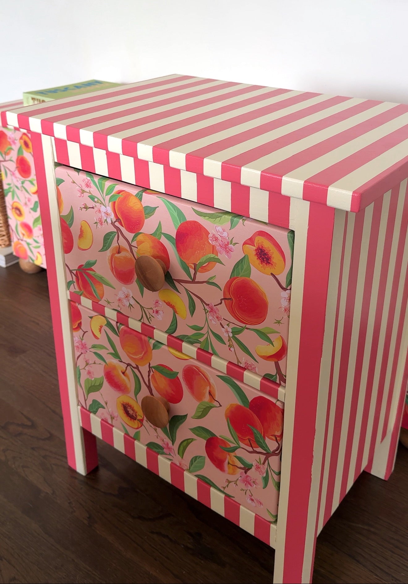A sweet, one-of-a-kind nightstand that brings playful charm to your space. Hand-painted in soft pink and cream stripes, with delicate peach details that tie it all together, this piece is full of personality. The design is fresh, fun, and perfect for adding a pop of summer to any room.