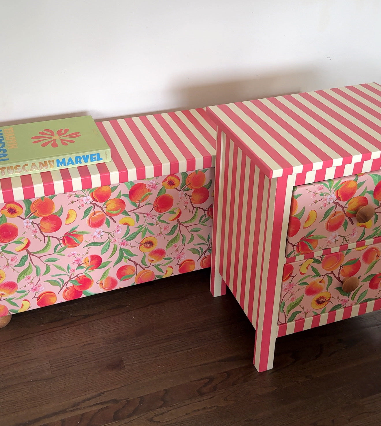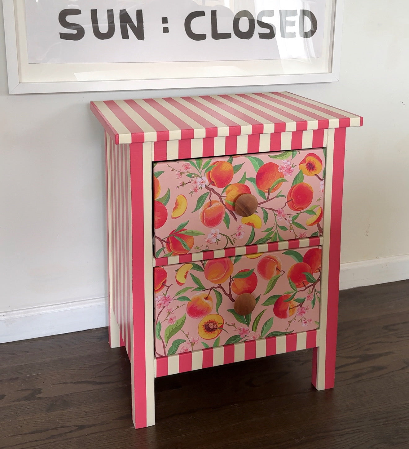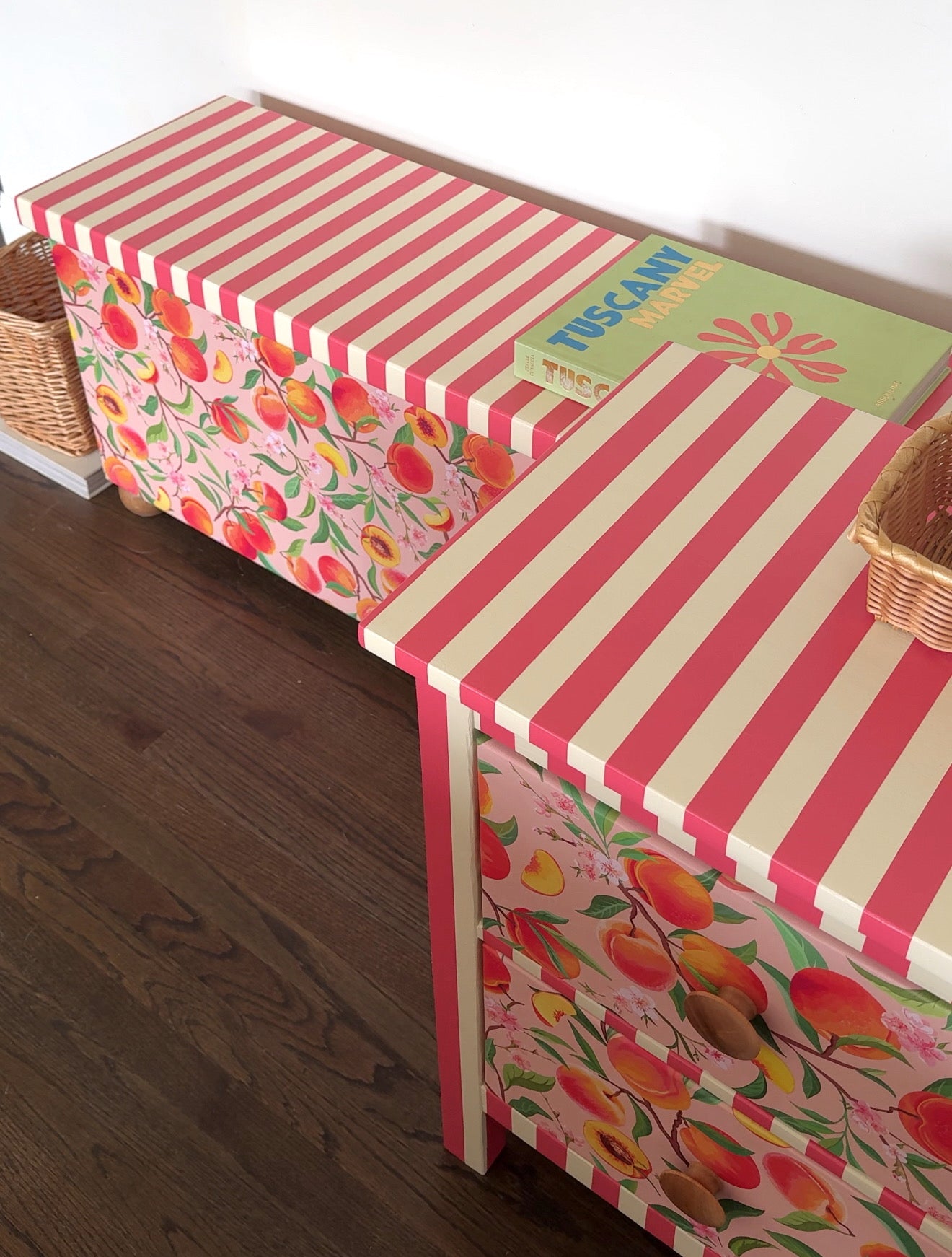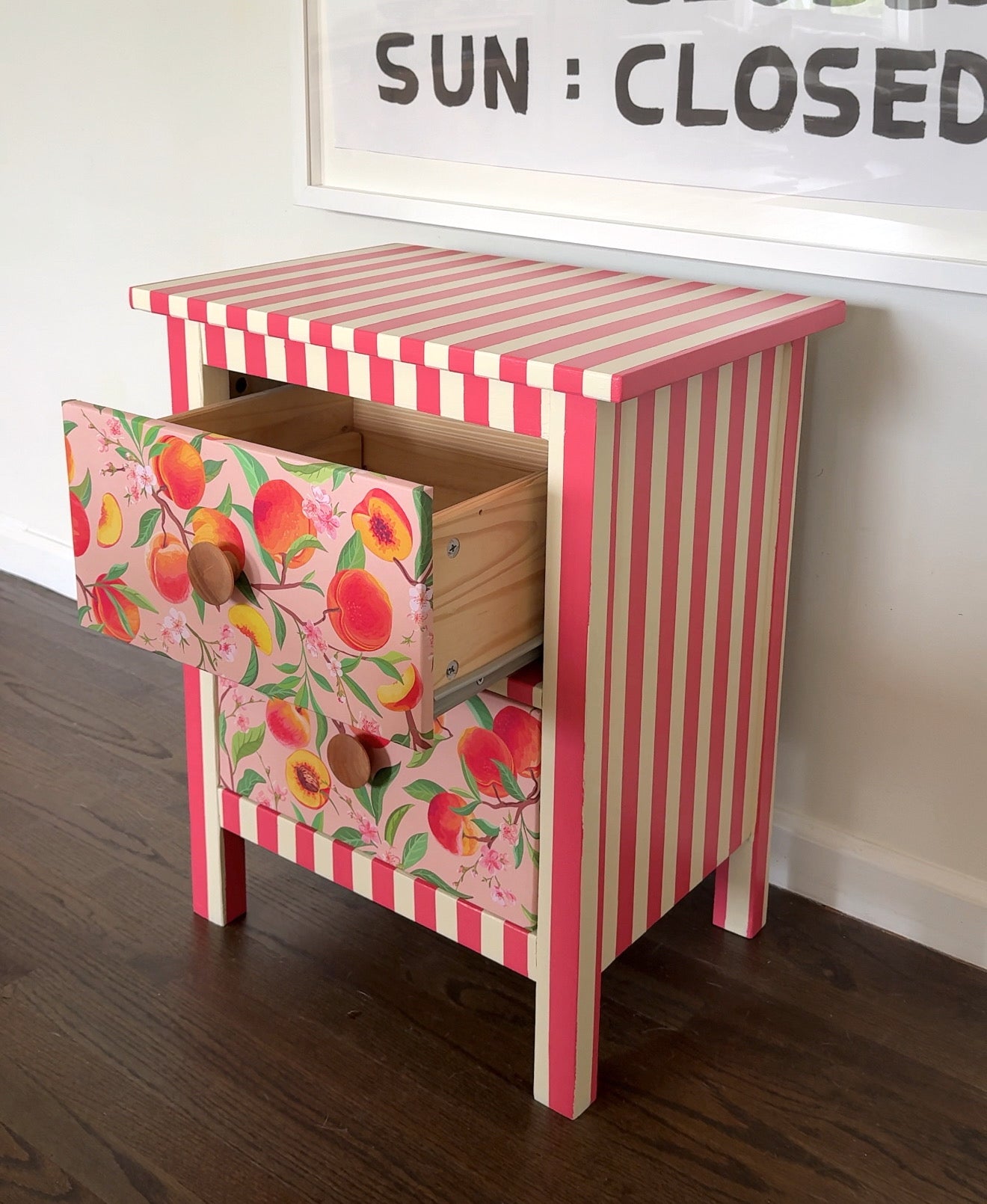 A sweet, one-of-a-kind nightstand that brings playful charm to your space. Hand-painted in soft pink and cream stripes, with delicate peach details that tie it all together, this piece is full of personality. The design is fresh, fun, and perfect for adding a pop of summer to any room.