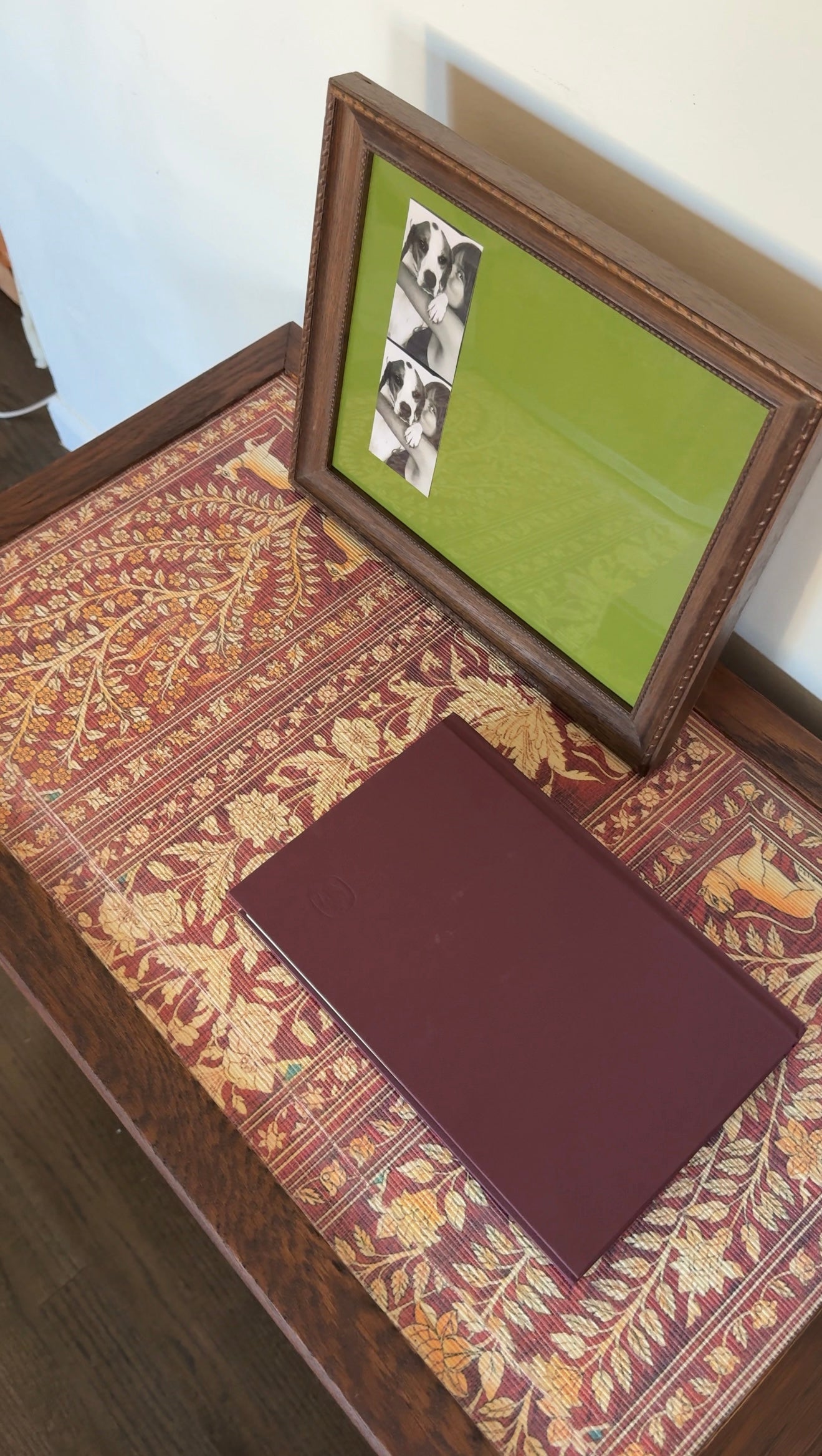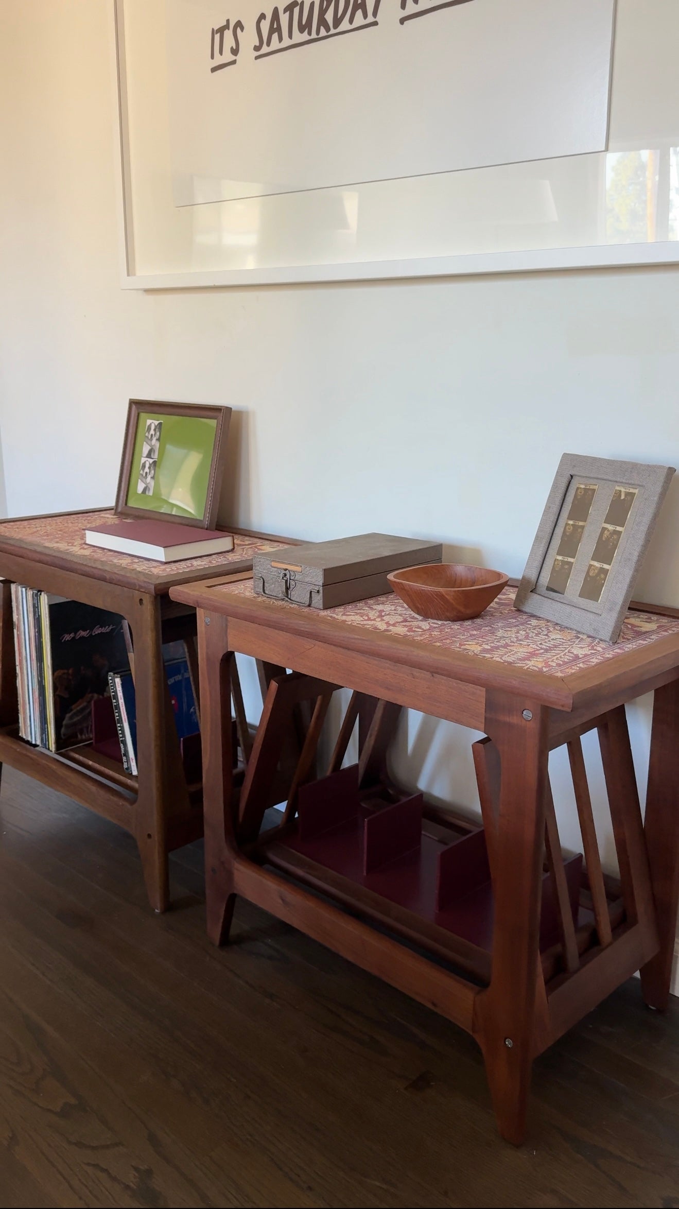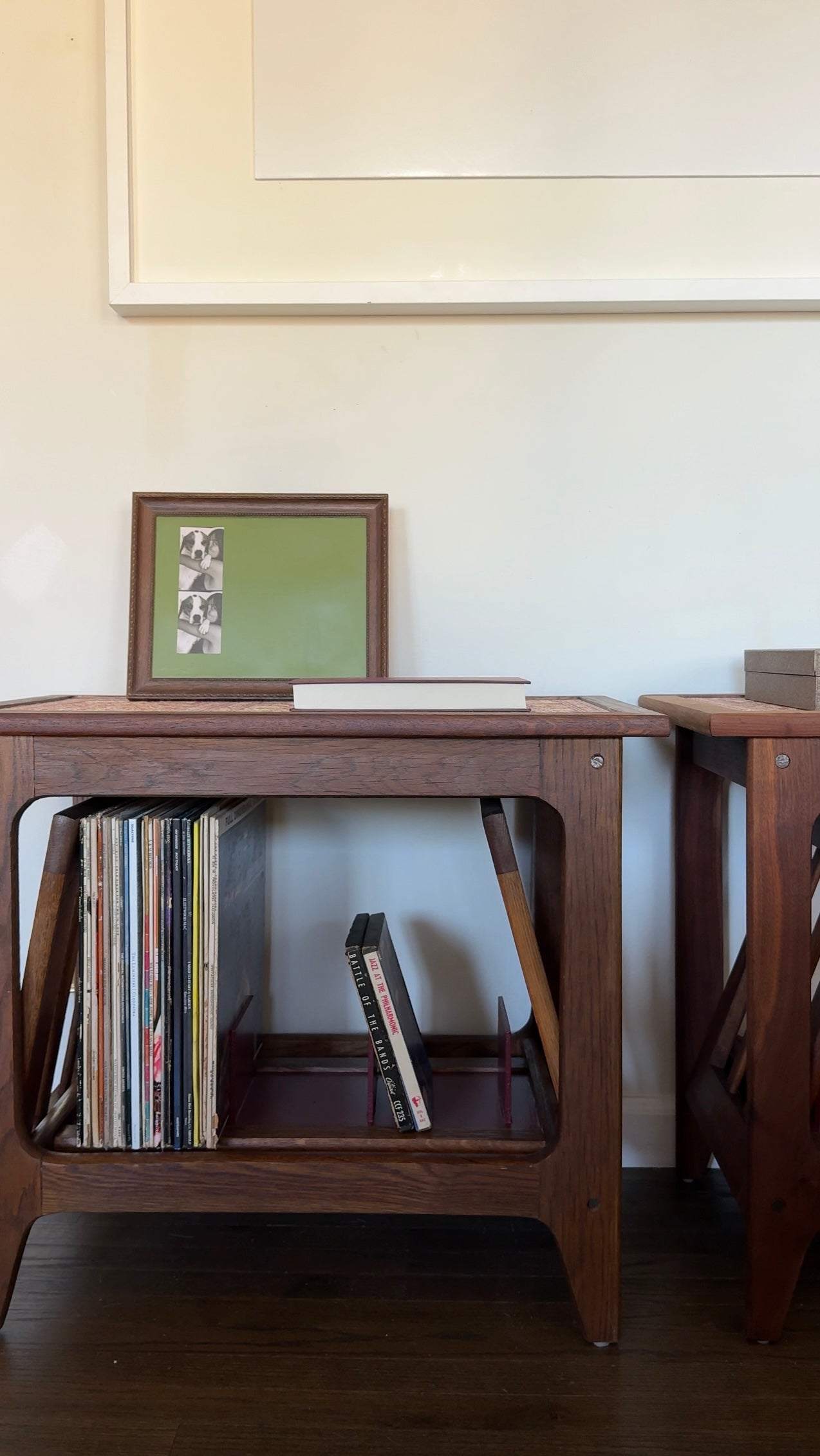 Solid walnut with a moody 70s twist. Topped in vintage-style grasscloth wallpaper and fitted with custom dividers for records, books, or whatever you’re stashing. Designed for late-night spins and lived-in corners.