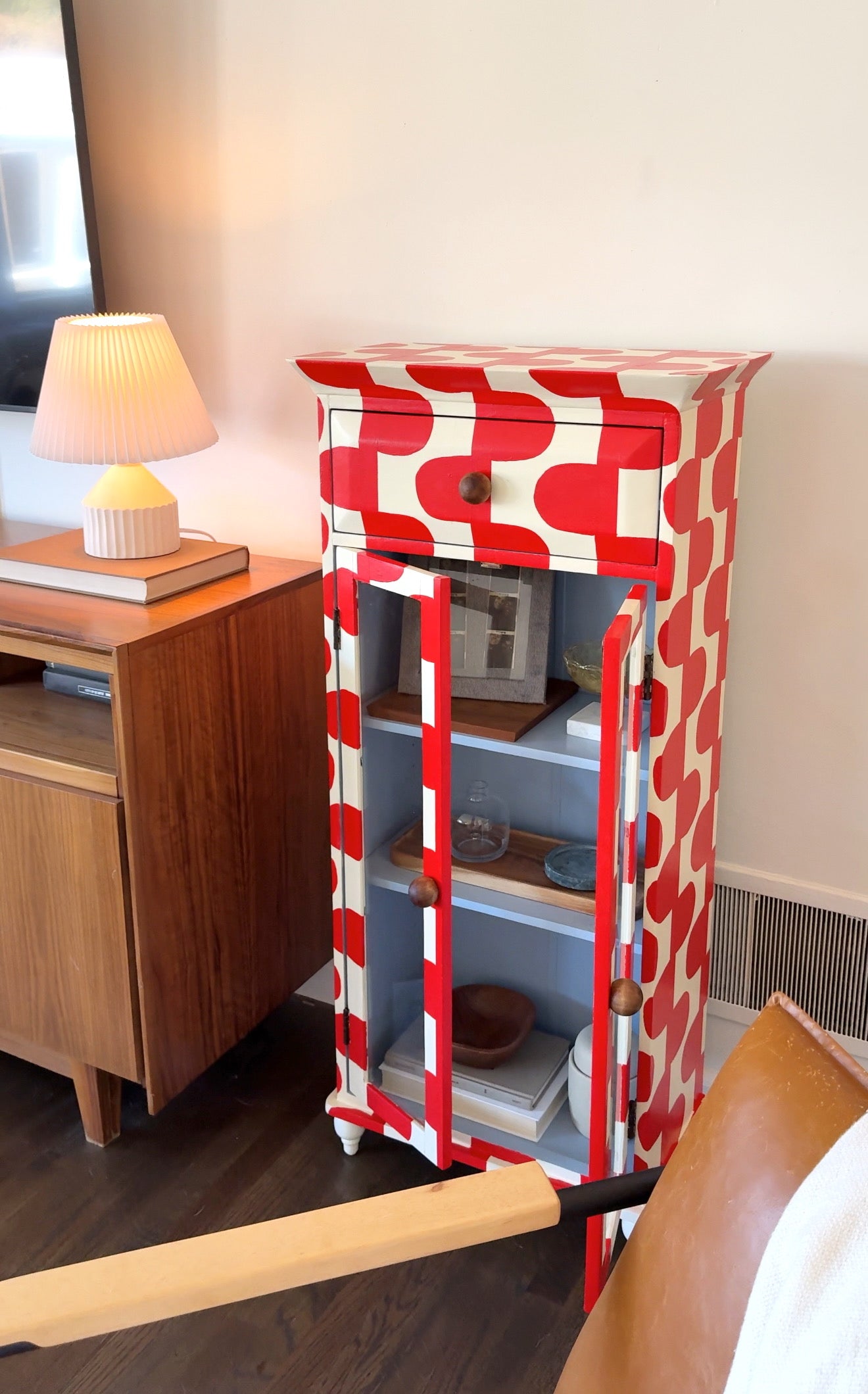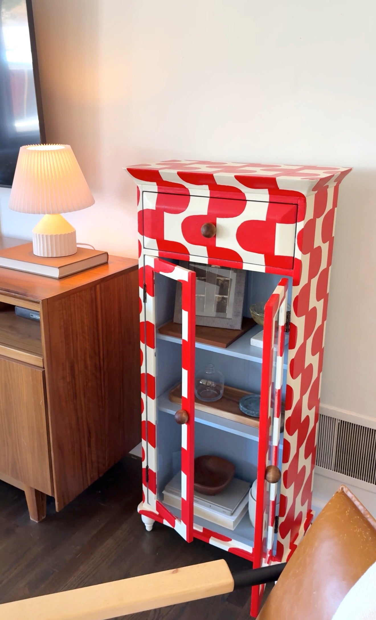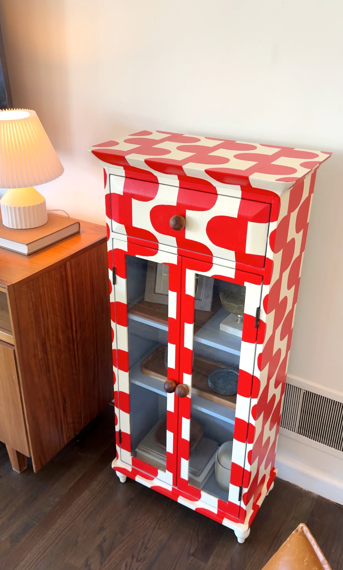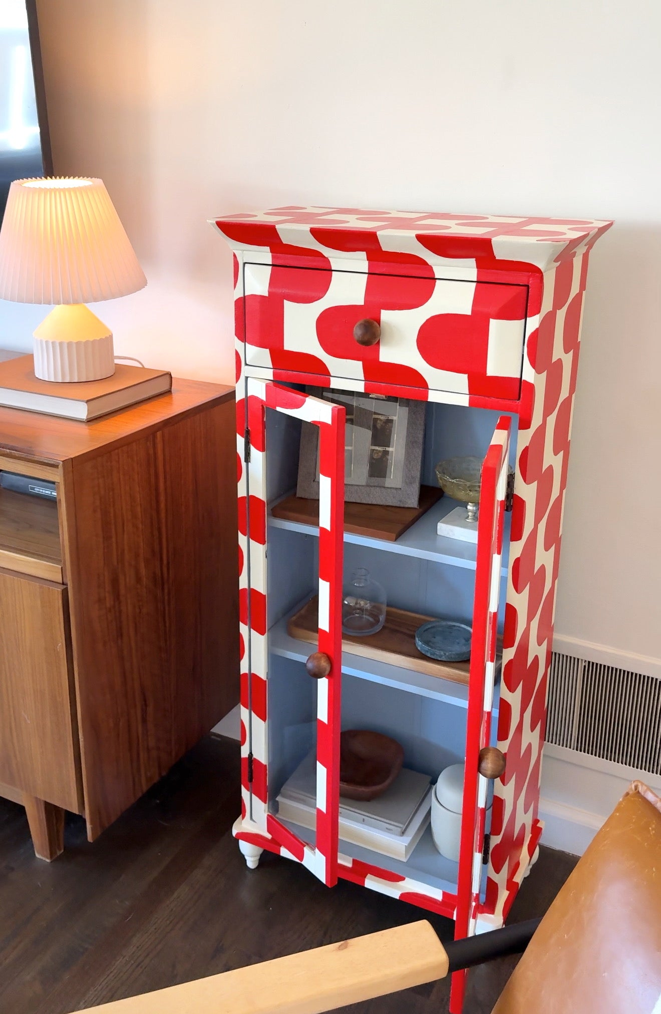 Upgrade your storage with The June Cabinet. This quirky piece boasts a hand-painted red and cream pattern with a surprise baby blue interior. Perfect for displaying your treasures with 2 shelves and glass doors. (Bonus: It adds a pop of color to any room!)