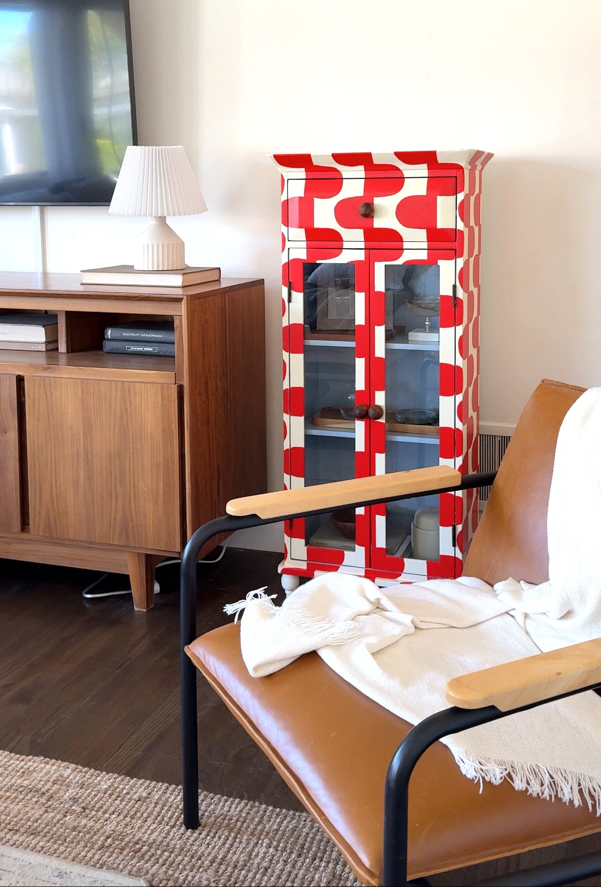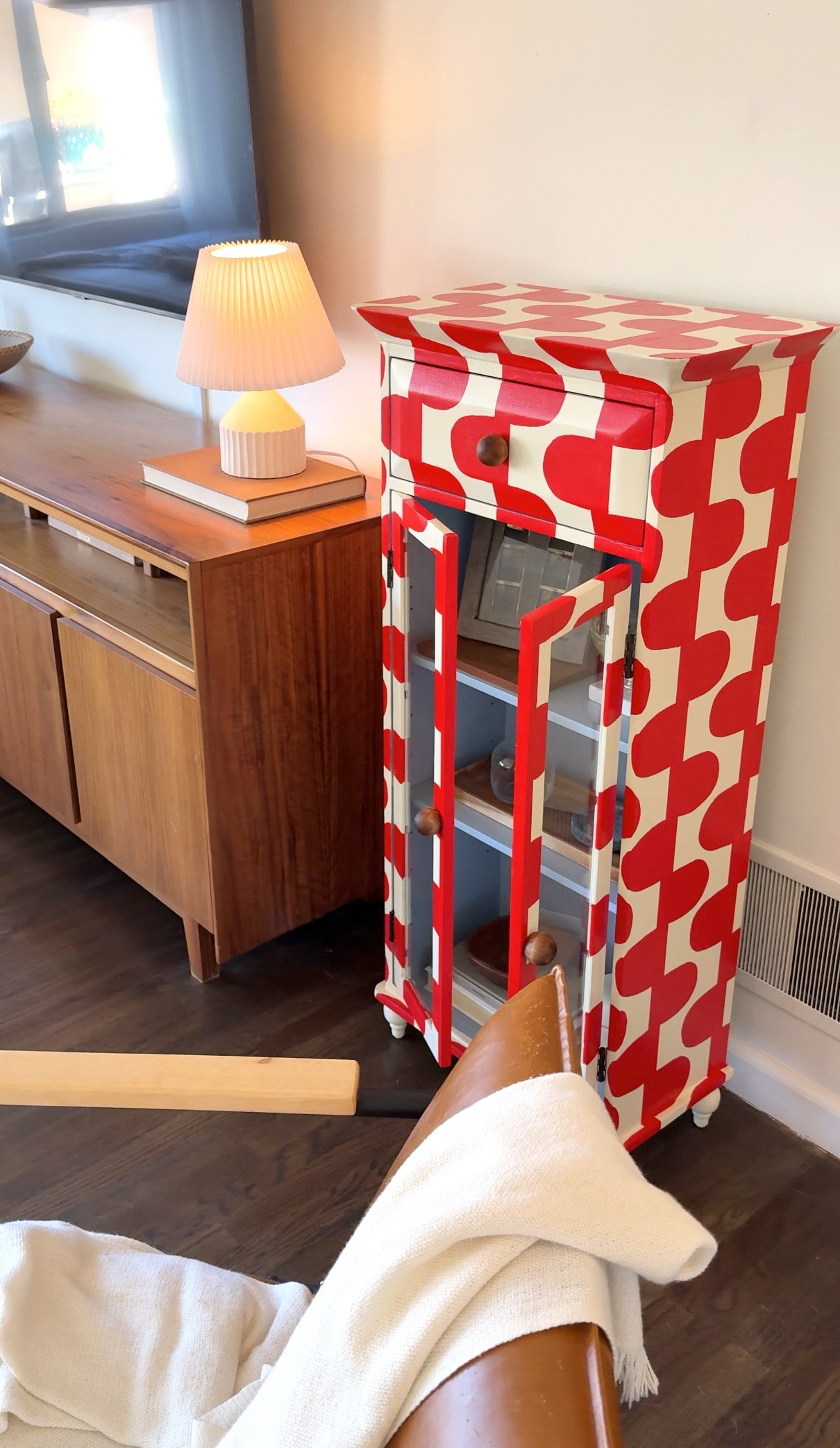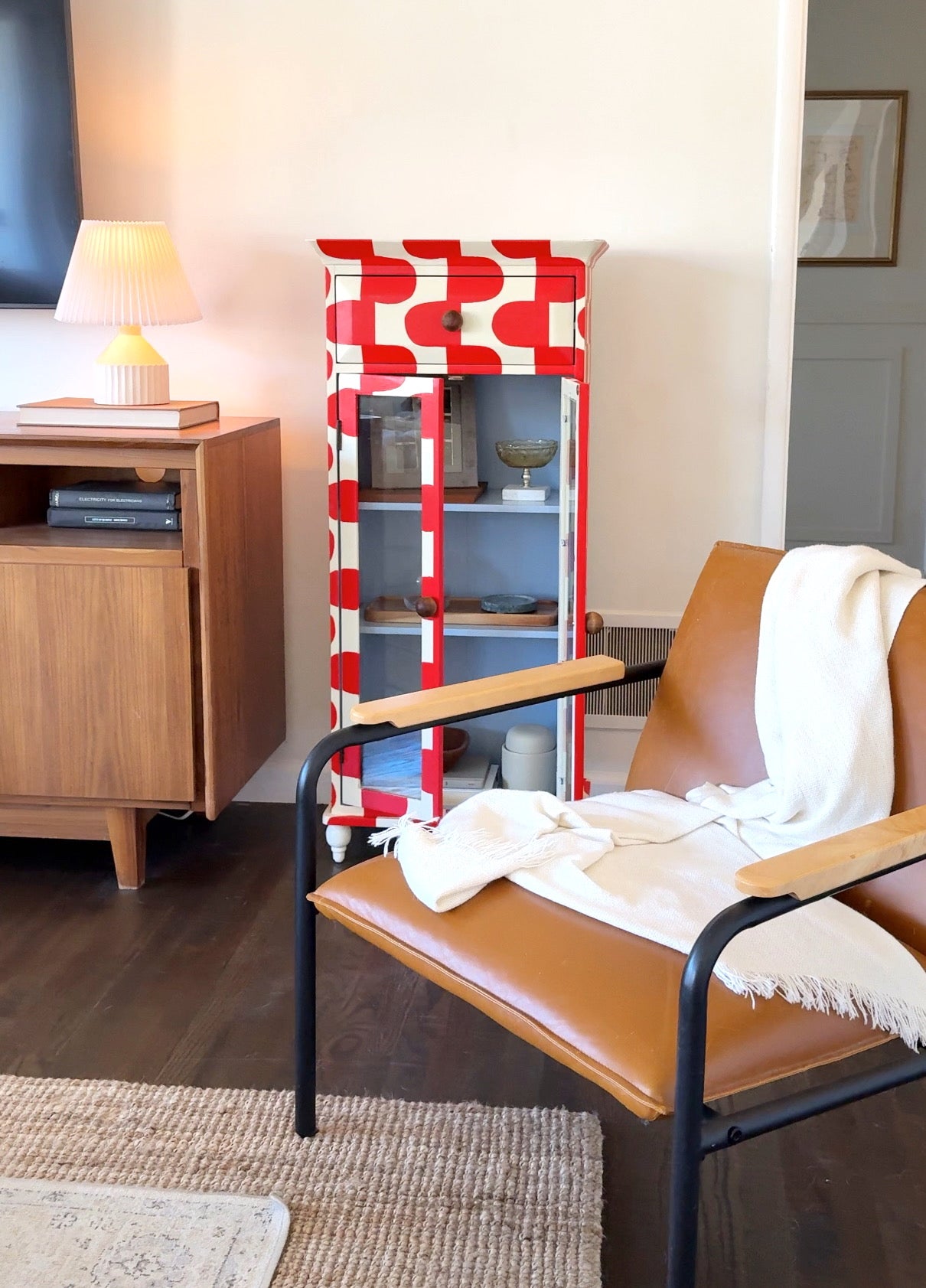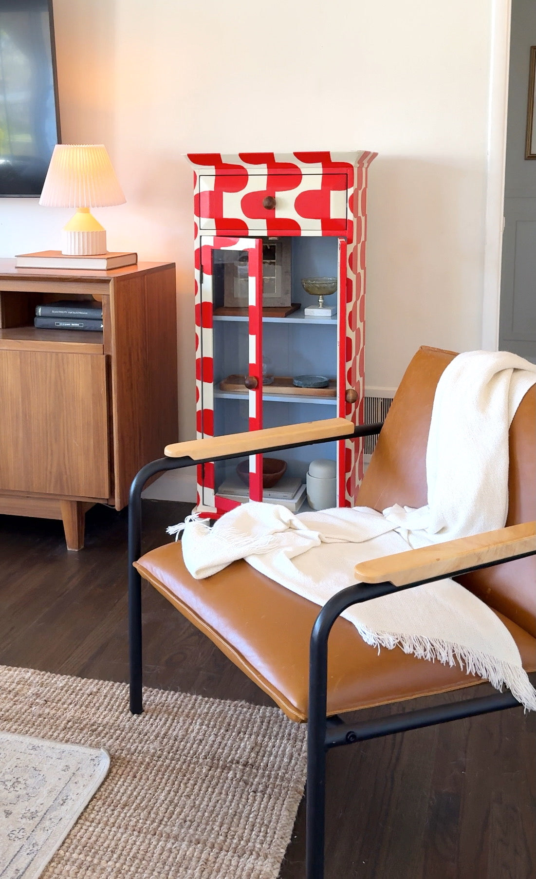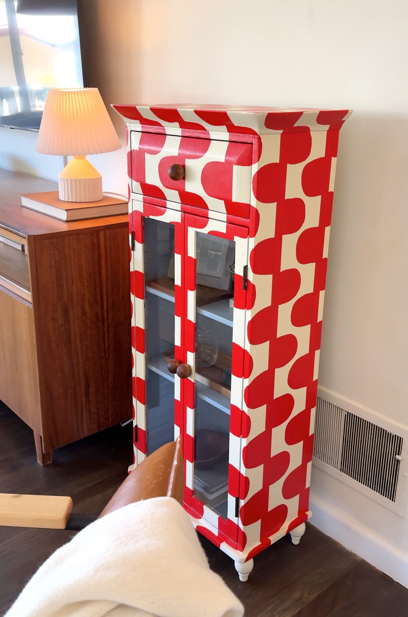 Upgrade your storage with The June Cabinet. This quirky piece boasts a hand-painted red and cream pattern with a surprise baby blue interior. Perfect for displaying your treasures with 2 shelves and glass doors. (Bonus: It adds a pop of color to any room!)