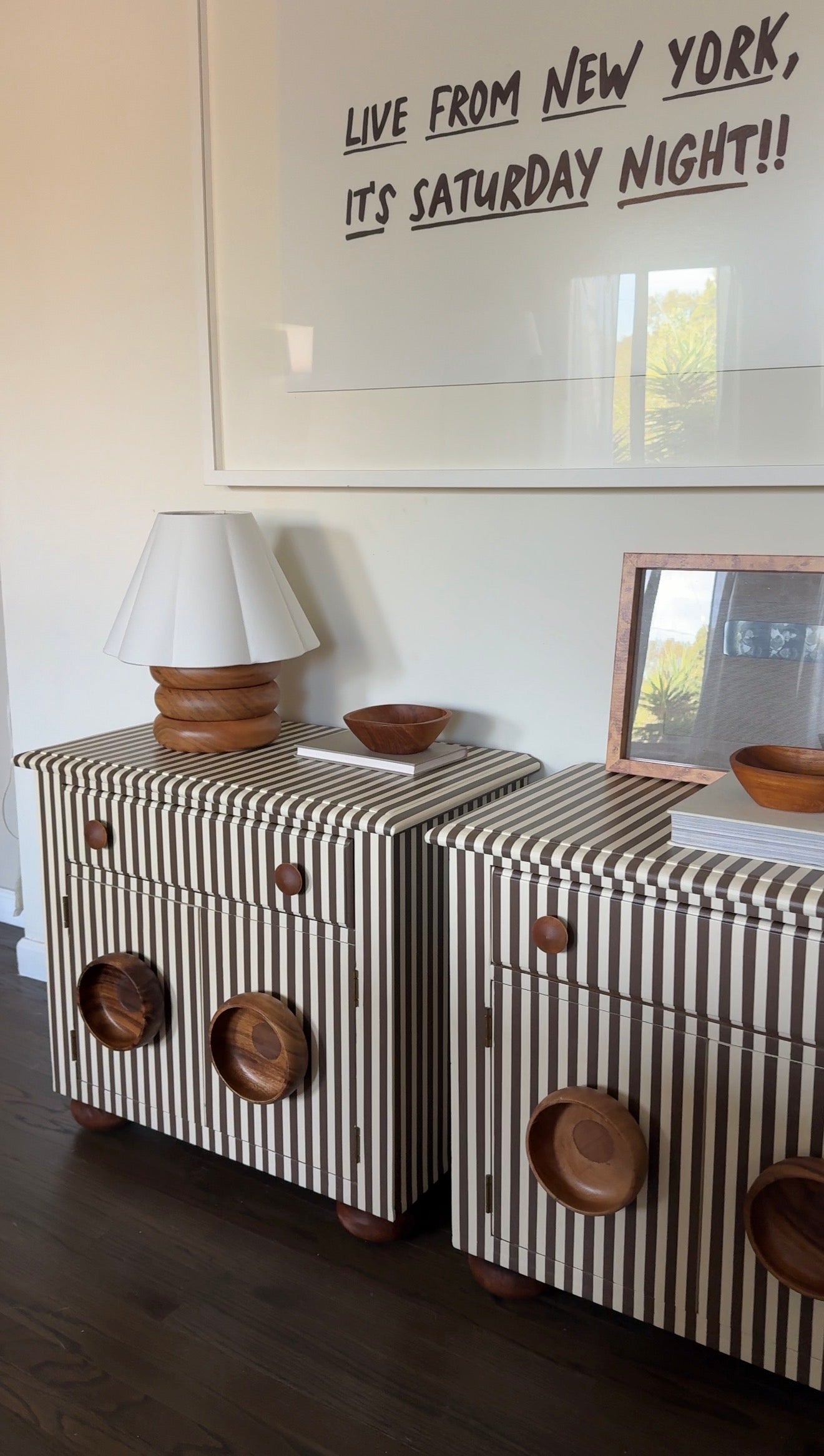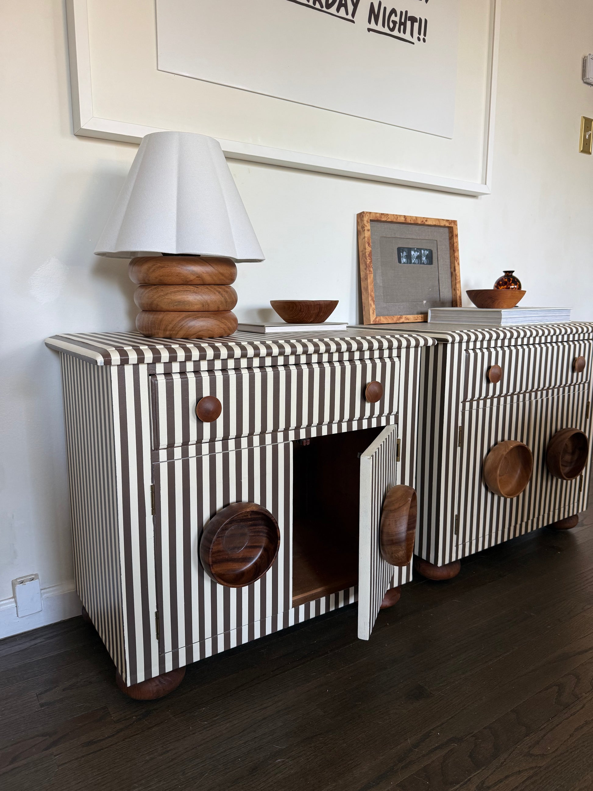 Chocolate + cream stripes, custom walnut wooden knobs and walnut feet. One drawer with 2 door open storage.