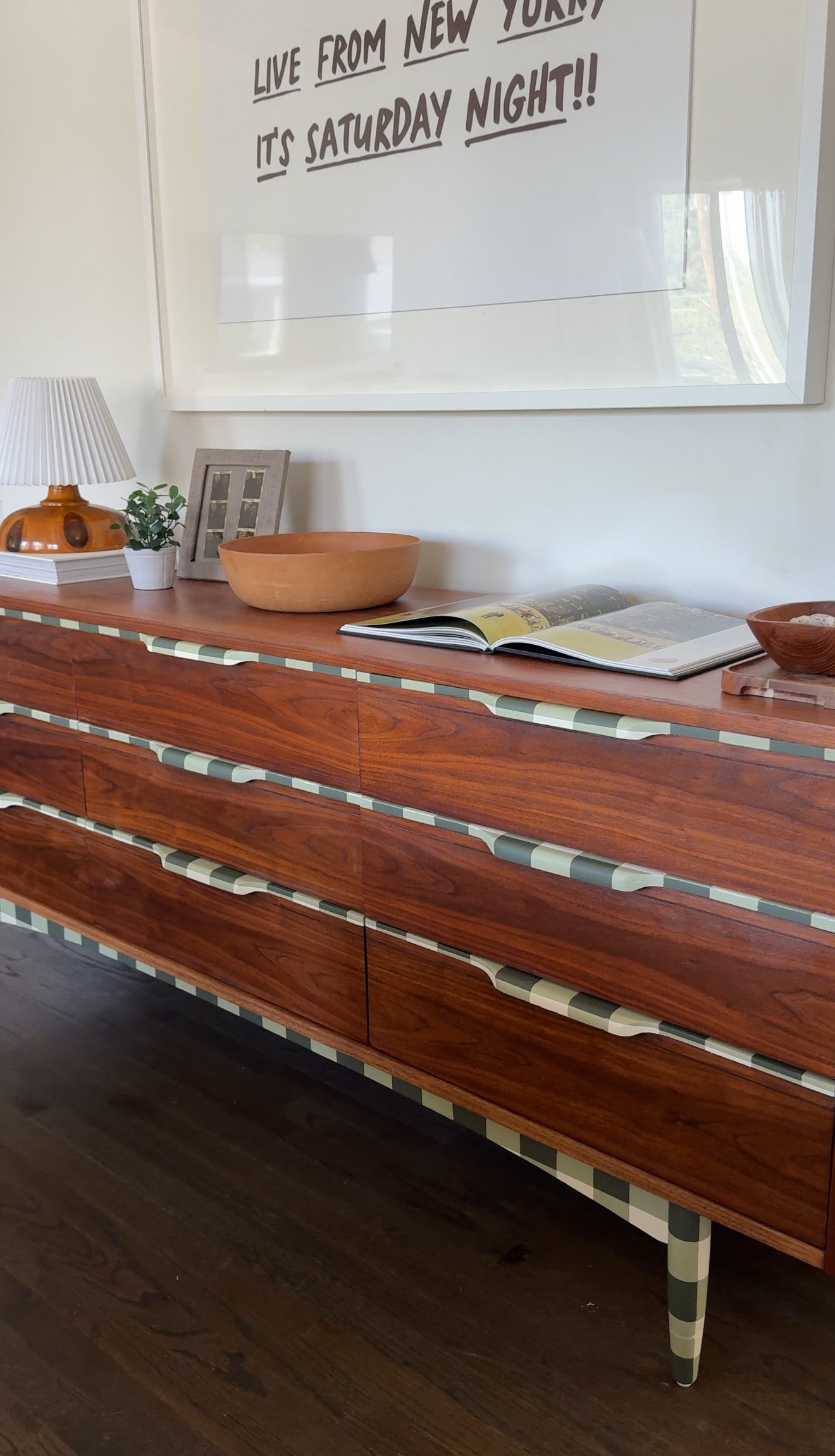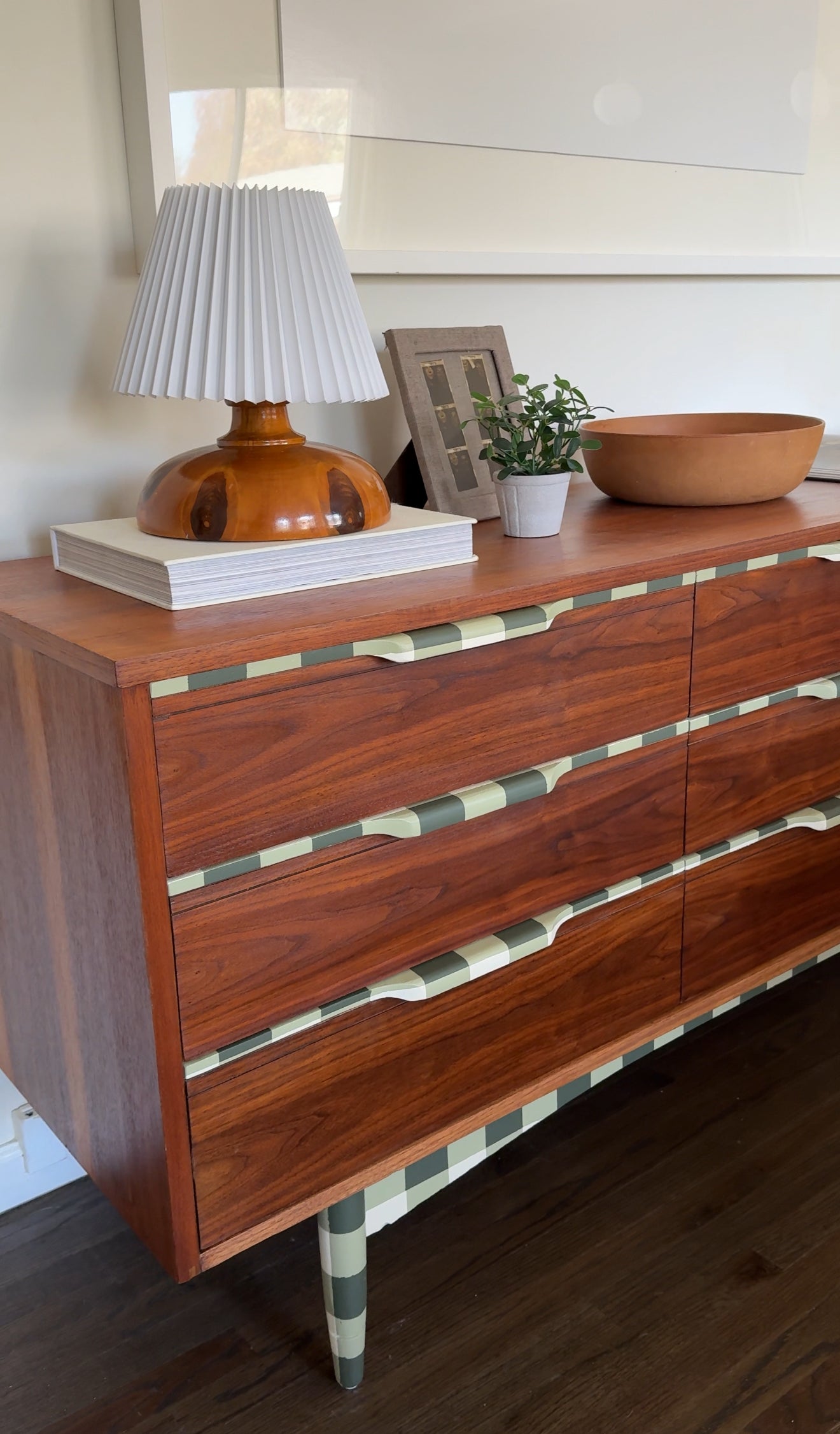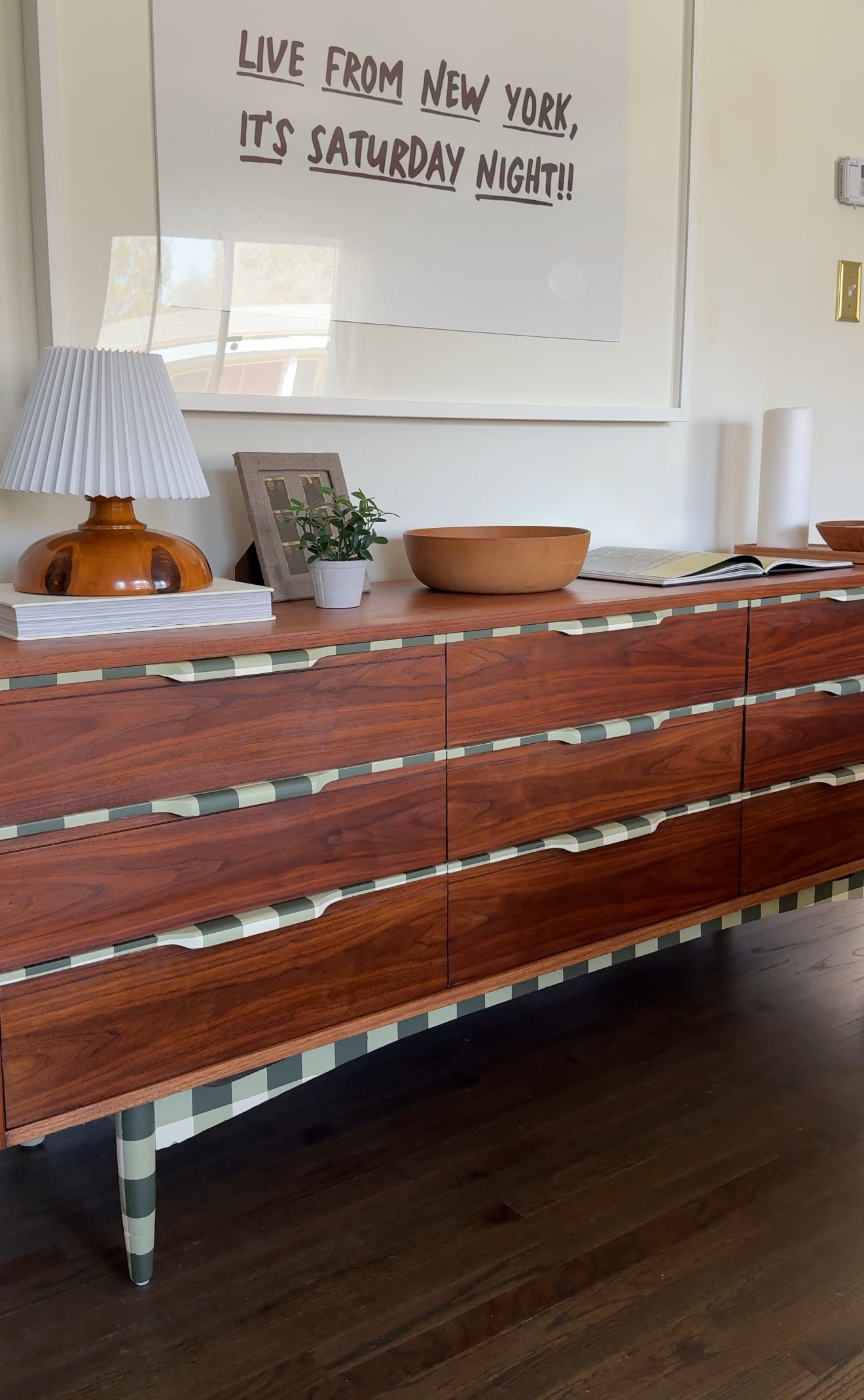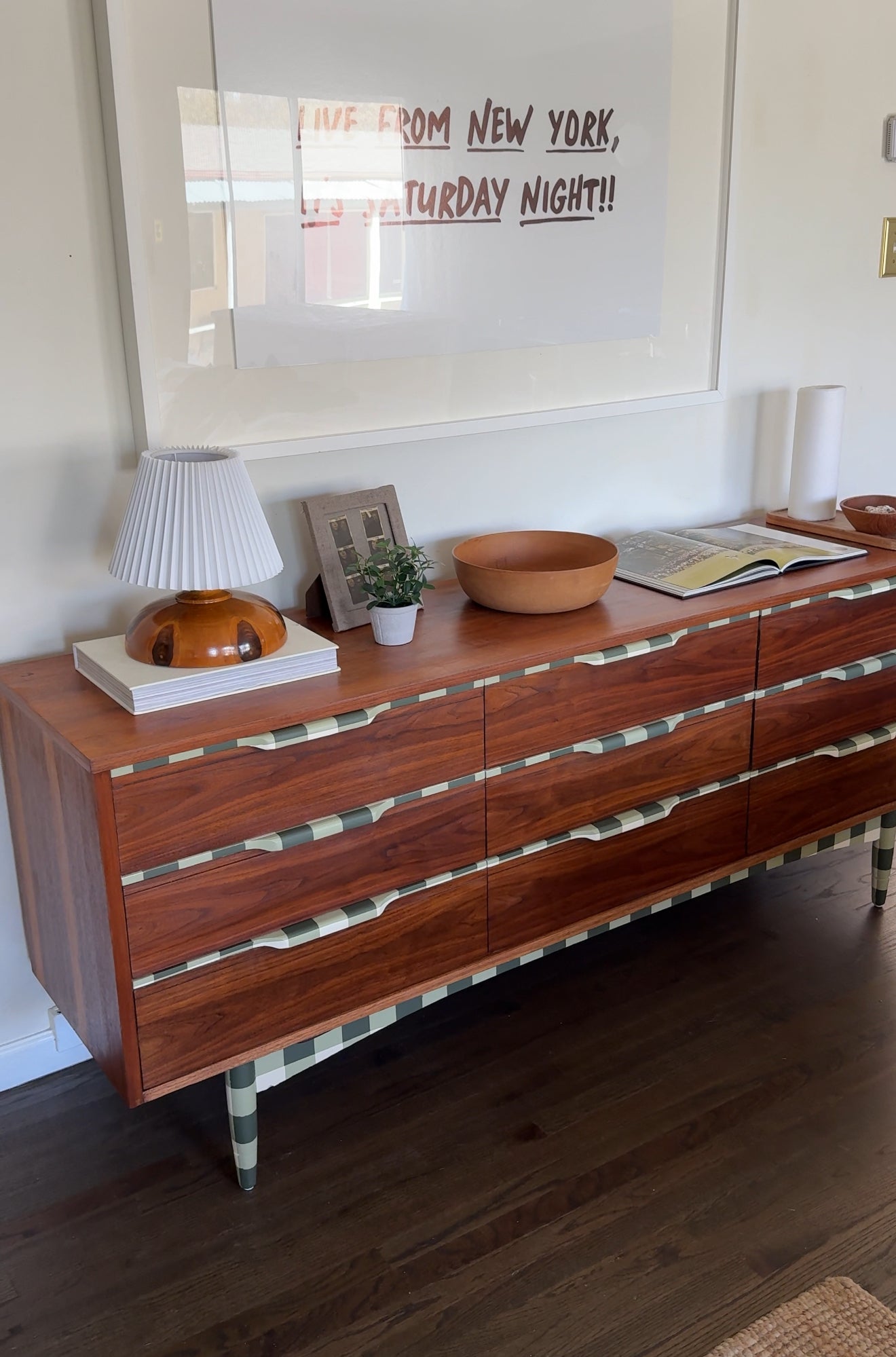 The Monday Dresser is a vintage, mid-century modern piece that boasts 9 spacious drawers for ample storage. Its natural wood construction provides a timeless appeal, while the charming green gingham detailing adds a touch of color and character.