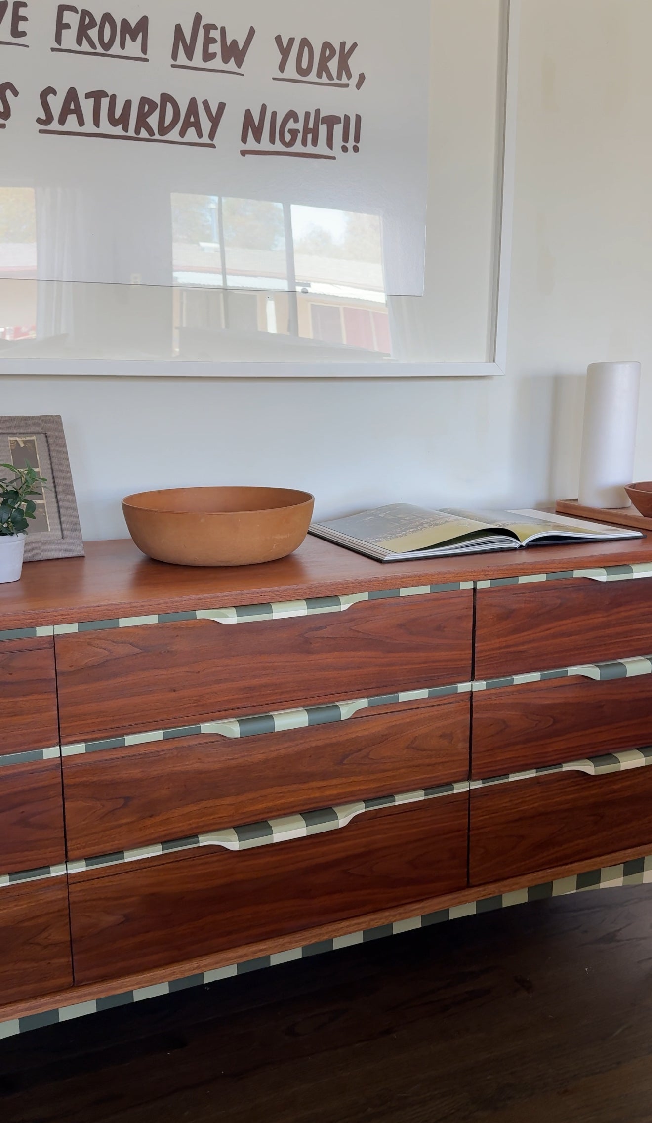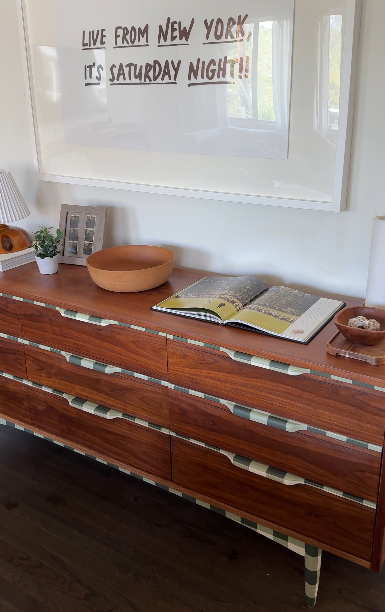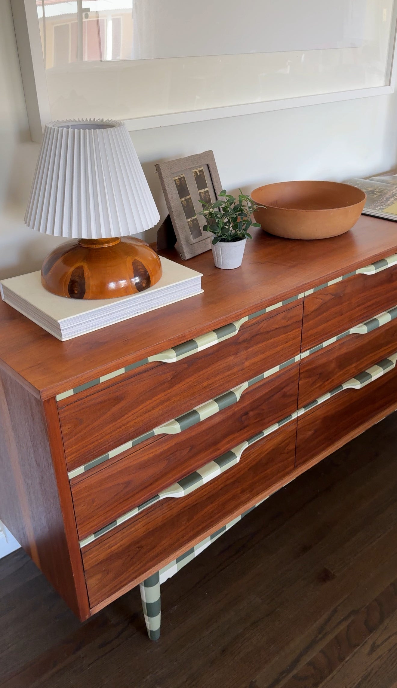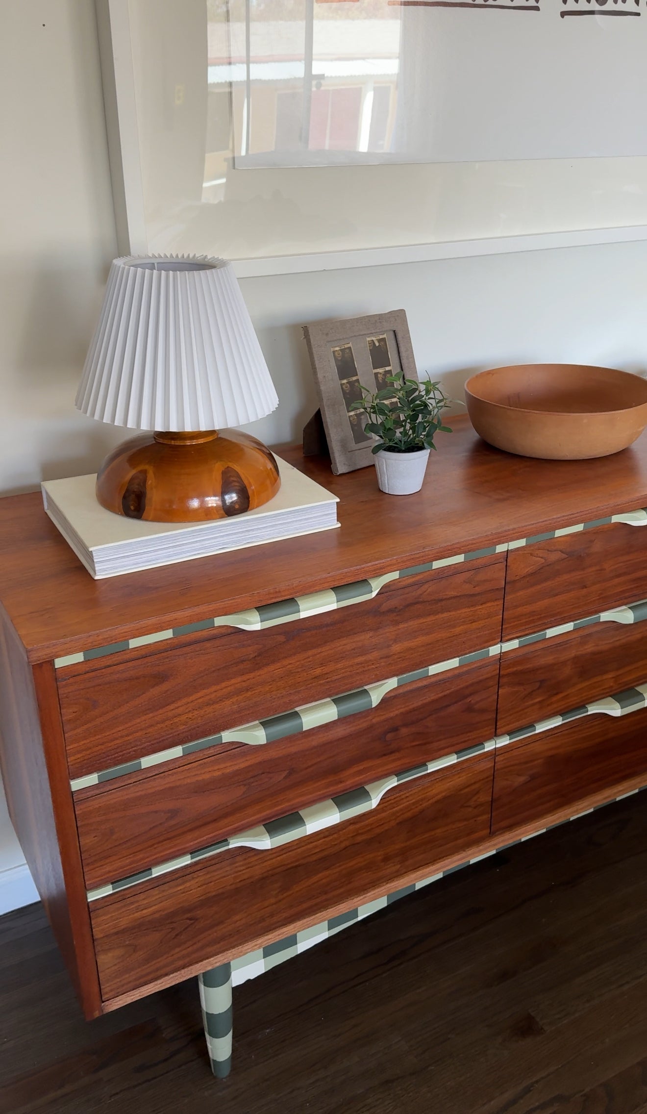 The Monday Dresser is a vintage, mid-century modern piece that boasts 9 spacious drawers for ample storage. Its natural wood construction provides a timeless appeal, while the charming green gingham detailing adds a touch of color and character.