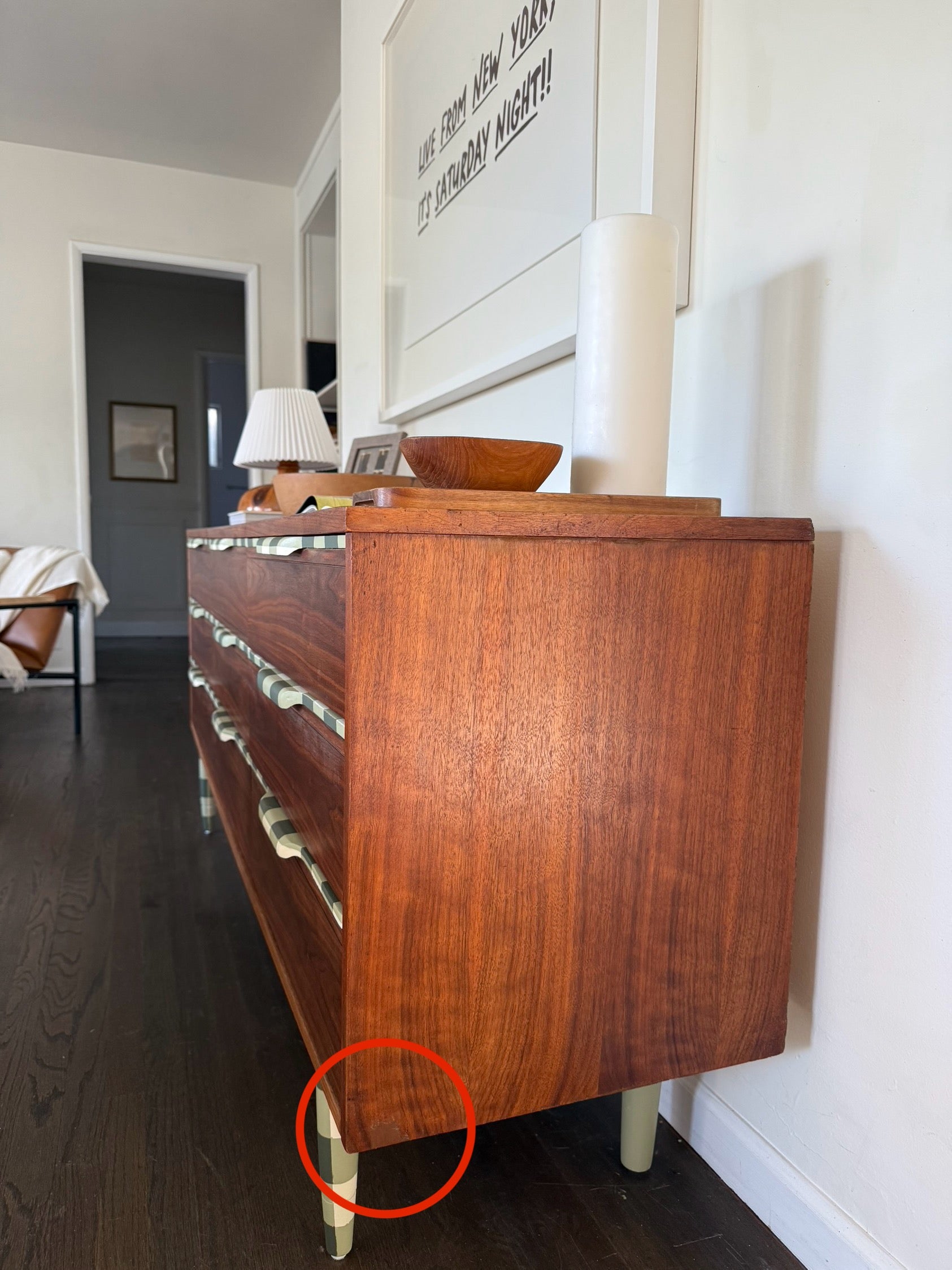 This piece was found in an ally, with only 2 legs and a broken/partially missing base. The back 2 legs have been replaced and the piece needs to be lifted in order to be moved- given that they are not as strong as the original. There was a little veneer chipping that was been color matched and is not obvious. Each piece of furniture is unique and rescued from ending up in a landfill, providing a stylish and sustainable addition to your home. Expertly crafted with a focus on reducing waste, Please be aware that these are not new, and have been loved and recycled!