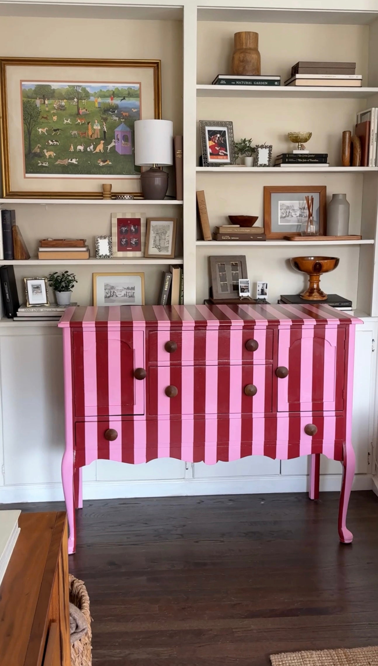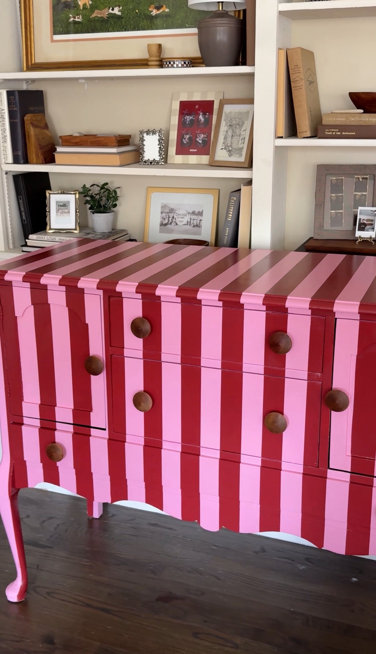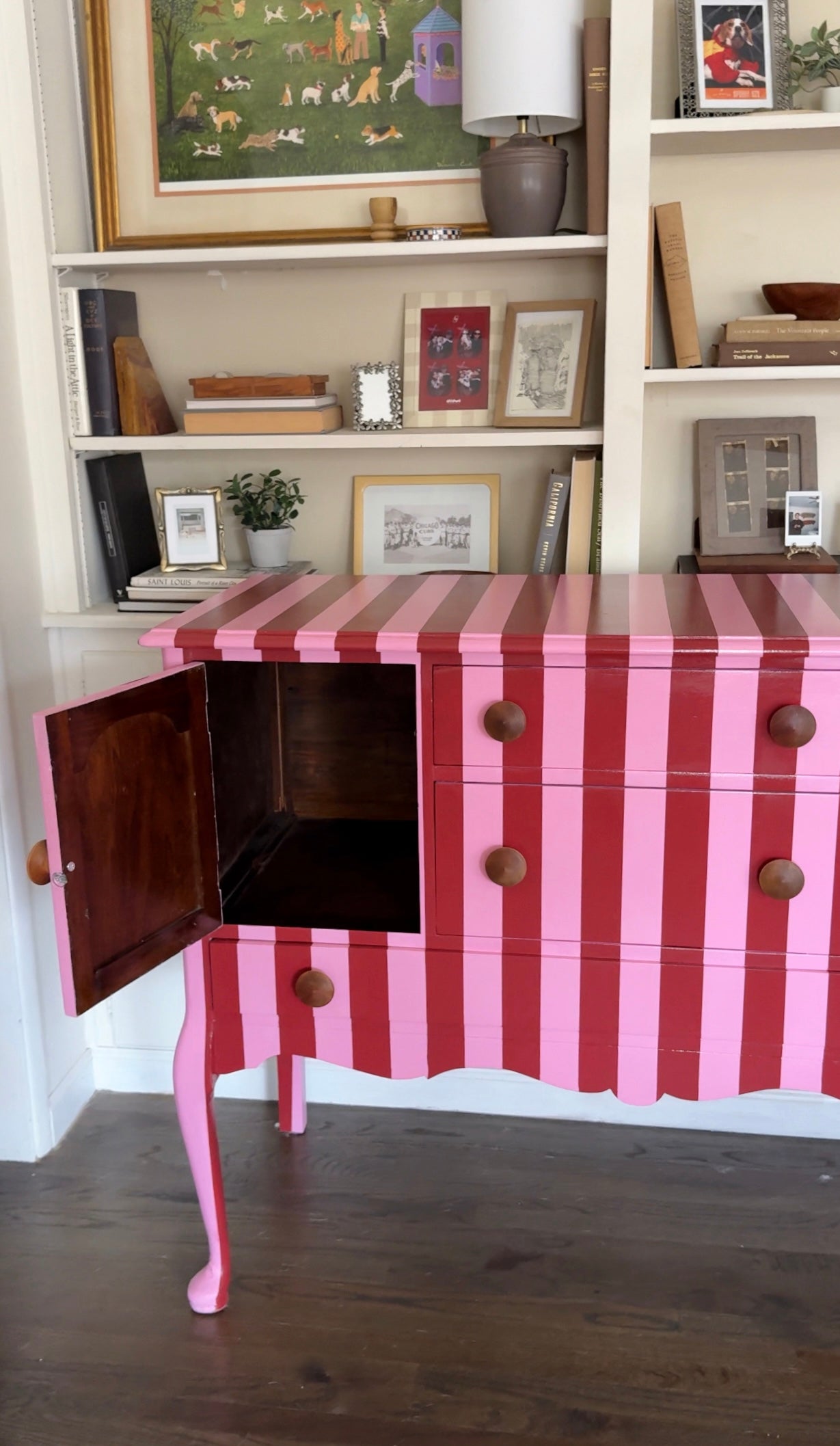 The Rumors Cabinet features 3 drawers and 2 doors made from solid wood. It stands on nicely shaped legs and is decorated with pink and maroon stripes. The large, chunky walnut knobs match the inside of the drawers, giving it a unique and natural look.