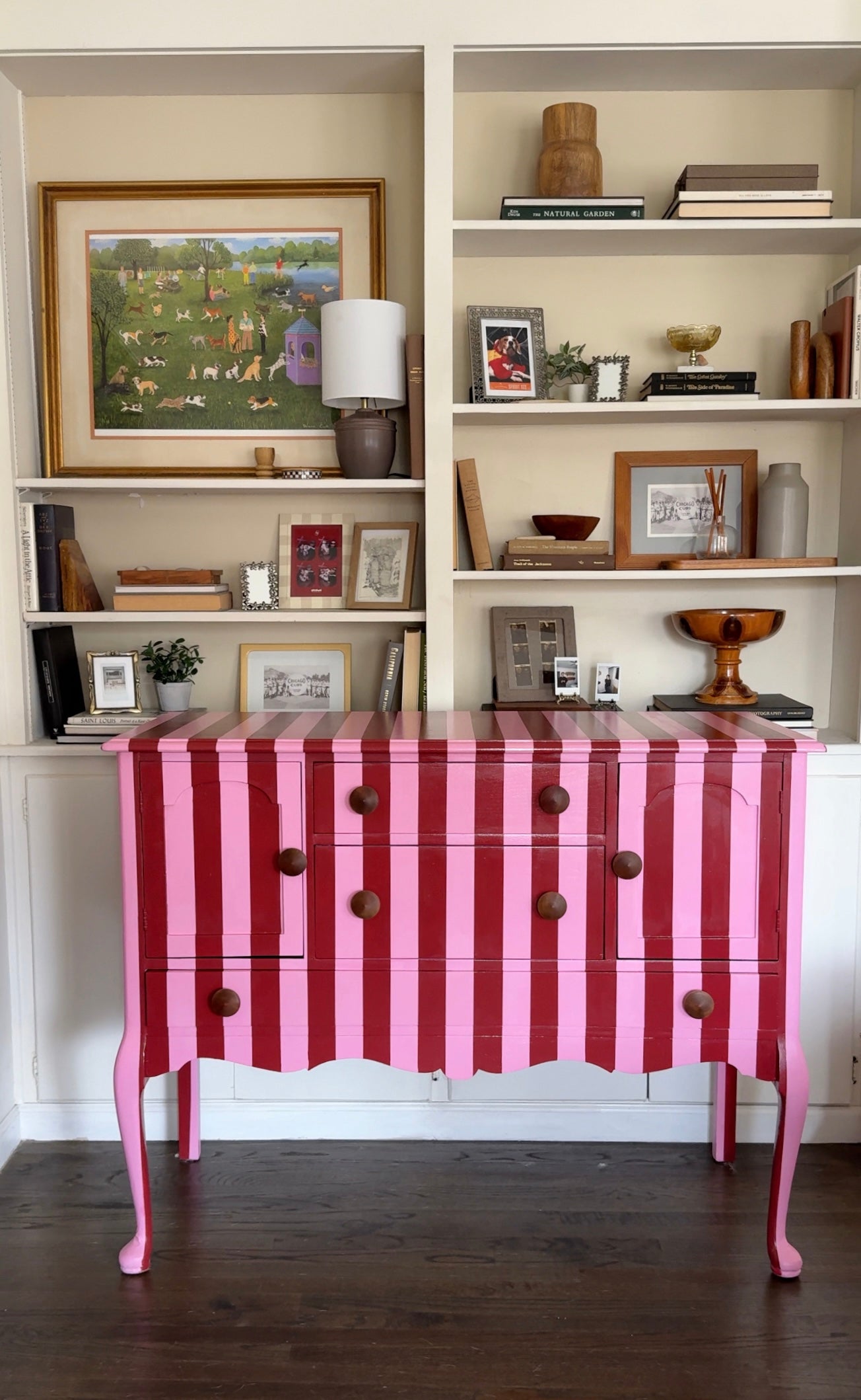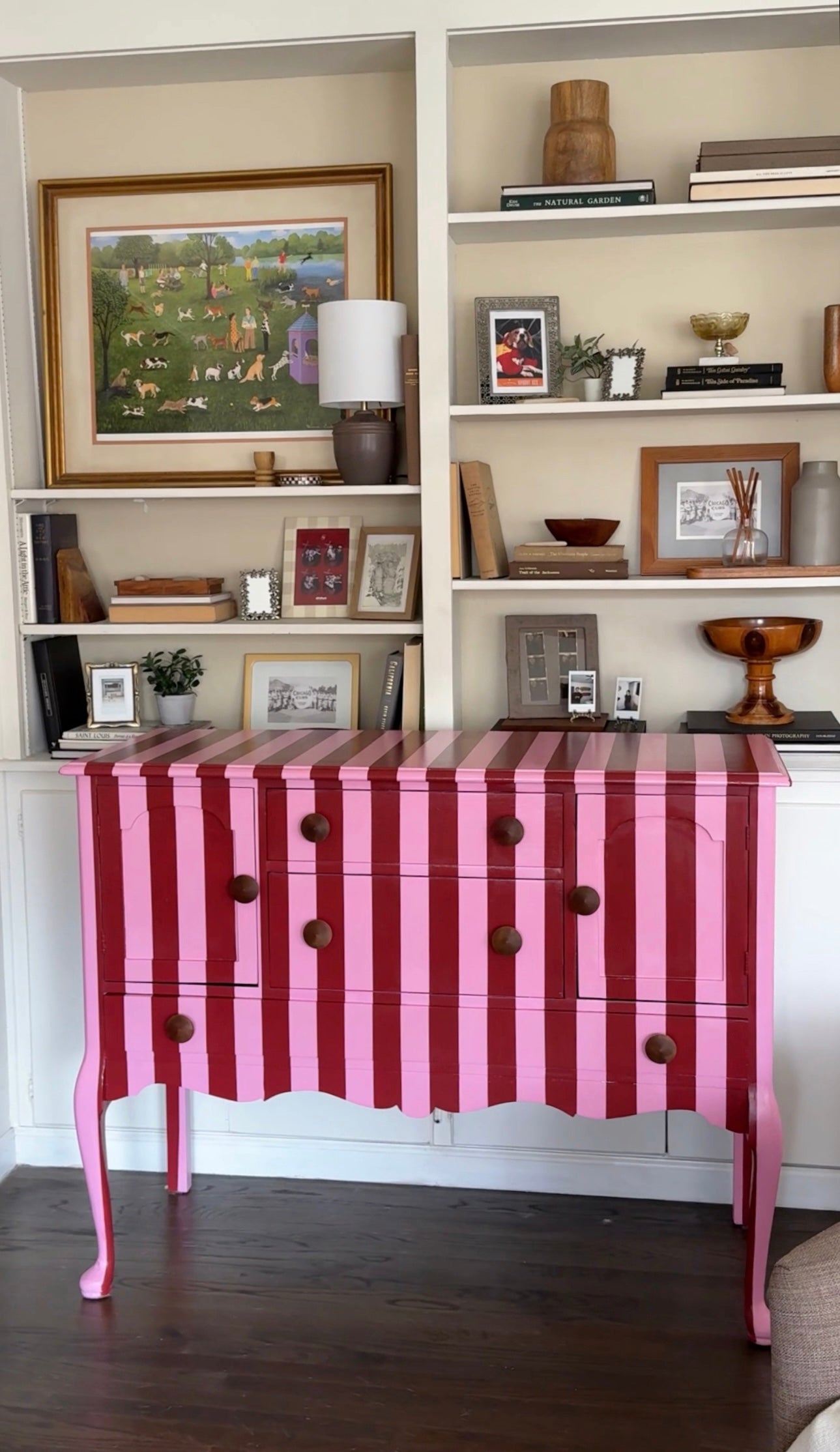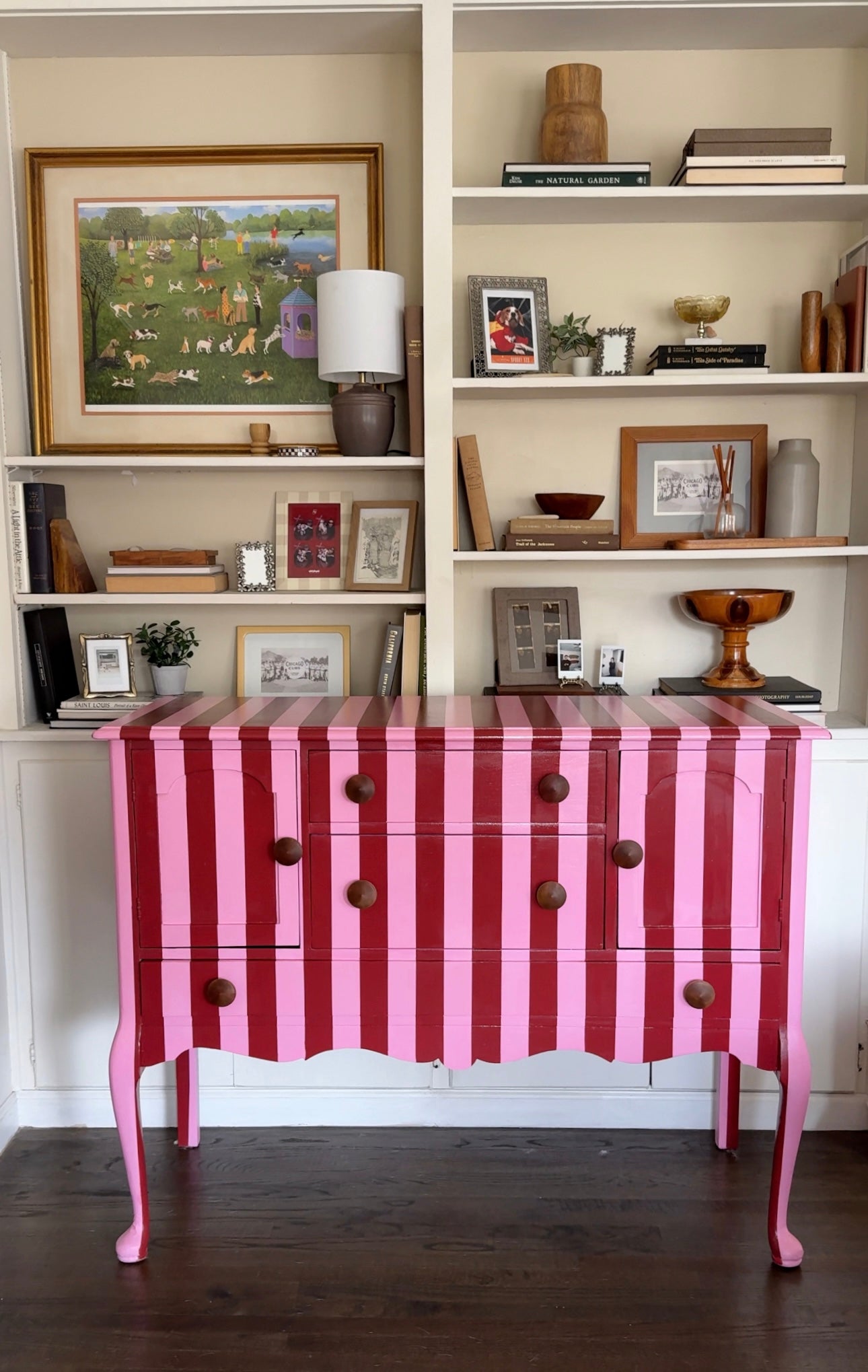 The Rumors Cabinet features 3 drawers and 2 doors made from solid wood. It stands on nicely shaped legs and is decorated with pink and maroon stripes. The large, chunky walnut knobs match the inside of the drawers, giving it a unique and natural look.